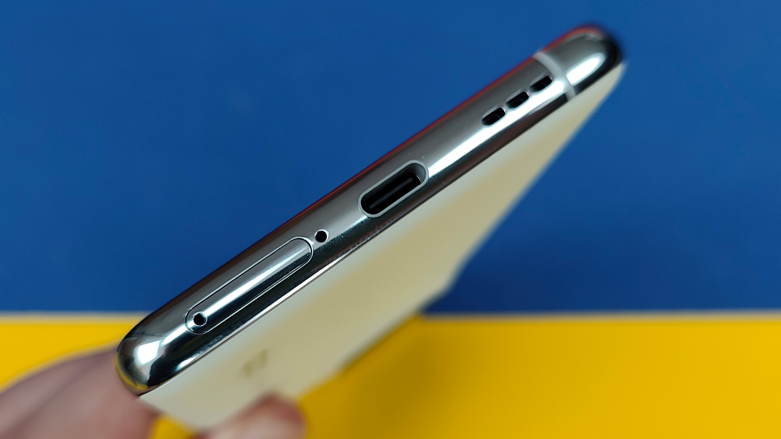 Die langen Kanten sind hinten wie vorne sanft geschwungen, durch das Curved-Design wirkt unser weißes Find X5 im Verbund mit dem chrom-glänzenden Metallrahmen sehr hochwertig. Dank der gebogenen Ränder ist seitlich kaum Rahmen zu sehen, nur oben und unten ist er etwas dicker. Insgesamt wirkt das Smartphone beinahe filigran und liegt auch gut in der Hand. Grund dürften die vergleichsweise geringen Ausmaße von 160 x 73 x 8,7 Millimeter bei einem satten, aber nicht zu hohen Gewicht von 196 Gramm sein. Das Gesamtpaket wirkt zusammen mit der hervorragenden Verarbeitung schlüssig. Leider fehlt eine höhere IP-Zertifizierung gegen Staub und Wasser, hier gibt es nur IP53. Immerhin ist (abgesehen vom Netzteil – Grüße an Samsung…!) eine durchsichtige Schutzhülle im Lieferumfang.
