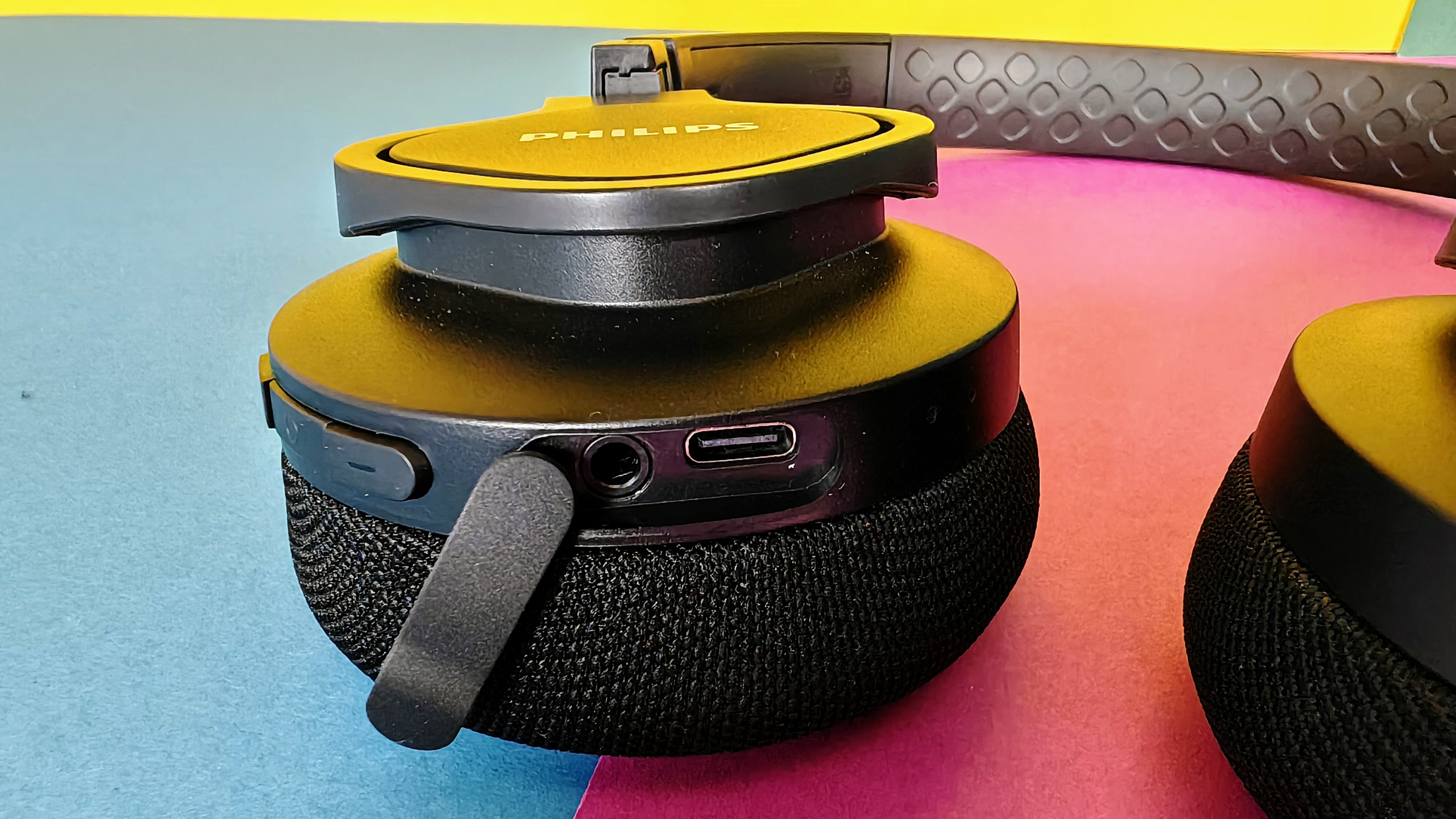 Der Philips TAA4216 unterstützt Bluetooth 5.0 und kann auch mit zwei Geräten gleichzeitig verbunden werden. Die Anschlüsse sind zusätzlich mit einer Gummiabdeckung verschlossen. Dahinter befindet sich der USB-C-Slot zum Aufladen sowie ein Klinkeneingang, falls man den Kopfhörer doch kabelgebunden mit einem Abspielgerät verbinden möchte. Active Noise Cancellation (ANC) gibt es beim TAA4216 nicht. Der abgedeckte Frequenzbereich liegt zwischen 20 Hz und 20 kHz, die Impedanz beträgt 32 Ω bei einer Empfindlichkeit von 118 dB. Etwas mager sieht es bei den unterstützten Codecs aus: Nur SBC ist enthalten.