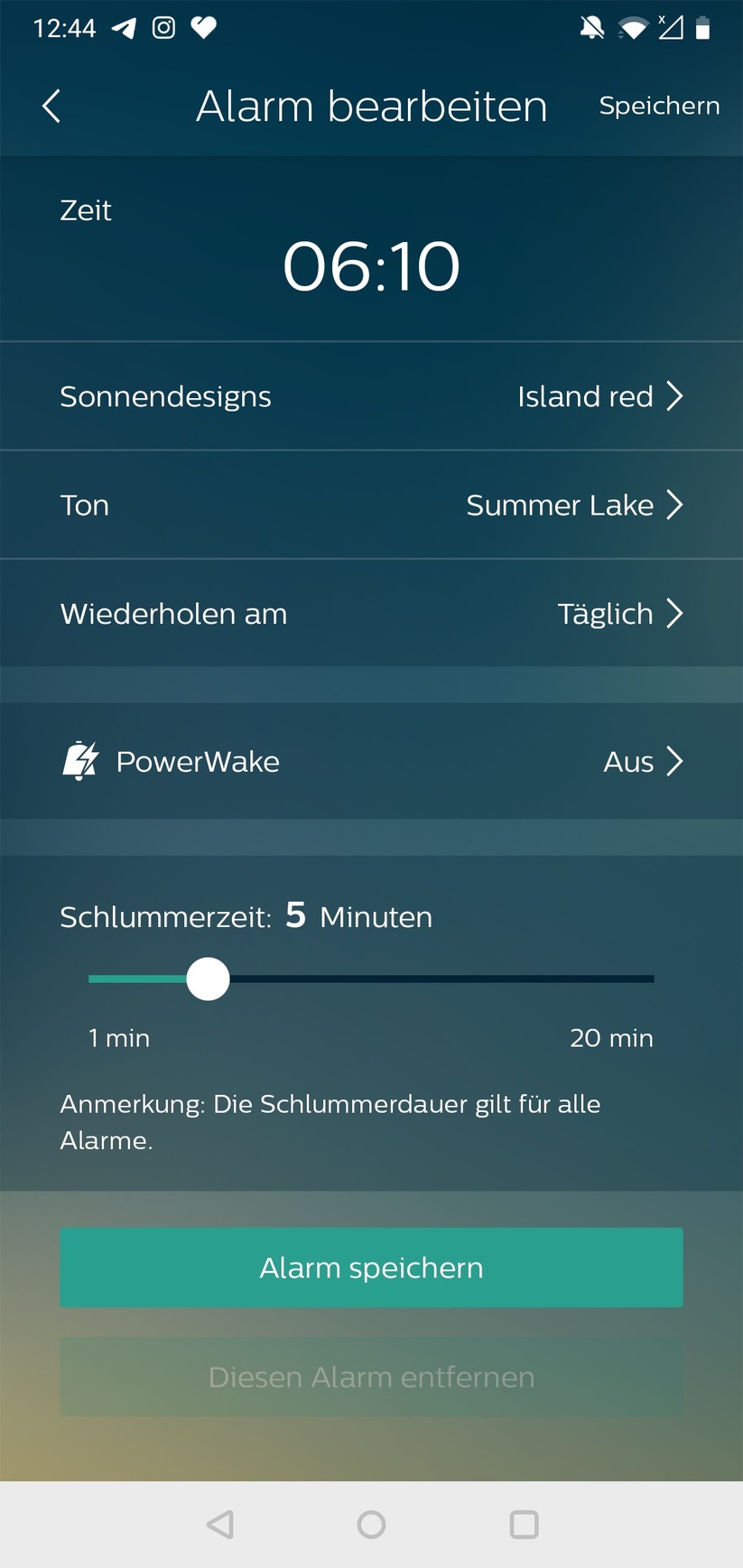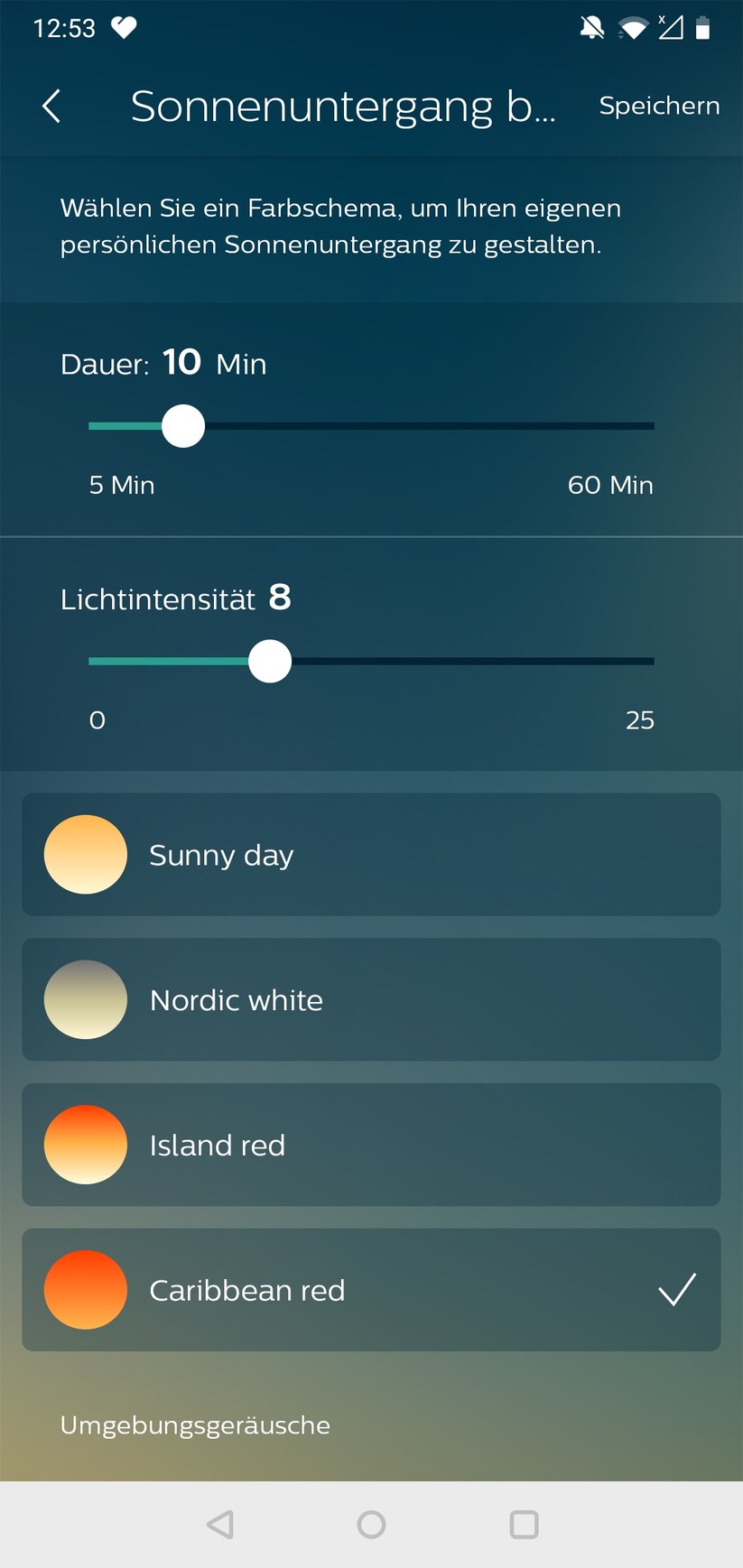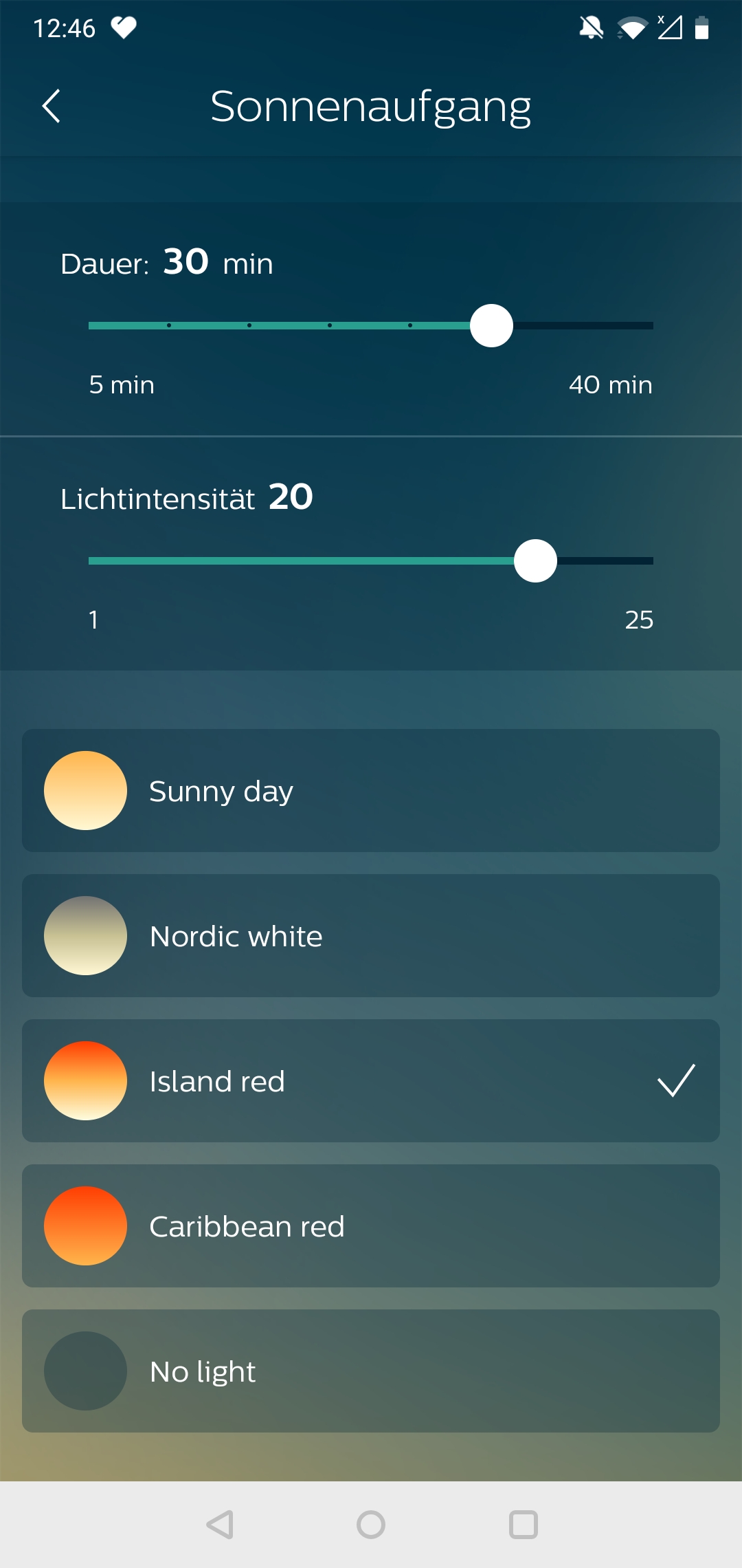 Zum besseren Einschlafen simuliert das Wakeup Light einen Sonnenuntergang. Auch hier wählt der Nutzer aus den vier Lichtstimmungen und fünf Einschlaftönen (Radiosender, Regen, Meeresrauschen, Unterwasser oder Frösche am See) aus. Lautstärke, Dauer und Lichtintensität lassen sich ebenfalls anpassen. Über die Zeit verschwinden Licht und Töne langsam. Im Test ist diese Option sehr positiv aufgefallen. Vor allem die Kombination aus rotem Licht (Caribbean red) und dem Klang von leichtem Regen ist sehr entspannend.