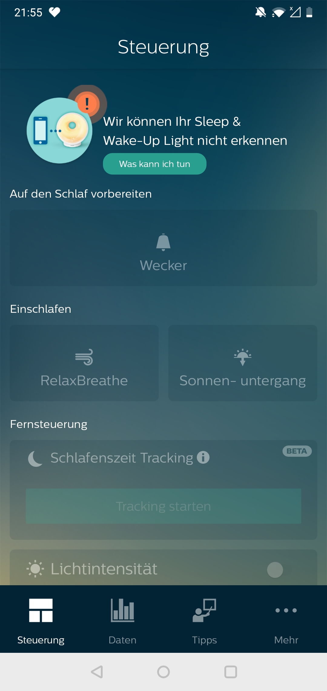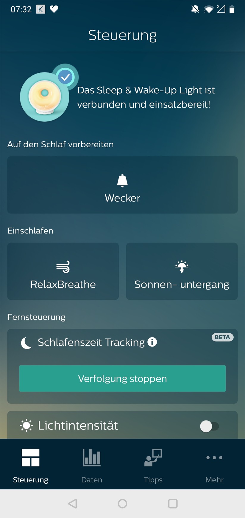 Die App sammelt außerdem Daten und zeigt sie an – allerdings nur, wenn man auch dem Senden aller Daten an Philips zustimmt. Das Gerät zeichnet aktuell immer die Schlafzimmertemperatur, die Luftfeuchtigkeit, die Lichtstärke und die Lautstärke auf. Genau sind die Messwerte allerdings nicht. Selbst wenn es mucksmäuschenstill ist und man sich selbst kaum atmen hört, zeigt die App einen zu lauten Geräuschpegel von etwa 50dB an (entspricht einer Straße mit wenig Verkehr). Unsere Kontrollmessgeräte zeigen an selber Stelle 19dB. Auch die Temperatur wird vom Gerät immer etwa drei Grad zu hoch angezeigt.