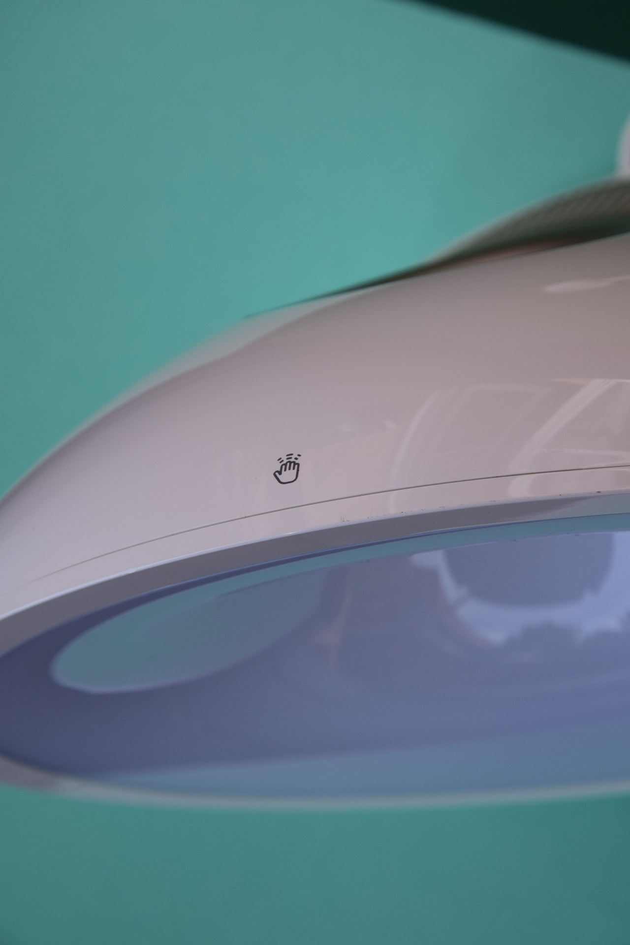 Das Wakeup Light von Philips kommt im futuristischen Design. Die kreisrunde Lampe mit Loch in der Mitte sitzt auf einem schmalen Stand, der durch fünf Gummifüße stabil auf dem Nachttisch steht. Die Lampe im weißen Gehäuse steht fest, neigen lässt sie sich nicht. Unter dem Loch in der Mitte befindet sich ein eingebautes Touchdisplay, sodass zum Beispiel der Wecker auch ohne Smartphone gestellt werden kann. Auf dem oberen Rahmen kann man per Touch das Licht ein- und ausschalten.
