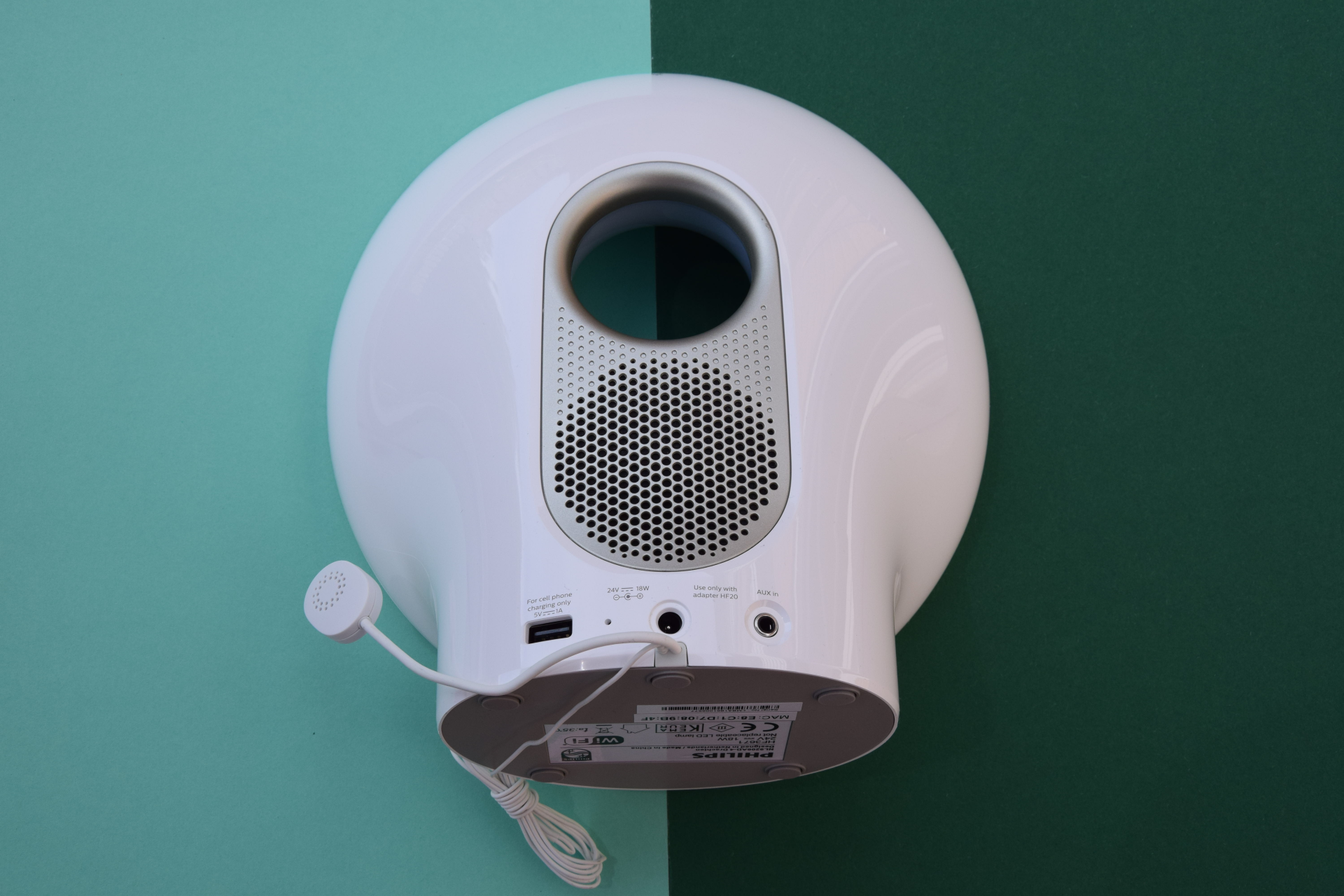 Auf der Rückseite befinden sich die Anschlüsse für Strom, USB zum Aufladen von Smartphone oder Tablet sowie ein AUX in. Zwei Kabel kommen ebenfalls aus der Rückseite. Eines ist die Antenne für den Radioempfang, das andere ist der Umgebungssensor, der Lautstärke, Luftfeuchtigkeit, Helligkeit und Temperatur aufzeichnet, um die aktuelle Schlafumgebung zu bewerten.