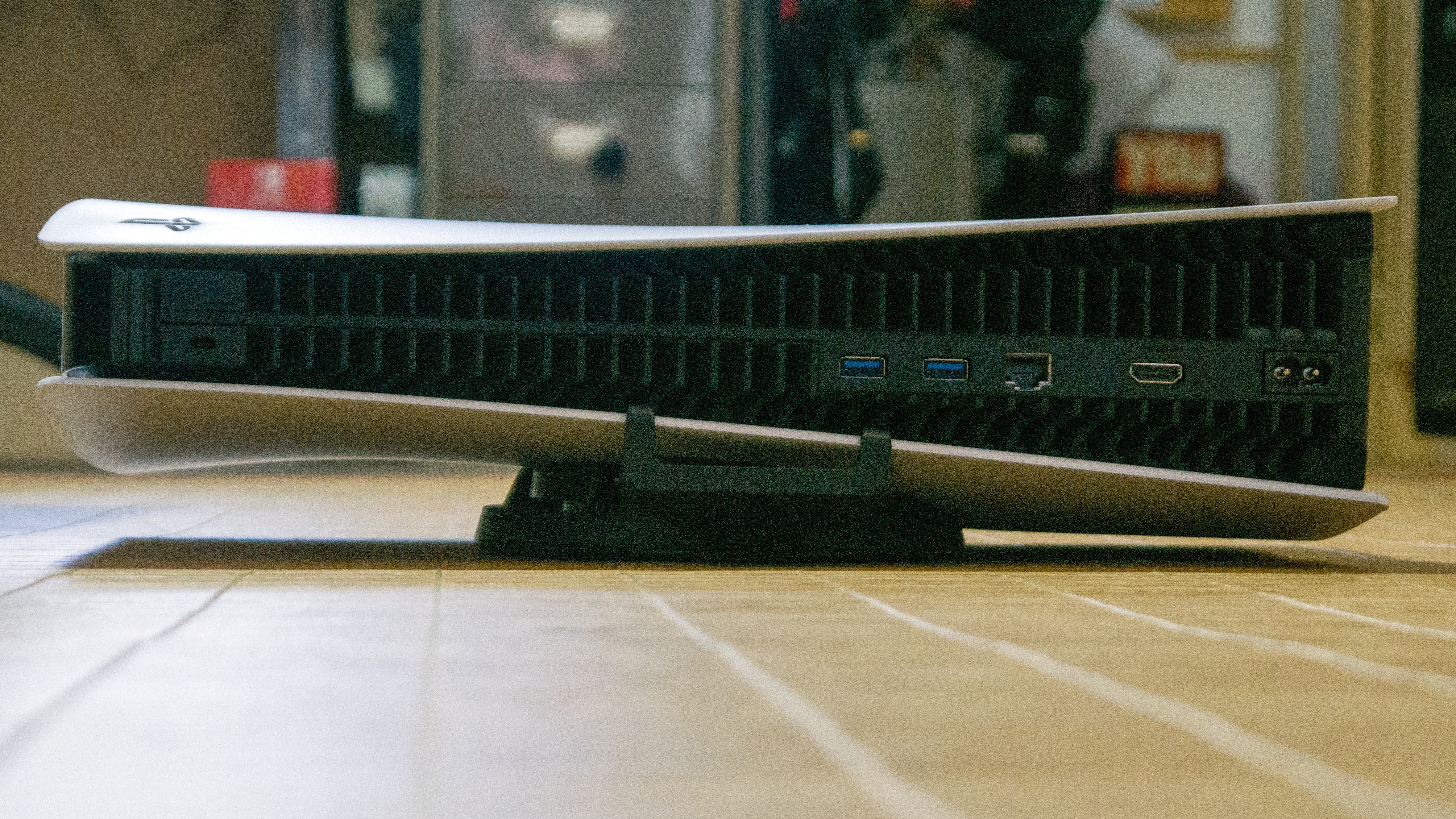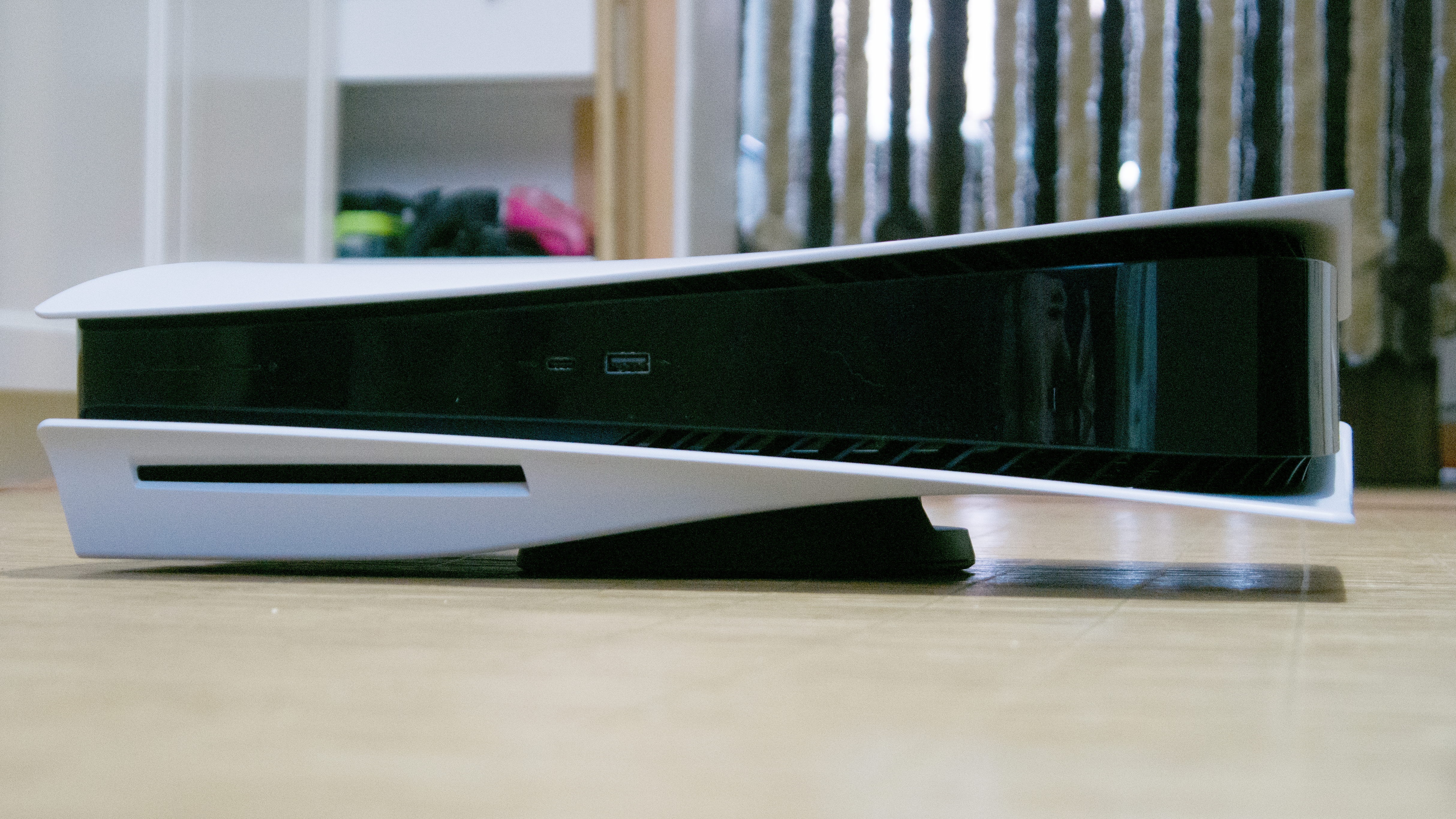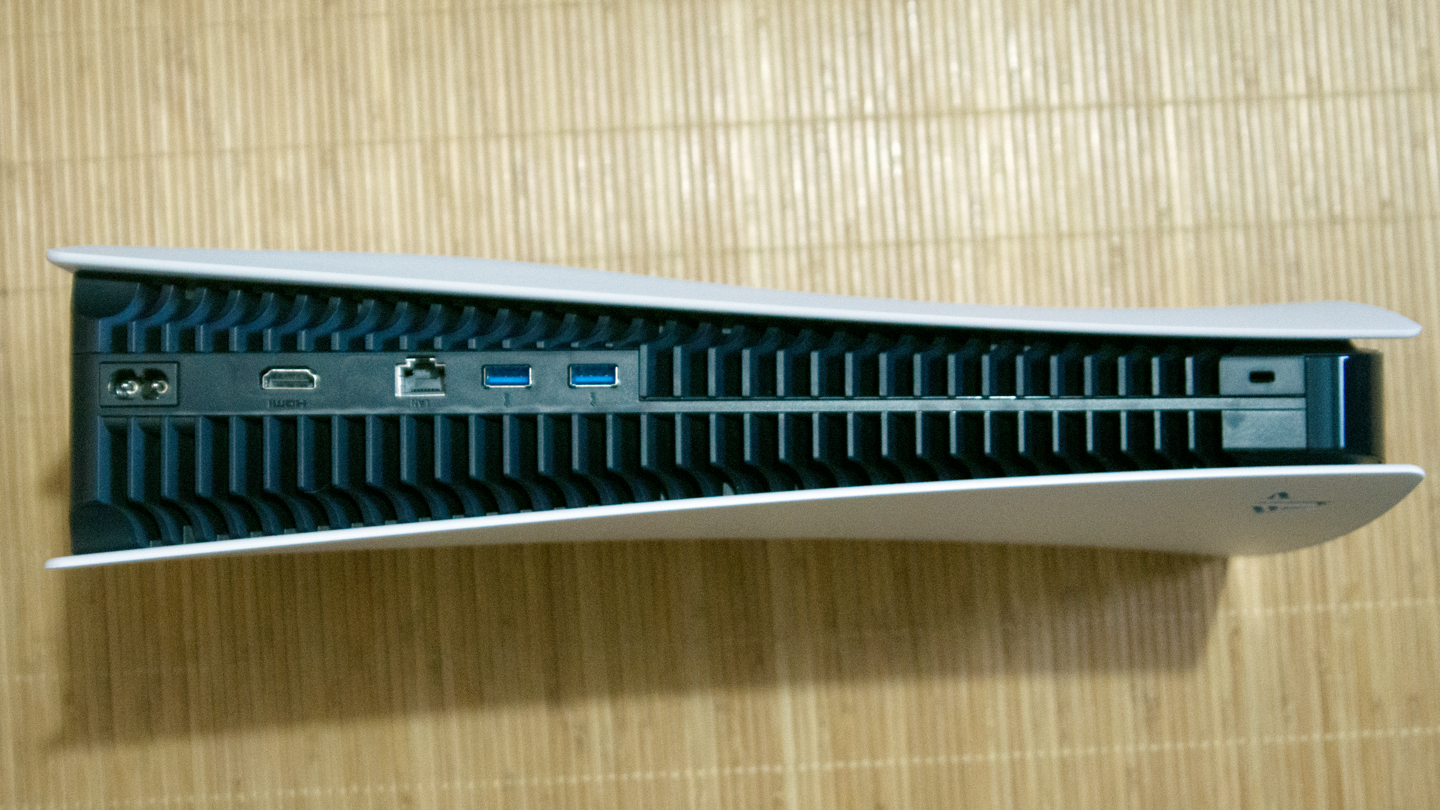 Die Verarbeitung ist sehr gut und wirkt insgesamt wertiger als bei der Playstation 4 in all ihren Revisionen. Beim Transport knarzt oder wackelt nichts, wobei uns die Flügel etwas Sorgen machen. Wer das Gerät dauerhaft an einer Stelle stehen hat, wird sich da nicht weiter Gedanken drüber machen, aber wer es ab und zu in der (sehr großen) Tasche woanders hintransportieren möchte, sollte aufpassen, dass sie nicht abbrechen. Die schwarze Kunststoff-Oberfläche ist glatt und geradezu ein Staubmagnet, und die Lüftungsschlitze sind so groß, dass man bei längerem Ausschalten über eine Staubabdeckung nachdenken sollte. Ein ähnliches Problem hat auch die Xbox Series X mit ihrem Luftdurchlass an der Oberseite.