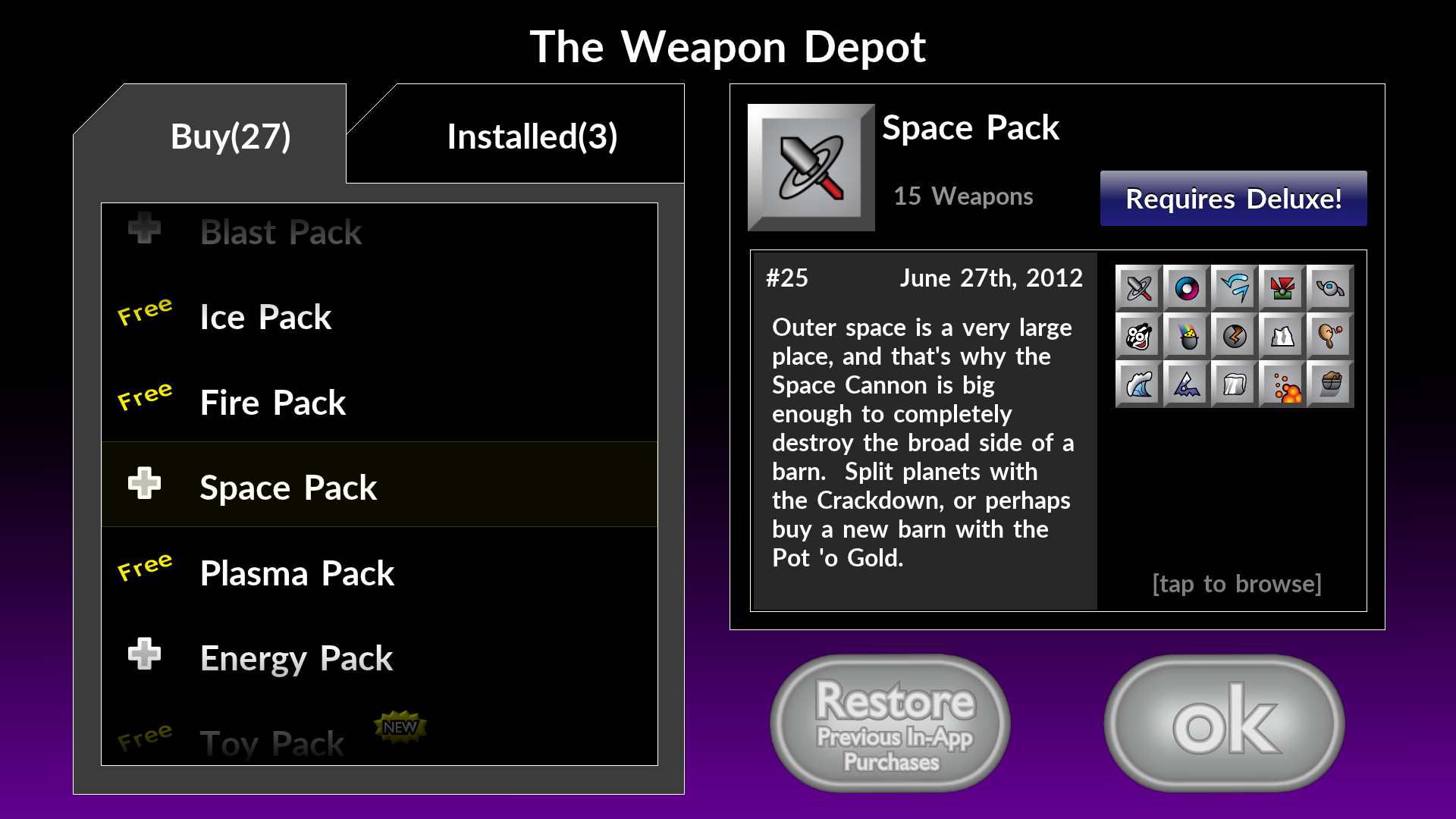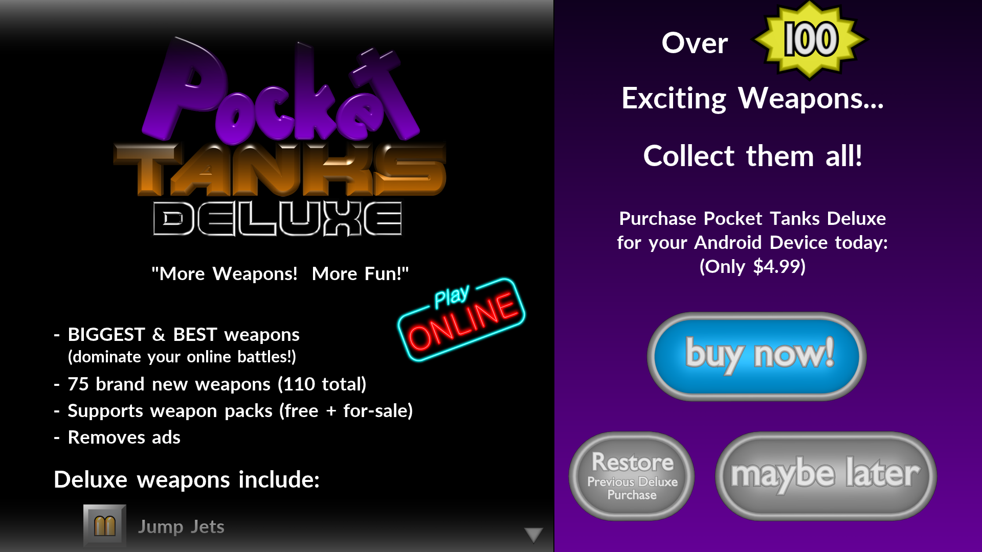 Pocket Tanks war schon am Computer für die Vielzahl von richtig kranken Waffen bekannt, die die komischsten Auswirkungen entfalten. Am Smartphone – das Game gibt es für Android, iOS und Windows Phone – nutzt der Entwickler dies zur Monetisierung. Die kostenlos herunterladbare Version bringt vierzig Klassiker mit, zusätzliche Erweiterungen lassen sich erst nach dem Kauf der mit hundertzehn Waffen ausgestatteten Deluxe-Variante freischalten. Rechnet damit, dass Euch das Freischalten aller dreihundert Waffen ungefähr fünfzehn Euro kostet.