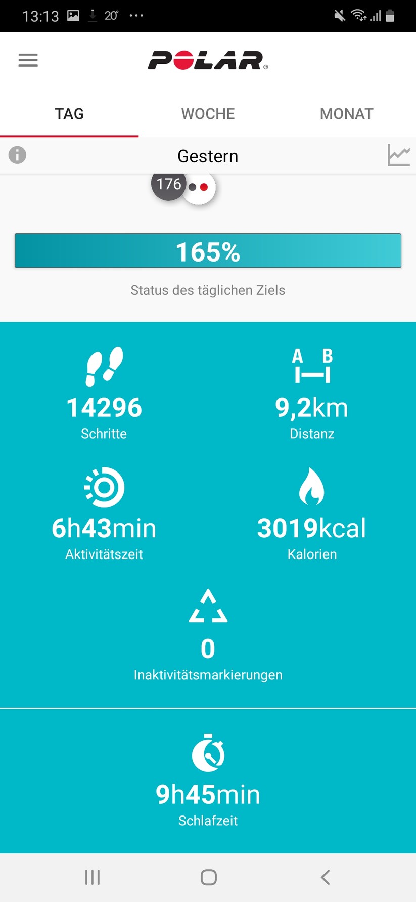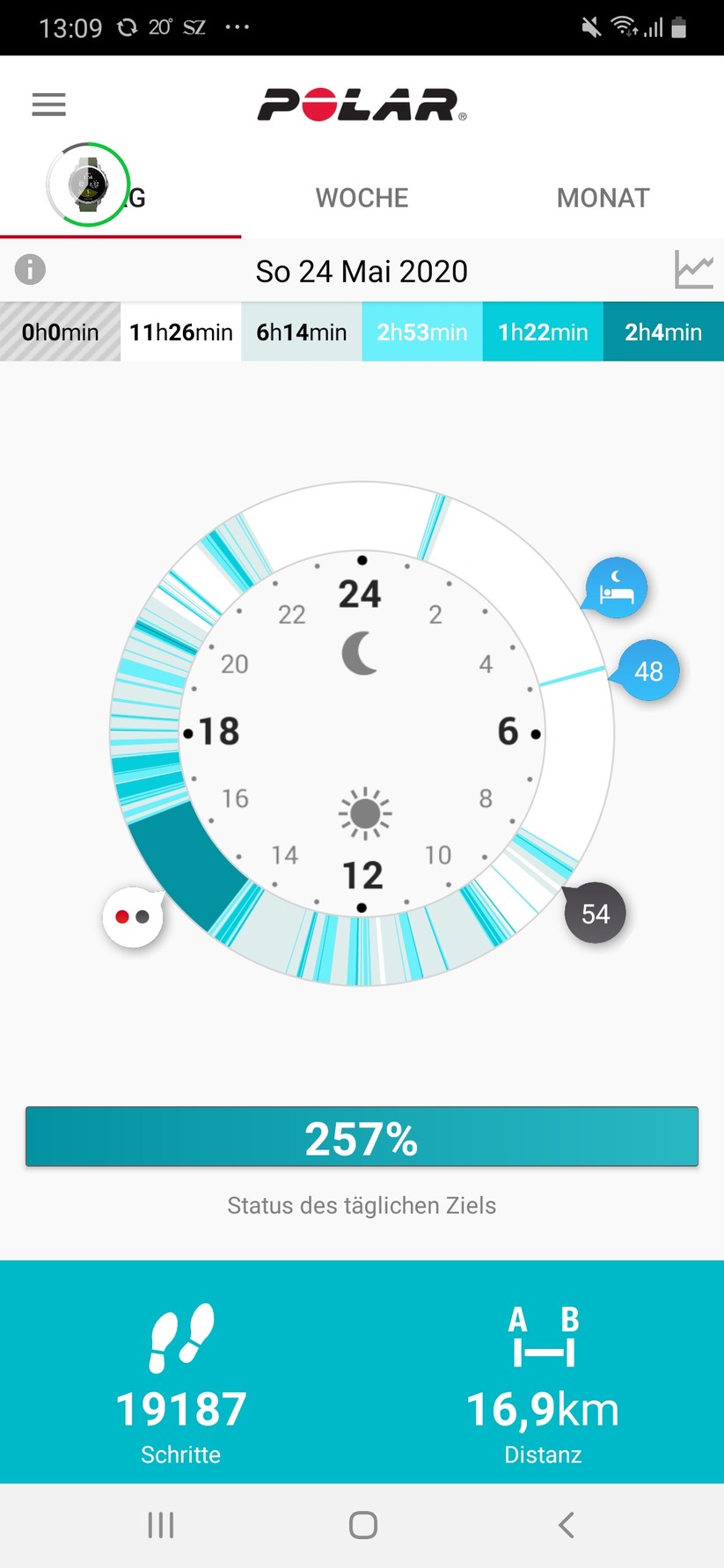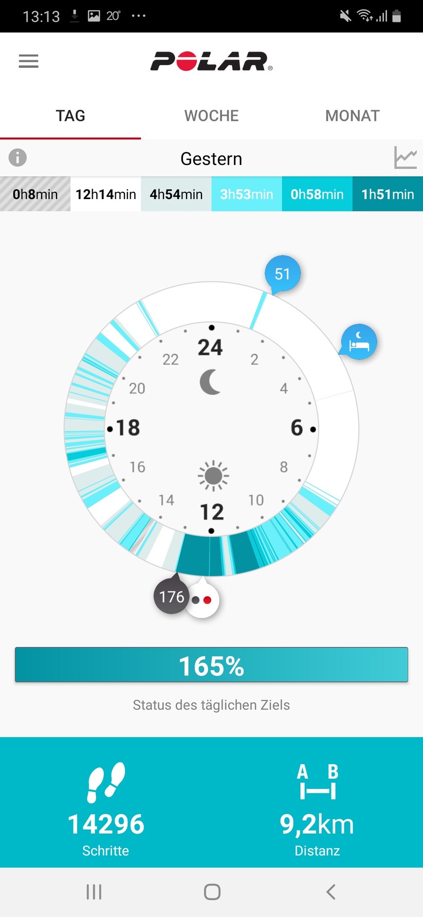 Je nachdem, wie viel wir uns den Tag über bewegen, füllt sich eine Prozentleiste in der App, die angibt, ob wir das gewählte Aktivitätsniveau bereits erreicht haben. Klicken wir auf die Leiste, zeigt uns die App drei Möglichkeiten an, wie wir das tägliche Ziel erreichen können, zum Beispiel mit 11 Minuten Football, 38 Minuten Tischtennis oder 54 Minuten Gartenarbeit.