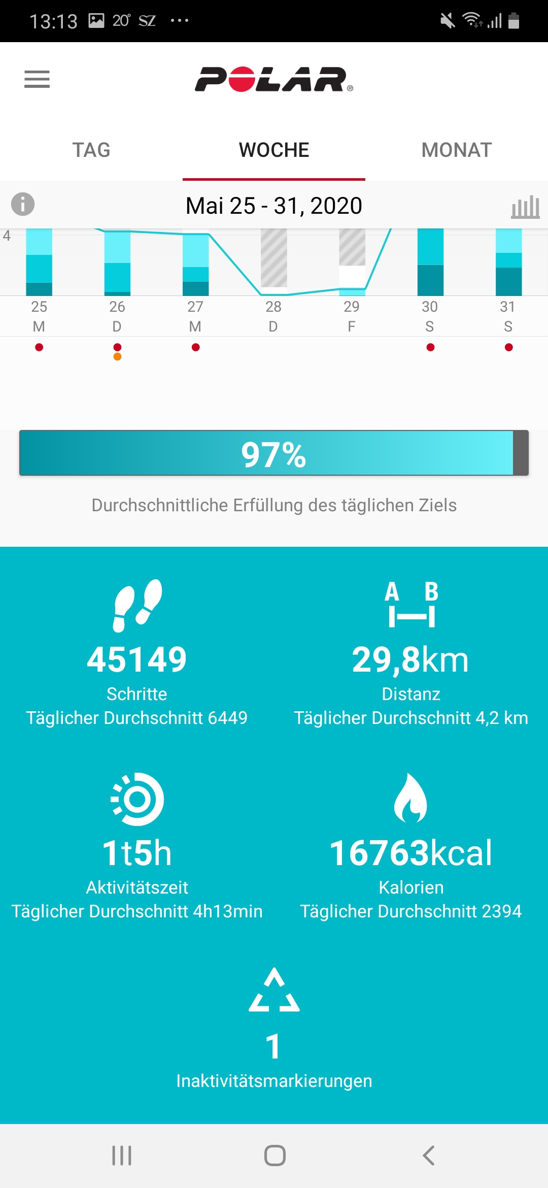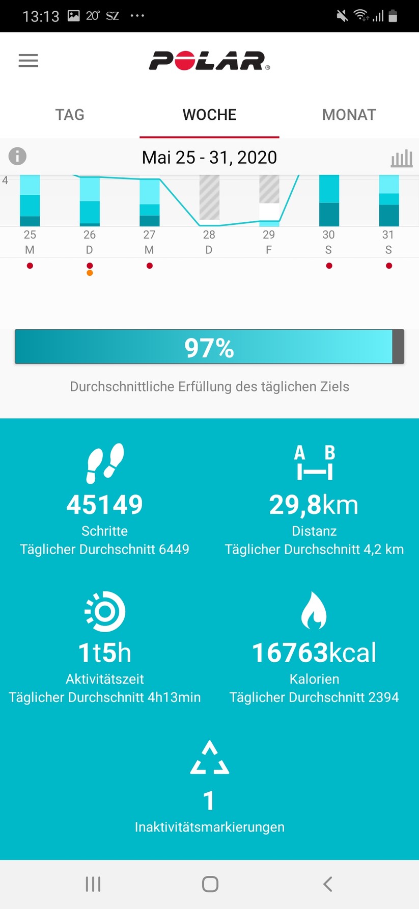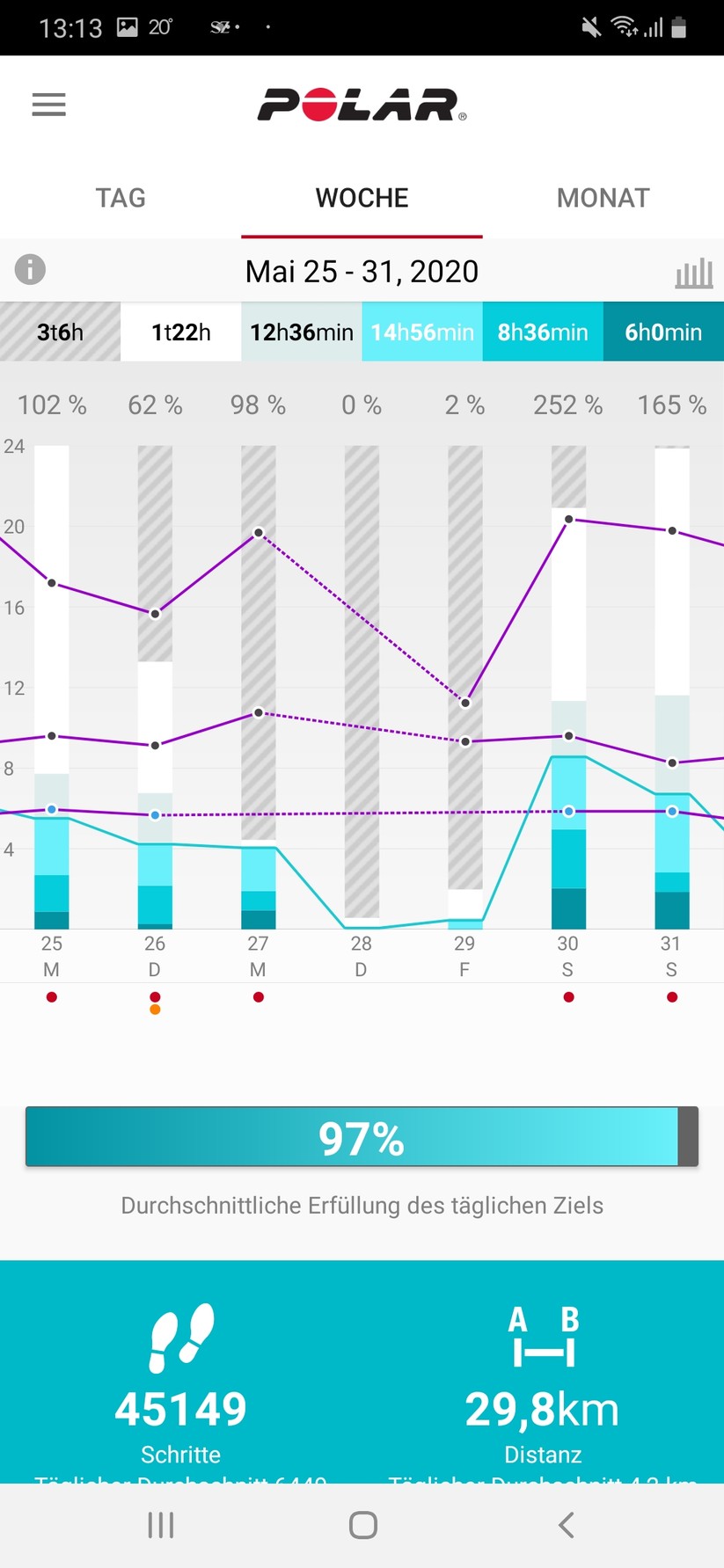 Je nachdem, wie viel wir uns den Tag über bewegen, füllt sich eine Prozentleiste in der App, die angibt, ob wir das gewählte Aktivitätsniveau bereits erreicht haben. Klicken wir auf die Leiste, zeigt uns die App drei Möglichkeiten an, wie wir das tägliche Ziel erreichen können, zum Beispiel mit 11 Minuten Football, 38 Minuten Tischtennis oder 54 Minuten Gartenarbeit.