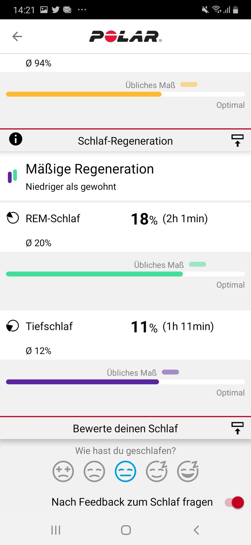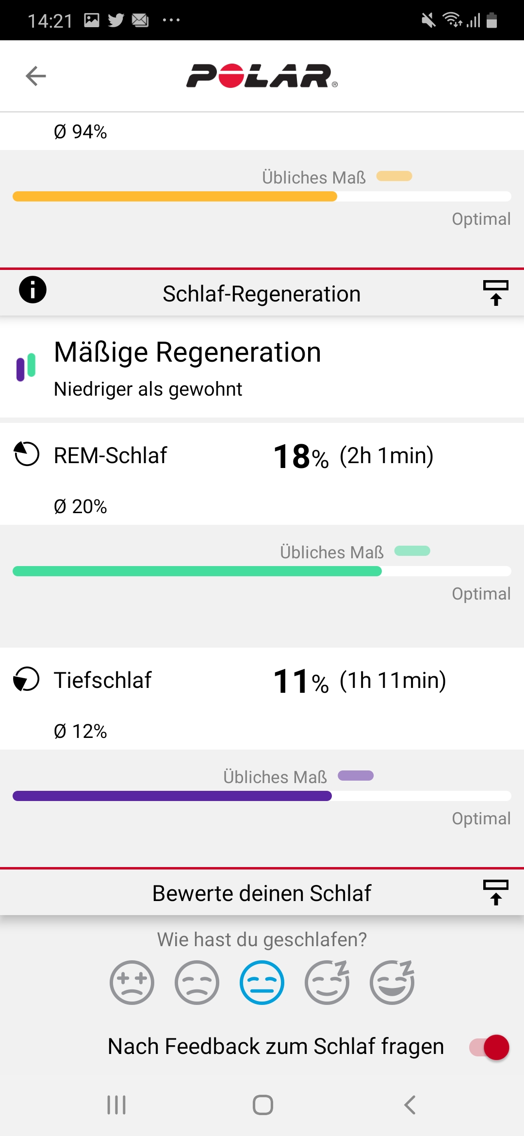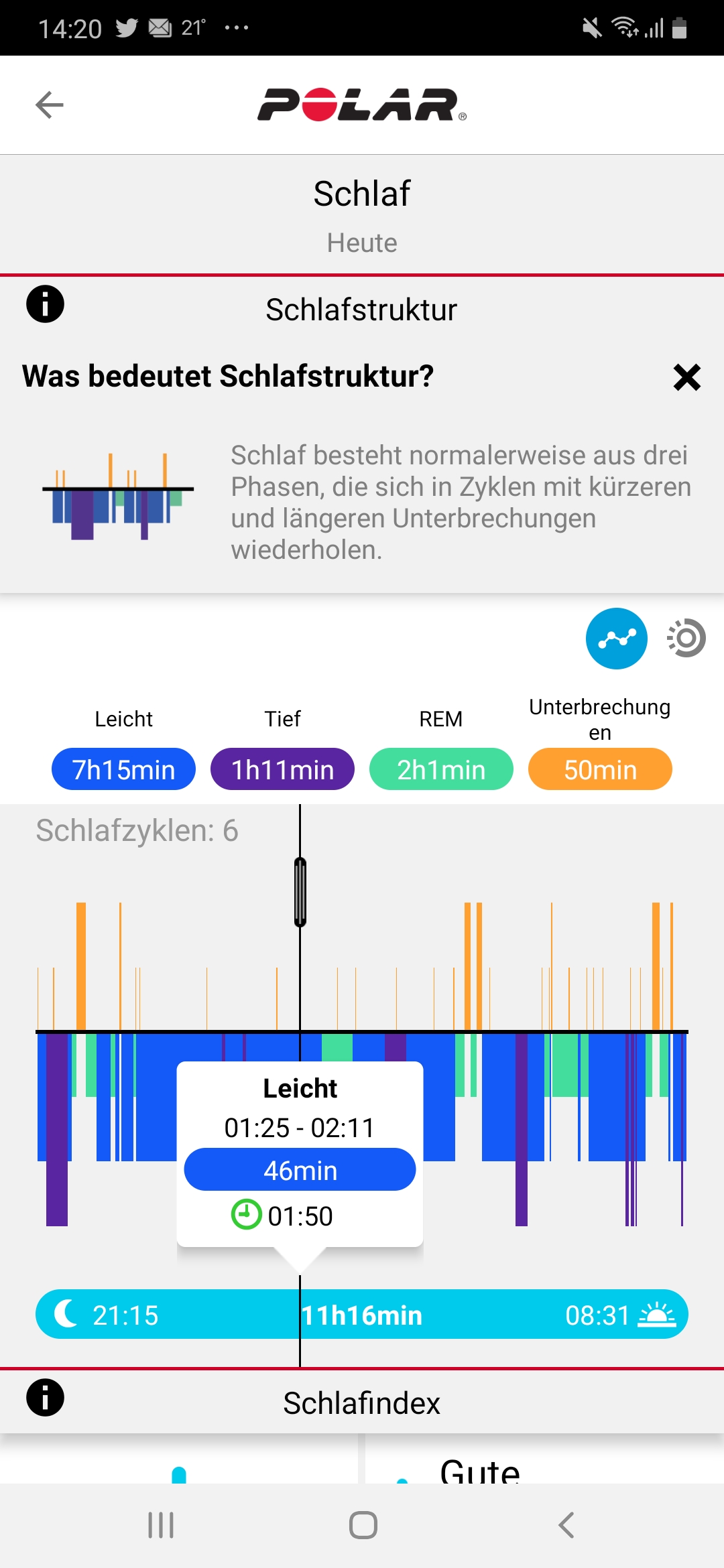 Ergänzend dazu liefert die App, eine Übersicht und Bewertung der Schlafanalyse anhand des Schlafindex und vergleicht diese mit den Durchschnittswerten voriger Nächte. Nutzer können außerdem eine eigene Bewertung der Schlafqualität vornehmen, die allerdings keine Auswirkung auf die angezeigte Schlafbewertung besitzt.
