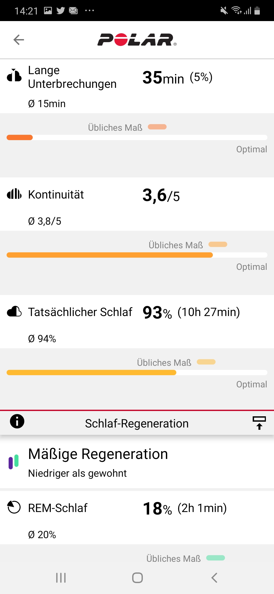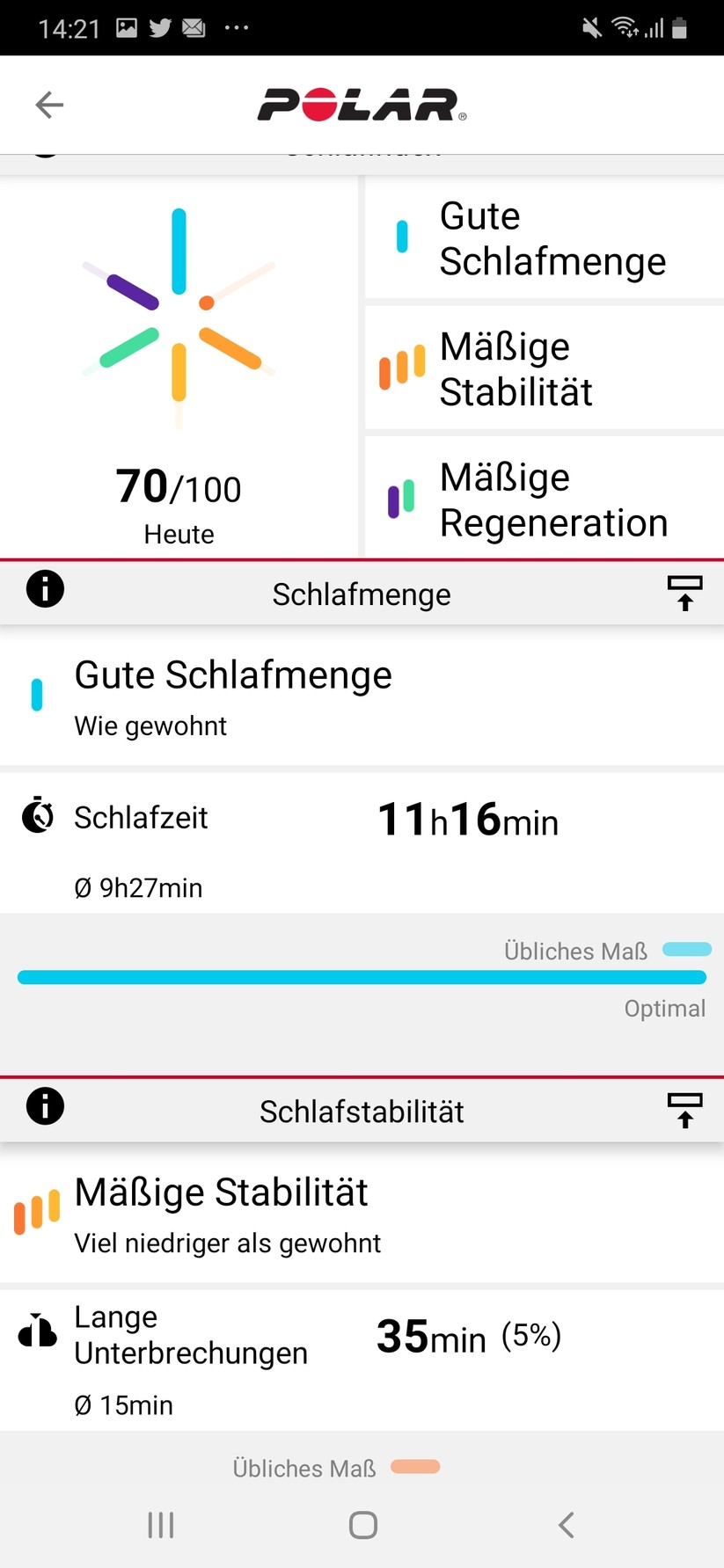 Damit die Grit X den Schlaf bewerten und vergleichen kann, müssen wir zunächst eine gewünschte Schlafzeit in der Polar Flow App einstellen und die Uhr drei Nächte lang beim Schlafen tragen. Sie erlaubt dann über die Anzeige „Nightly Recharge“ eine Übersicht der Schlafdetails und zeigt Schlafdauer, Kontinuität, Unterbrechungen, Schlafzyklen und Schlafphasen an.