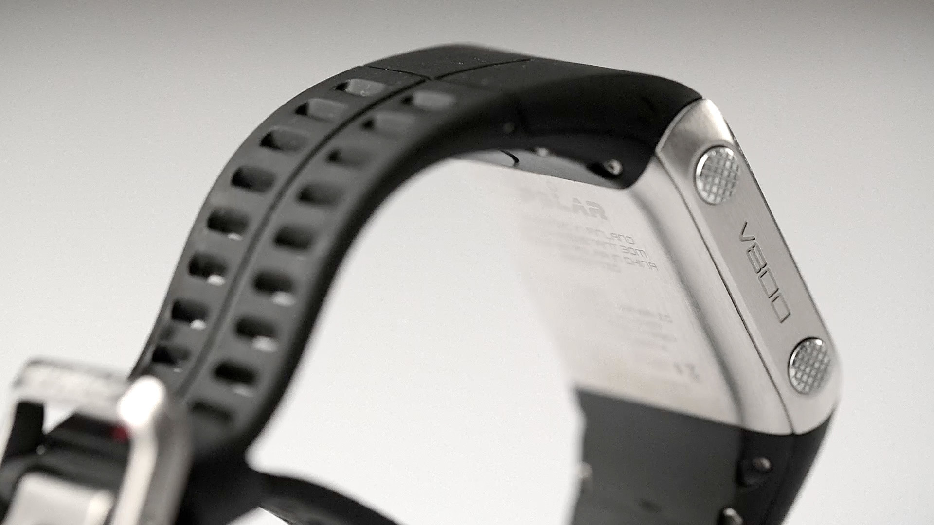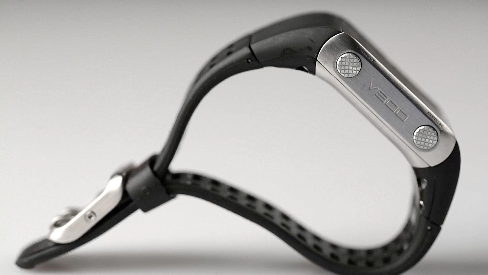 Die Bedienung der V800 läuft über insgesamt fünf Tasten am Gehäuse – und zwar ausschließlich. Einen Touchscreen gibt es nämlich nicht. Rechts am Gehäuse gibt es drei Buttons: Mit den Hoch- und Runter-Knöpfen navigiert der Nutzer durch Menüs und Listen, die Start-Taste dient zum Bestätigen – und zum Starten von Workouts sowie zum Markieren von Runden. Auf der linken Seite gibt es noch einen Zurückknopf und einen Button zum Einschalten der Hintergrundbeleuchtung.