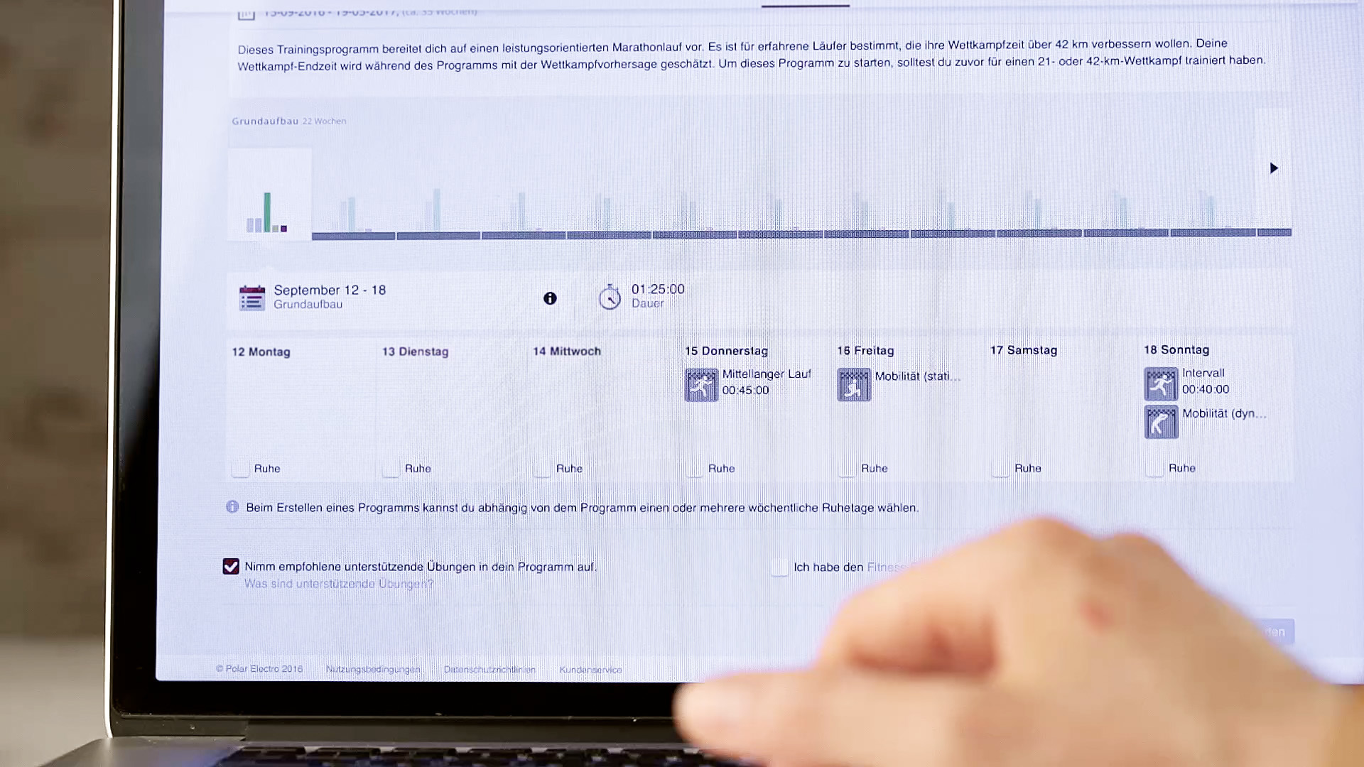 Unter Status zeigt die V800 die Trainingsbelastung des Nutzers an – und ob dieser bereit ist, sich in die nächste Trainingseinheit zu stürzen. In die Berechnung fließen Alter, Geschlecht, VO2max-Wert, die Trainingshistorie und natürlich die Intensität des letzten Workouts ein, wobei hier die Dauer und der Puls eine wichtige Rolle spielen.