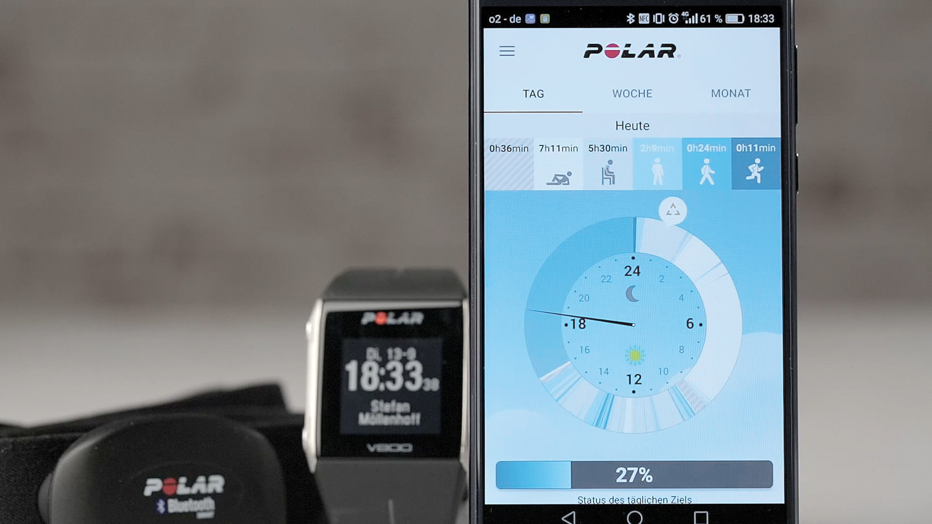 Die Smartphone-App namens Polar Flow funktioniert einfach und zuverlässig. Auf dem Startbildschirm erhält der Nutzer einen Überblick über den aktuellen Tagesfortschritt – von den getätigten Schritten, der noch zum Erreichen des Tagesziels fehlenden Aktivität bis hin zur Schlafqualität. Per Fingerwisch lässt sich dann in der Zeit zurückblättern, alternativ gibt es auch eine Wochen- und eine Monatsansicht.