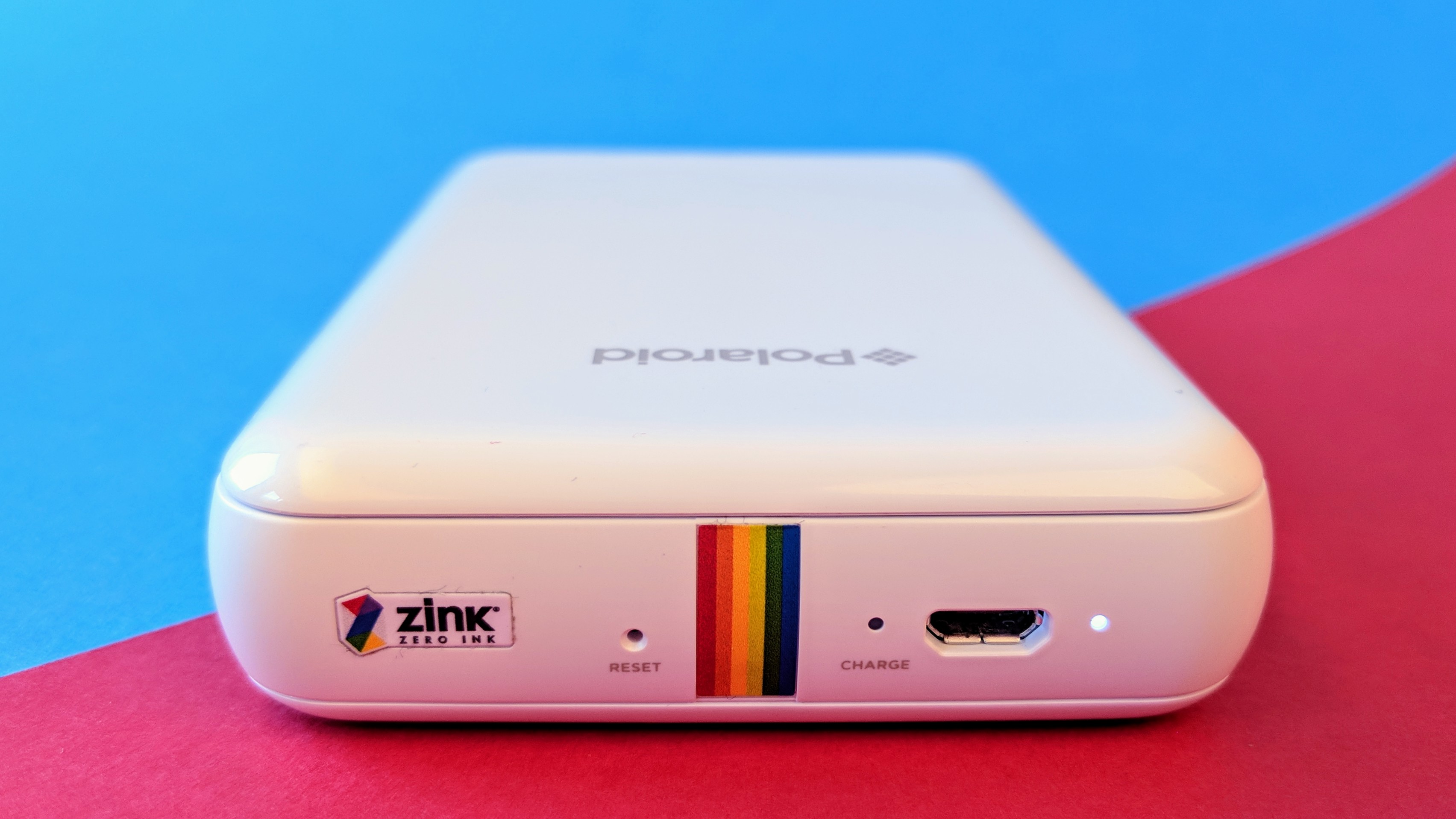 Auf der Rückseite befindet sich neben dem Micro-USB-Anschluss eine kleine Status-LED, eine Lade-LED und ein Reset-Button. Wir hätten uns die Status-LED auf der Vorderseite gewünscht. So muss das Gerät immer umgedreht werden, wenn der Nutzer sehen will, ob es noch eingeschaltet ist. Beim HP Sprocket Plus (Testbericht) und beim Fujifilm Instax Share SP-3 (Testbericht) wurde das besser gelöst.