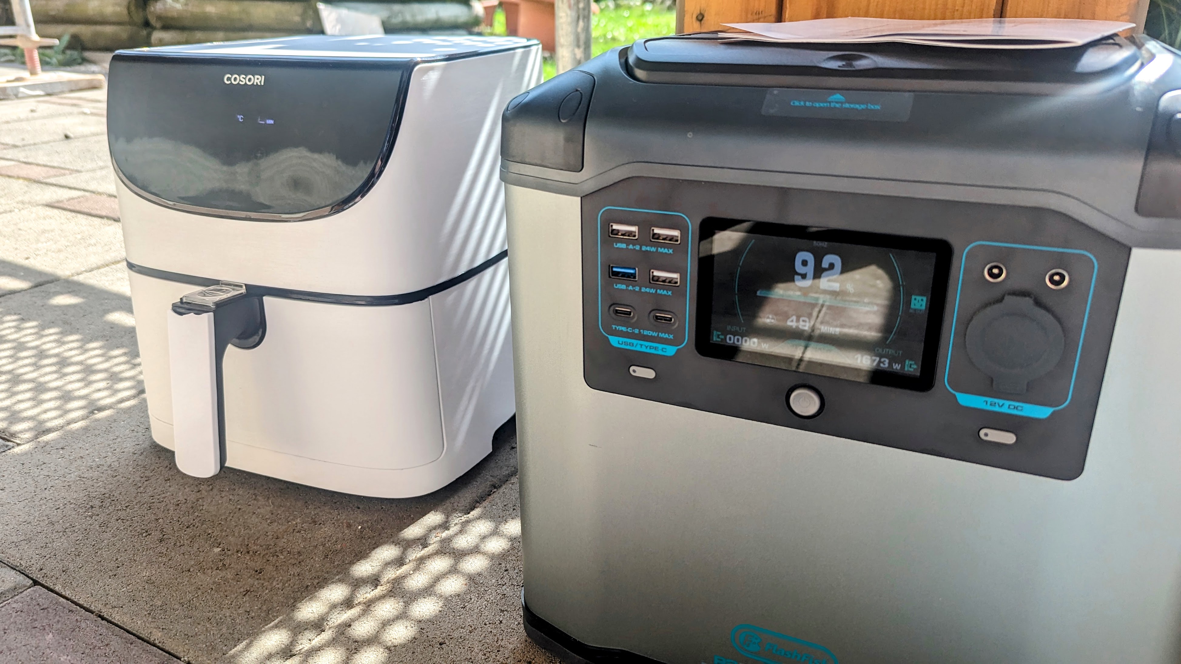 Die Mischlast erreichen wir durch den Einsatz verschiedener Verbraucher nacheinander. Konkret nutzen wir einen Wasserkocher, eine Heißluftfritteuse, unseren Staubsauger und einen Gaming-PCs auf dem ein Benchmarktest läuft. Hier liegen wir erwartungsgemäß im Effizienz-Mittelfeld und haben am Ende 1239 Wh auf dem Messgerät stehen. Das entspricht 79 Prozent.