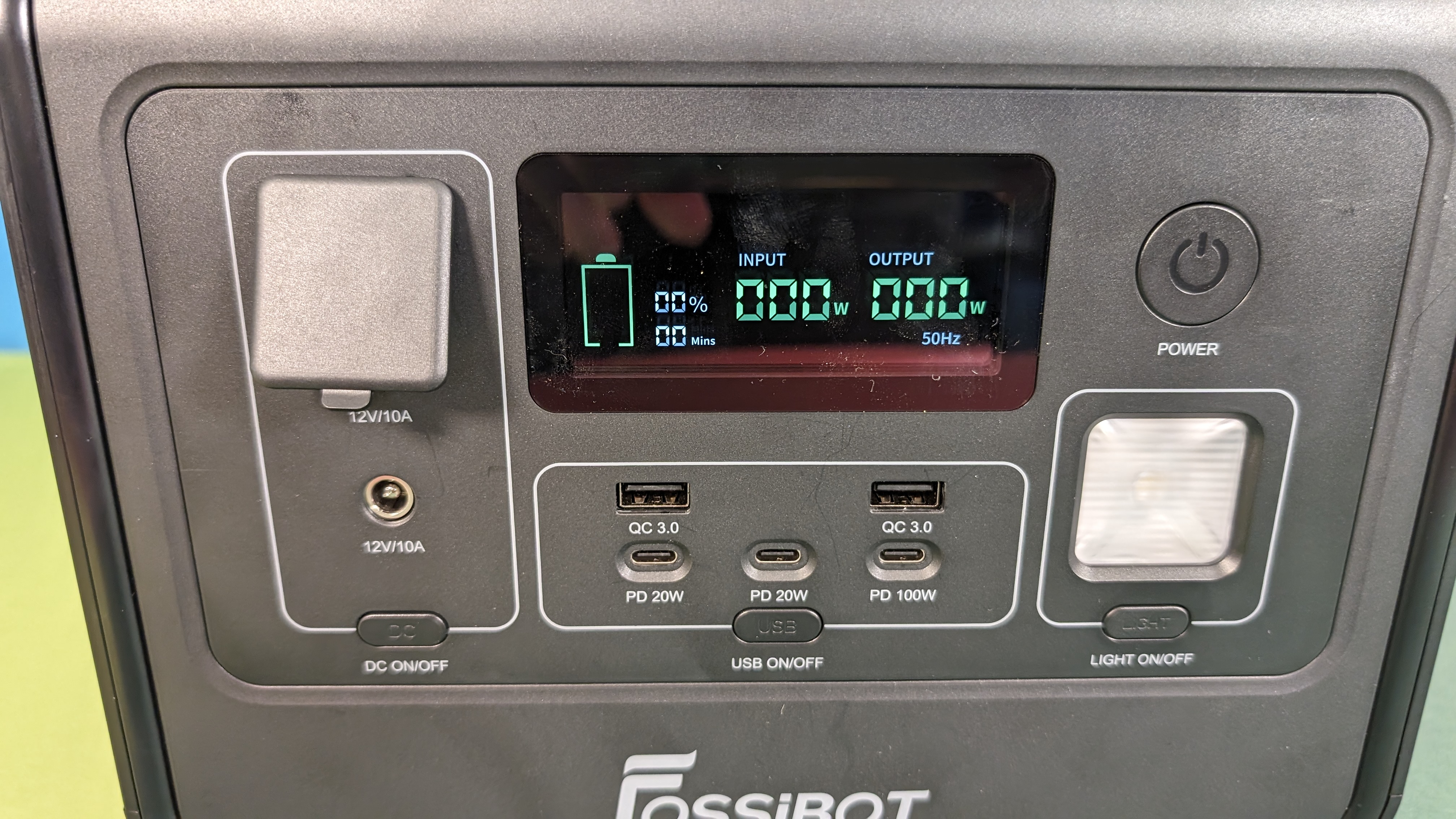 Die Fossibot F800 bietet die wichtigsten Anschlüsse, darunter drei USB-C-Ports (2x 20 Watt, 1x 100 Watt) sowie einen Rundstecker und einen KFZ-Stecker für Gleichstrom mit 12 Volt bei 10 Ampere. Die AC-Steckdose auf der rechten Seite kann bis zu 800 Watt liefern. Alle Anschlüsse aktiviert man über die jeweiligen Powertaster. Zuvor schaltet man die Powerstation über einen langen Druck auf den Ein-/Aus-Taster ein. Alle Knopfbetätigungen sowie Warnungen bei Akkuständen von 100 Prozent, 10 Prozent und kurz vor 0 Prozent werden von einem lauten Piepton begleitet. Auf Dauer ist dieser enorm lästig, lässt sich zudem leider auch nicht deaktivieren.