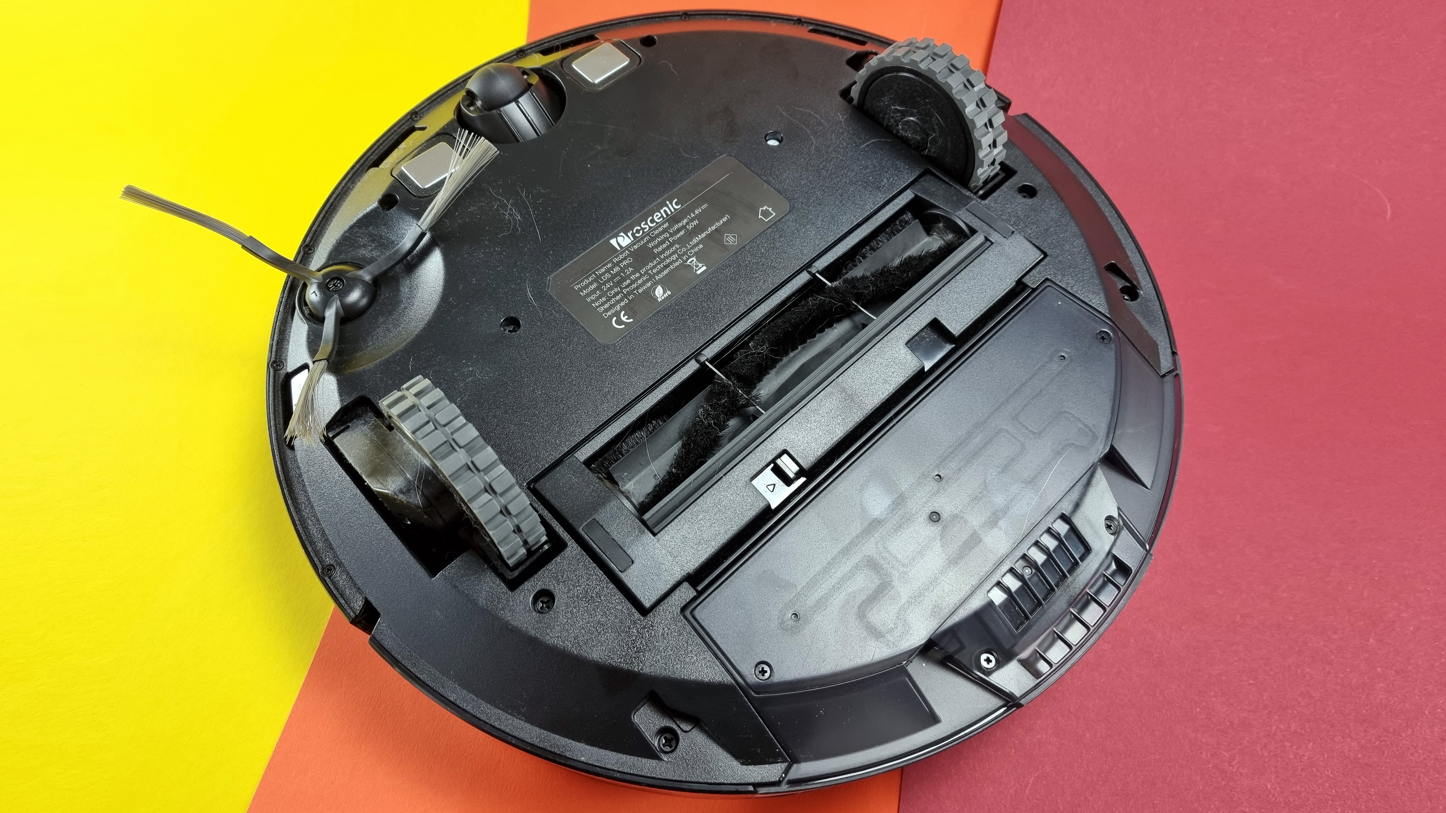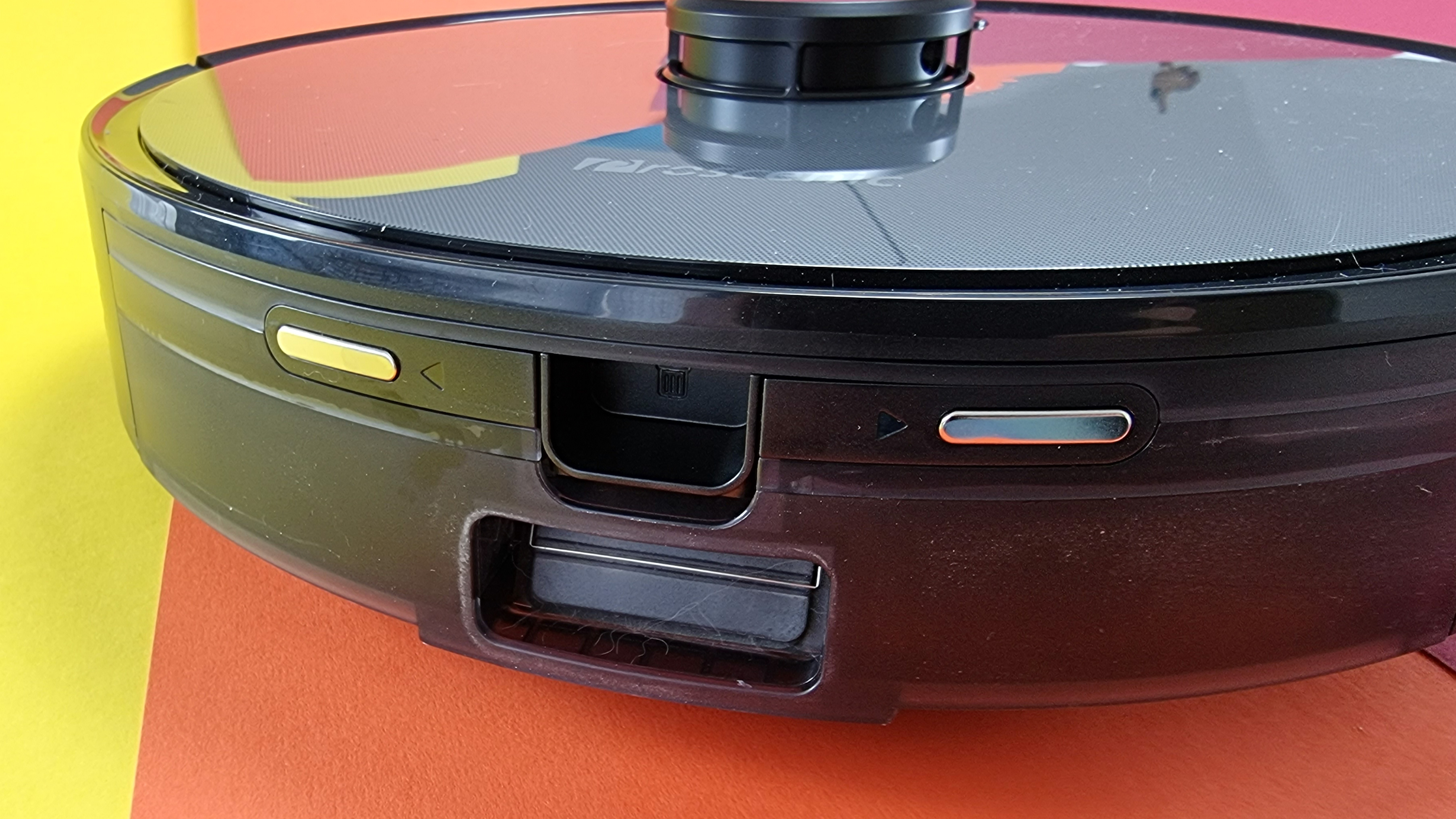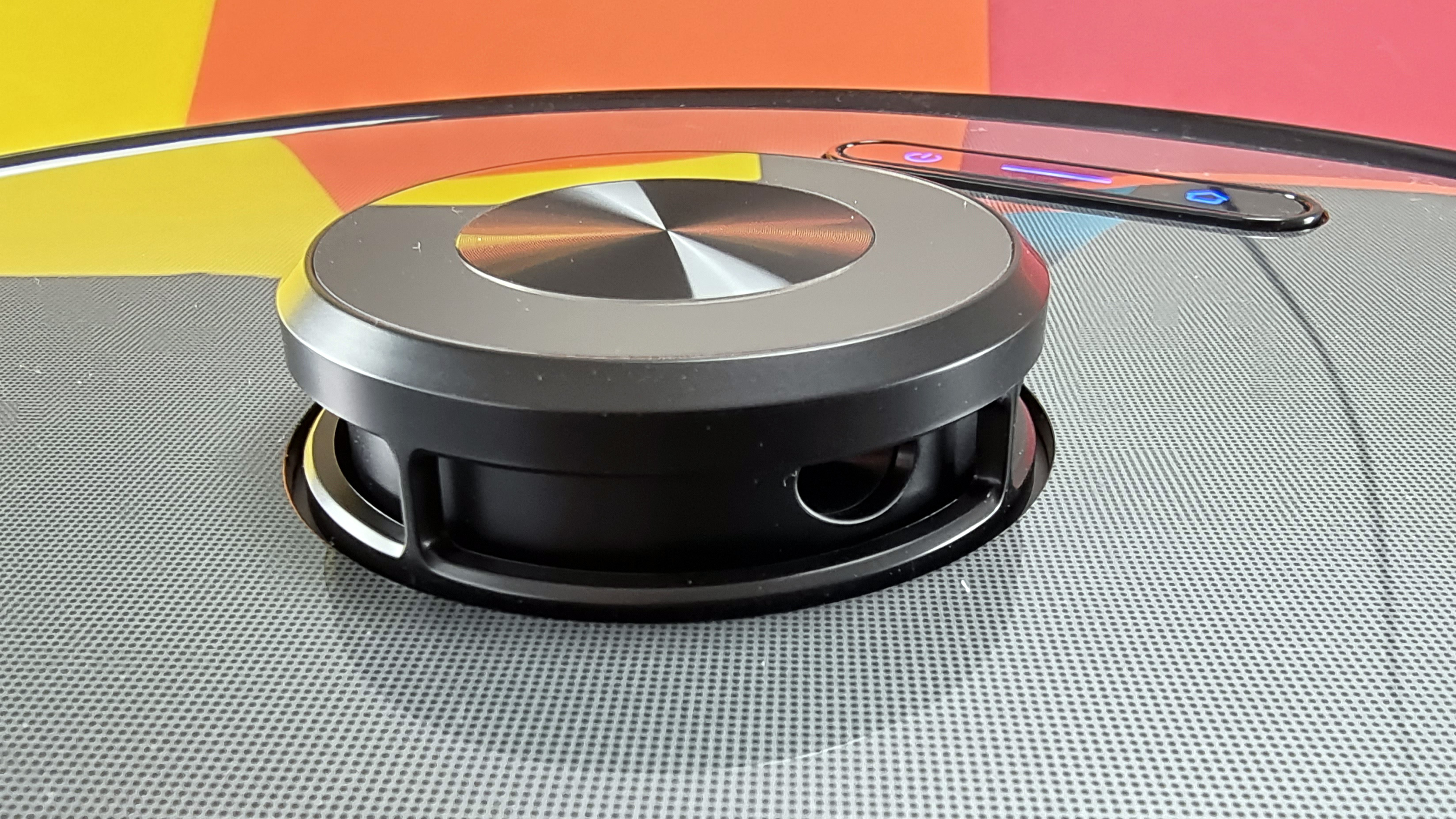 Zum Thema Design gibt es eigentlich kaum etwas zu sagen – der Proscenic M8 Pro ist ein typischer Saugroboter in Rundform. Mittig auf dem Gehäuse sitzt der Laserturm mit eigenem Bumper, vorn zwei LED-beleuchtete Tasten mit LED-Streifen dazwischen. Seitlich sind Sensoren untergebracht, nach vorn sichert der Frontbumper, zusätzlich ein Ultraschallsensor, sodass der Sauger nach Möglichkeit gar nicht erst echte Tuchfühlung aufnimmt. Eine einzelne Seitenbürste rechts sorgt für Staubaufnahme an den Rändern. Der Schmutzbehälter wird nicht wie bei den meisten Konkurrenten oben, sondern hinten entnommen. Dort befinden sich auch die Ladekontakte und die Absaugöffnung für die externe Station. Beim Vorgänger war die noch unten am Gerät, das neue Modell wählt einen direkteren Weg. Mit 9,8 Zentimeter Höhe (inklusive Turm) und 3,6 Kilogramm liegt der M8 Pro absolut im Rahmen. Vom Vorgänger scheinen auch noch weitere Ladekontakte vorn unter dem Gerät zu stammen – ihr Nutzen blieb uns im Test schleierhaft.