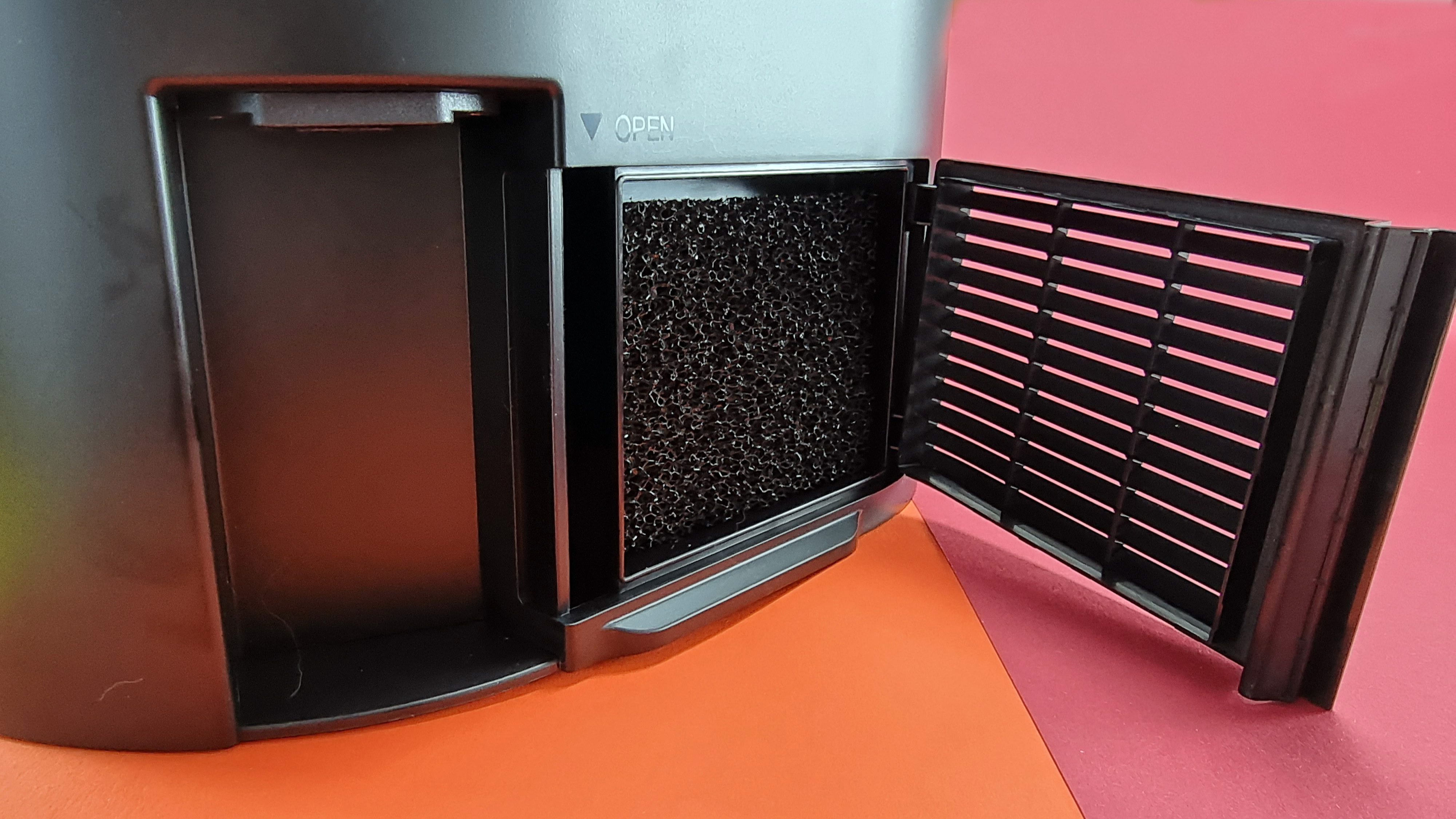 Die Absaugstation ähnelt optisch der vom Vorgänger, allerdings hat Proscenic hier noch einmal Hand angelegt. Neben zwei wechselbaren Filtern bietet der Hersteller inzwischen Sensortasten, um den Reinigungsvorgang zu unterbrechen und den Sauger zur Station zurückzubeordern, außerdem gibt es eine rudimentäre Anzeige, die den Akkuzustand des Saugers dokumentiert. Einen Knopf zum manuellen Absaugen gibt es nicht.