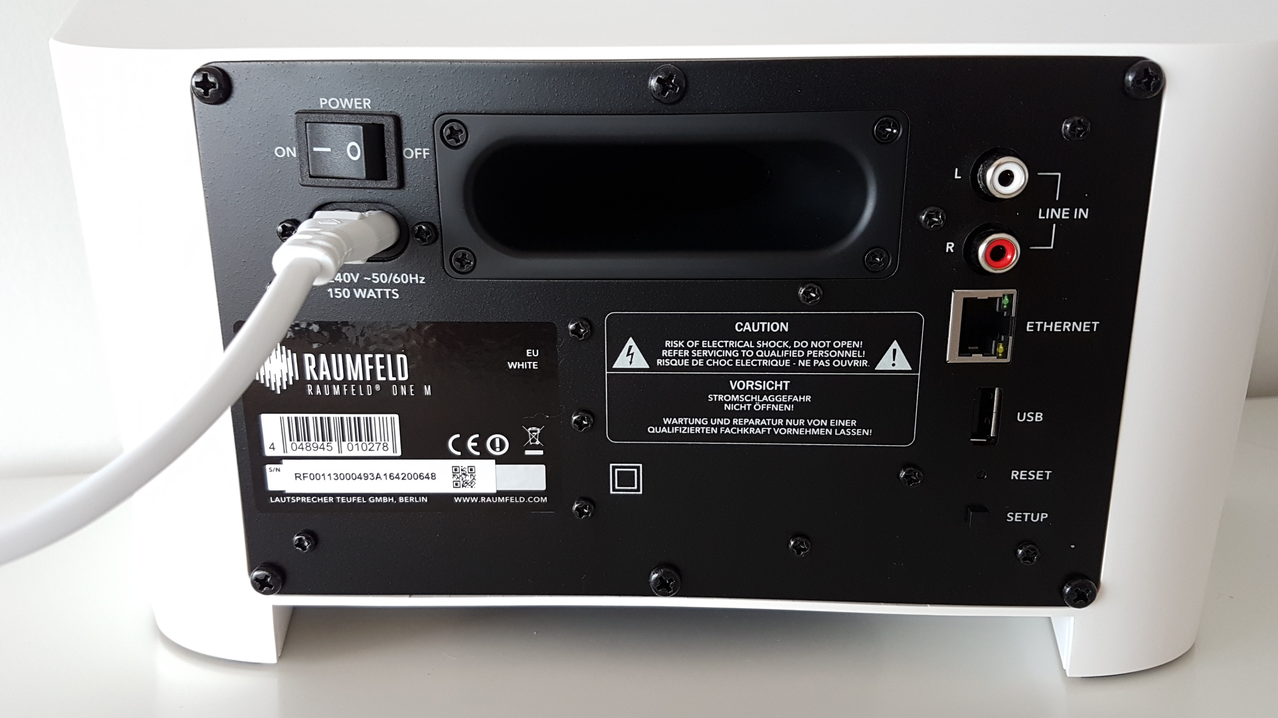 Im Vergleich zum One S hat der One M neben einem USB-Port zum Anstöpseln von Speichermedien auch einen Audio-Eingang mit zwei Chinch-Buchsen. Das ist praktisch, um CD-Player, Plattenspieler oder andere Audioquellen auf der Box abzuspielen. Innerhalb der App lässt sich für den Line-In-Eingang der Eingangspegel einstellen.