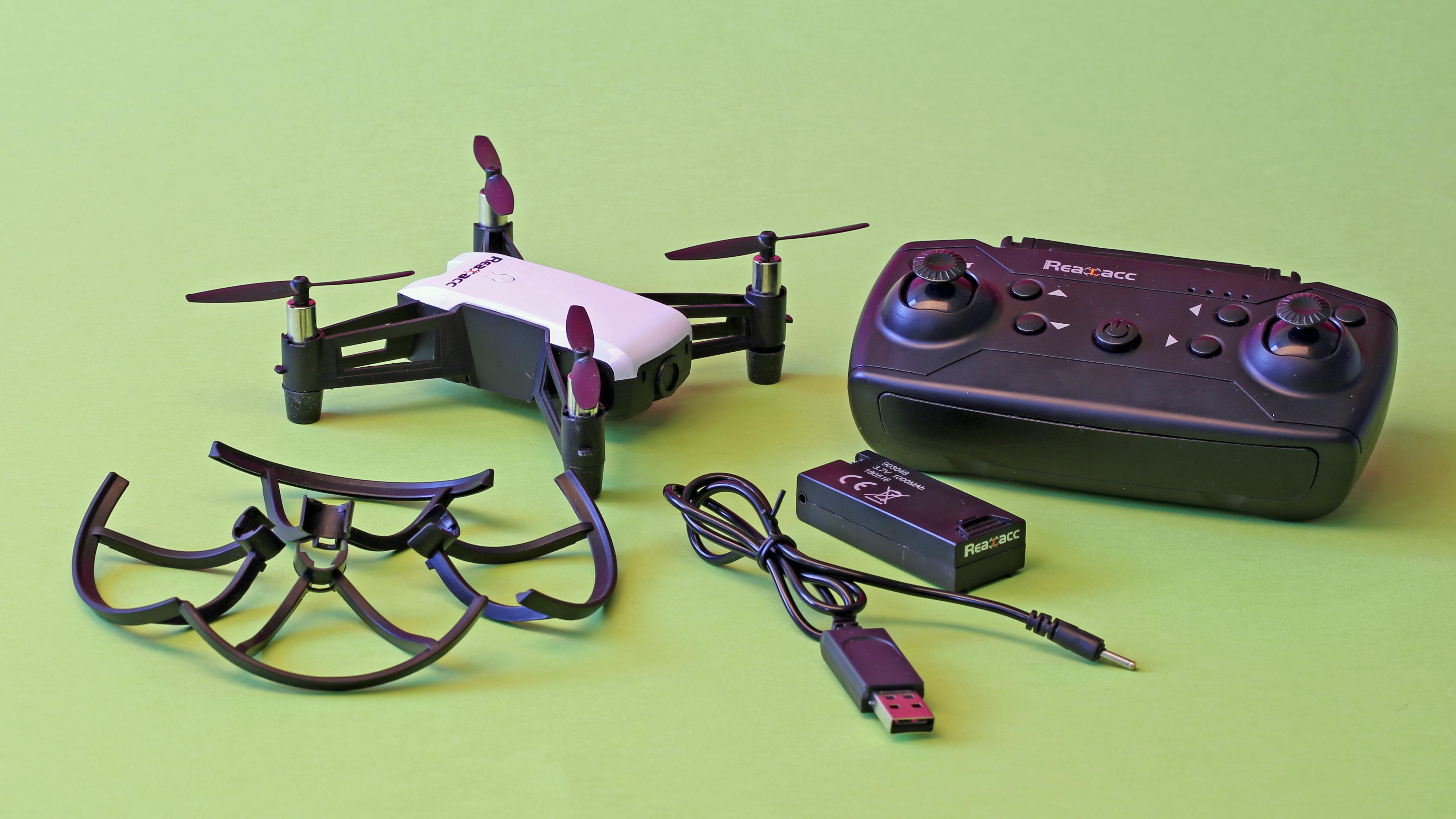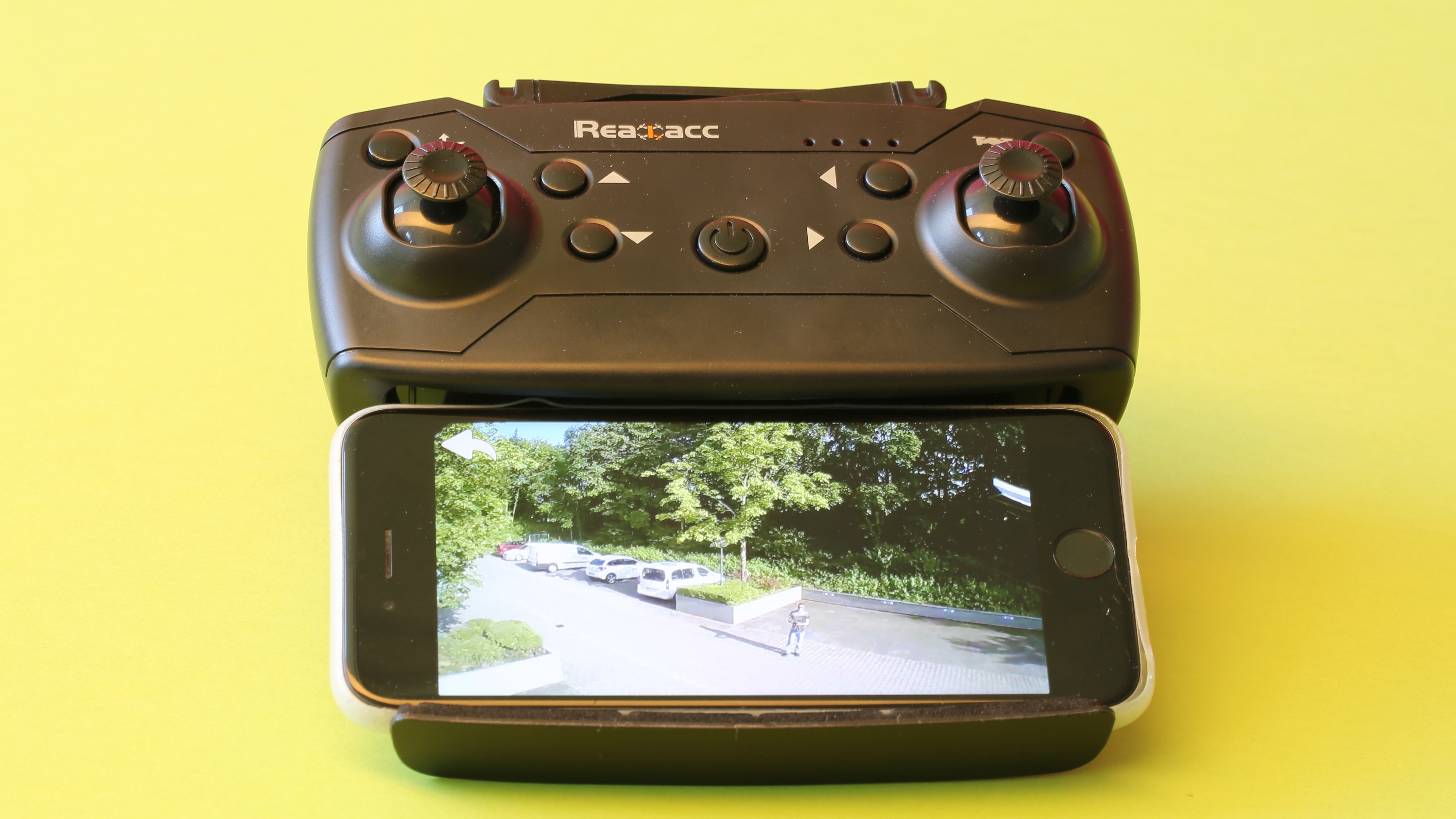 Der Hersteller Realacc setzt bei der Steuerung auf eine 2,4GHz-Verbindung und die Verwendung eines Handsenders. Optische Sensoren, wie sie die DJI Tello verwendet, sind nicht verbaut. Das billige Modell kann somit nicht die Position halten und so muss der Pilot ständig gegensteuern, um Wegdriften zu verhindern. Die Höhe hält die Drohne immerhin selbstständig.