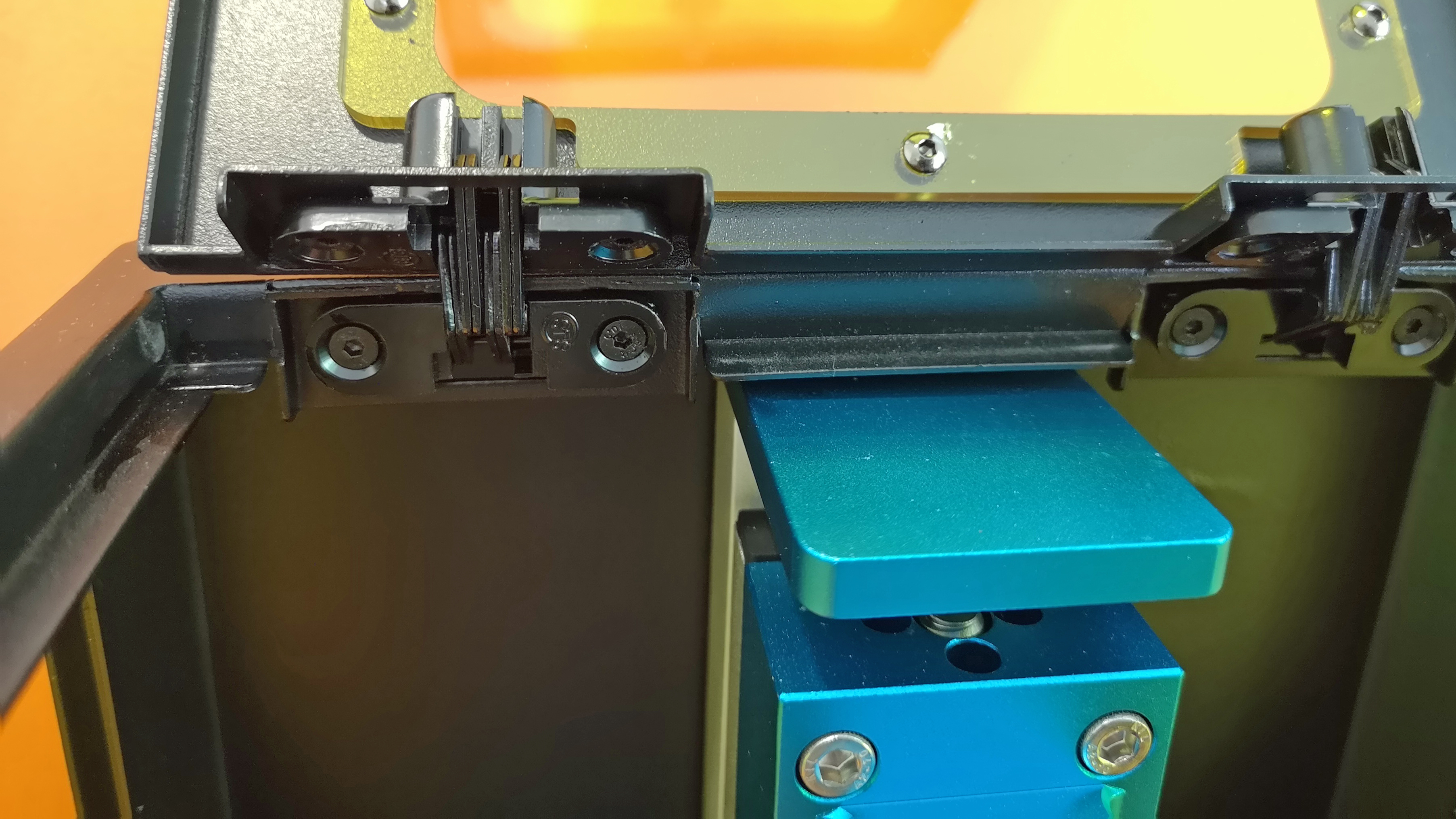 Anders als der Elegoo Mars mit seiner Kunststoff-Haube zum Aufsetzen, verfügt der Photon über ein geschlossenes Gehäuse mit einer klappbaren Front. Die grün oder blau eingefärbten Scheiben erlauben den Blick in den Druckraum und halten gleichzeitig das UV-Licht draußen. So ist das empfindliche Resin vor den UV-Anteilen des Tageslichts geschützt und die Ausdünstung des Harzes hält sich in Grenzen. Auch wenn das geschlossene Gehäuse sehr schick aussieht, das Platzangebot im Inneren ist stark limitiert. Nutzer mit großen Händen tun sich verhältnismäßig schwer , beispielsweise beim Wechseln des Resin-Tanks.