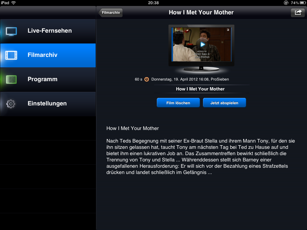 Die eyetv-App ist übersichtlich und intuitiv gestaltet. Sie ist in vier Bereichen – Live-Fernsehen, Filmarchiv, Programm und Einstellungen – gegliedert. Die Übertragung ist qualitativ gut. Der Player bietet eine Timeshift-Funktion, dessen Puffer in den Einstellungen definiert werden kann. Der Bewegungsspielraum beträgt 76 Minuten (= 2GB). Die Applikation kommt ohne Internet aus: Der elektronische Programmfrüher bekommt seine Daten aus dem DVB-T Kanal.