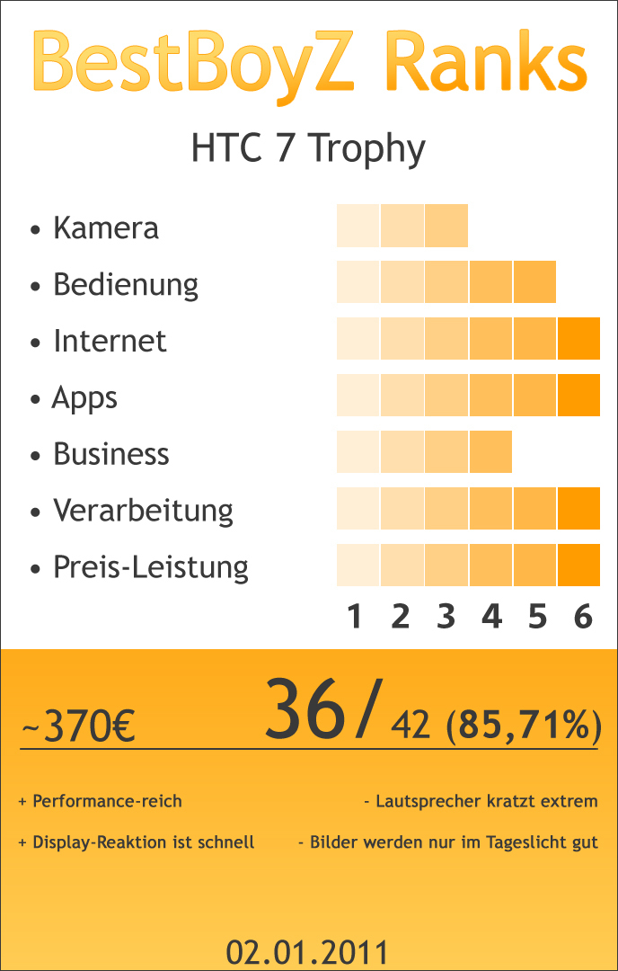 Das 7 Trophy von HTC ist eines der günstigsten Windows Phone 7-Smartphones. Von seinem Formfaktor ist es überzeugend und zeigt sich als solides Telefon. Leider ist es bei HTC immer das Gleich: Die Kamera, welche ungenügend ist und der Lautsprecher, welcher sich im Verhältnis zu anderen Telefonen leise anhört.