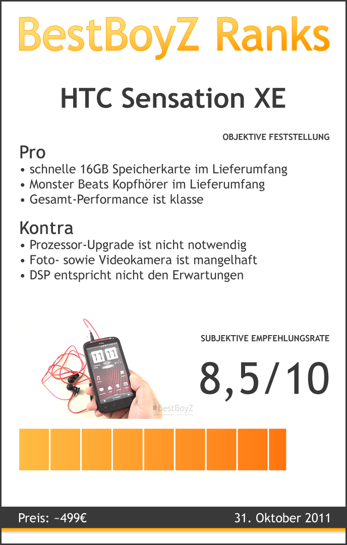 Sensation XE ist ein gutes Musik-Smartphone, allerdings nur mit den mitgelieferten Headsets – trotzdem ist es kein neuer Maßstab an Qualität. Der Lautsprecher des Telefons hat nach wie vor eine schlechte Qualität; bei voller Lautstärke kratzt dieser. Die Kamera liefert ebenfalls keine guten Bilder sowie Videos, vor allem der Ton bei den Videos rauscht extrem. Gefallen hat uns die Gesamt-Performance des Sensation XE, obwohl ein Prozessor-Upgrade nicht notwendig ist; er belastet den Akku genau so stark wie ein HTC Sensation mit 1,2GHz und 1520mAh. Die Optik gefällt uns, jedoch ist dies eine Geschmackssache.