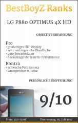 Das P880 OPTIMUS 4X HD von LG Electronics hat uns überrascht: Es ist ein sehr gelungenes Telefon mit einer blitzschnellen System- und Internet-Performance. Zu den weiteren Stärken gehört das 4,7-Zoll große Display, dessen Farben ziemlich realitätsnah dargestellt werden. LG Electronics‘ neue Oberfläche, OPTIMUS UI 3.0 ist umfangreich: Man hat viele Möglichkeiten, das Telefon zu individualisieren. Der 2.150mAh-Akku steht einem 2 bis 2,5 Tage bei – nutzt man das P880 OPTIMUS 4X HD intensiver, dann fällt man auf 1 Tag. Was uns nicht gefallen hat, war der Lautsprecher auf der Rückseite; er ist zu leise. Die Fotokamera macht zwar Bilder in 8-Megapixel, doch die Ergebnisse sind schwach – hier fehlt etwas Detail. Dennoch, für aktuell 450€ bis 500€ ist das LG P880 OPTIMUS 4X HD ein sehr empfehlenswertes Smartphone. Unser Gerät wurde uns von getgoods.de zur Verfügung gestellt.