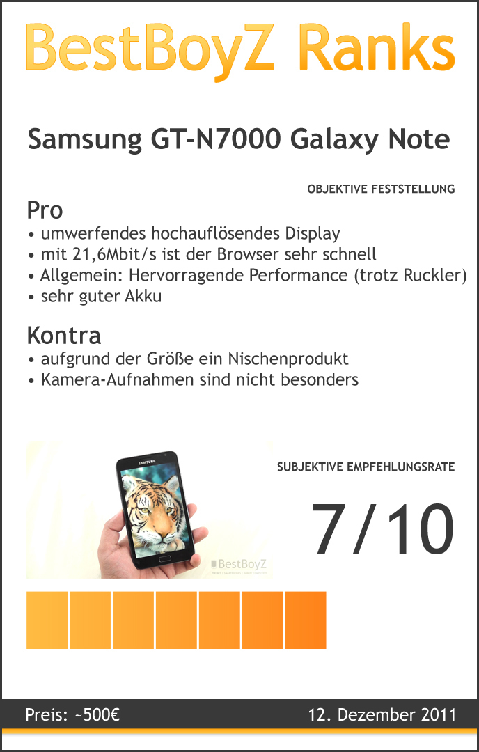 Technisch gesehen, ist es eines der stärksten Smartphones derzeit: tolles Display, starker Dual-Core Prozessor, großartiger Akku und klasse Netzwerk-Technologien. Aufgrund der Größe, ist es nicht für jeden gemacht – damit ein Nischenprodukt, für uns. Gefallen hat uns das helle Display. Nicht gefallen hat uns die Kamera, dessen Ergebnisse etwas schwach sind. Im Allgemeinen ist das GT-N7000 Galaxy Note ein schnelles Gerät. Trotz der kleinen Ruckler.