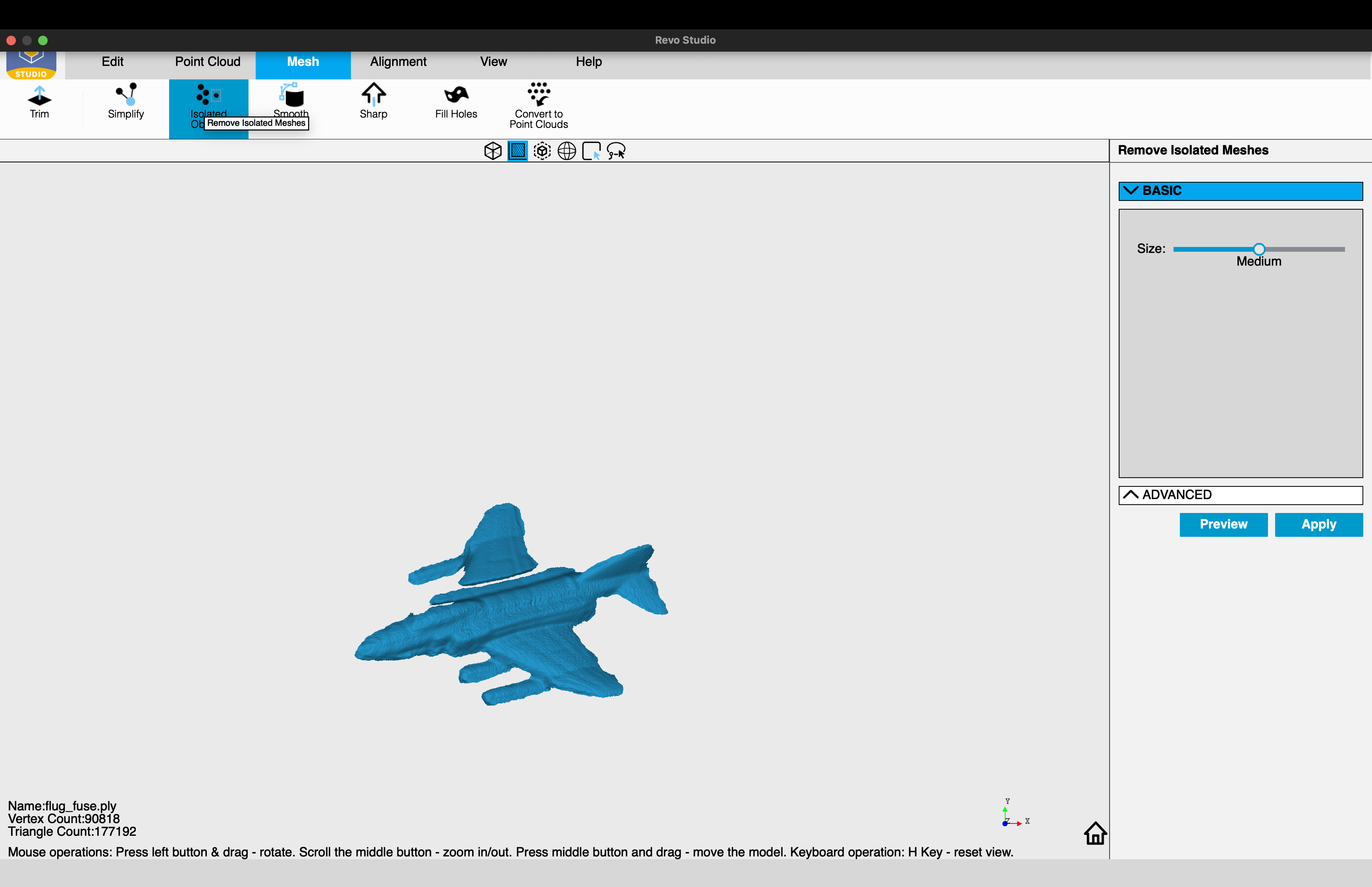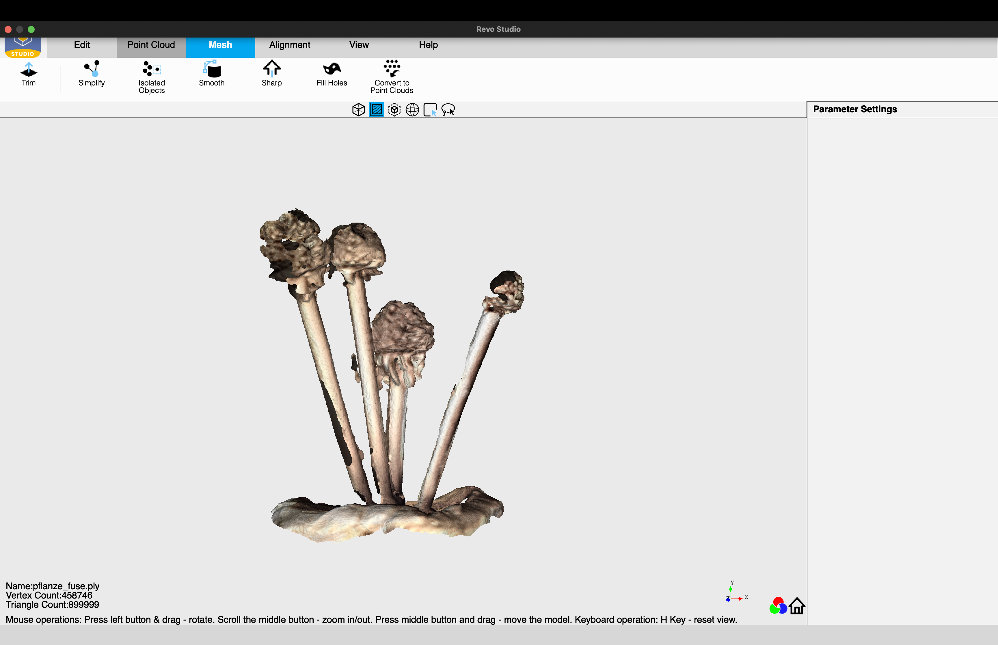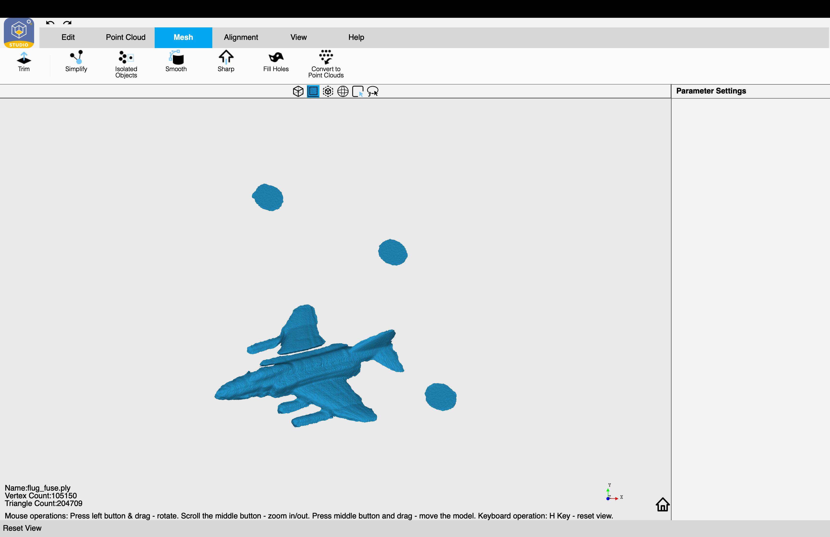 Scans von nur Münz-großen Objekten funktionieren auf dem Drehteller nicht so gut. Wir haben etwa beim Miniaturflugzeug bessere Resultate mit Einzelaufnahmen mittels ruhiger Hand-Scans erzielt. Später müssen diese Einzel-Scans dann im Revo Studio fusioniert werden.