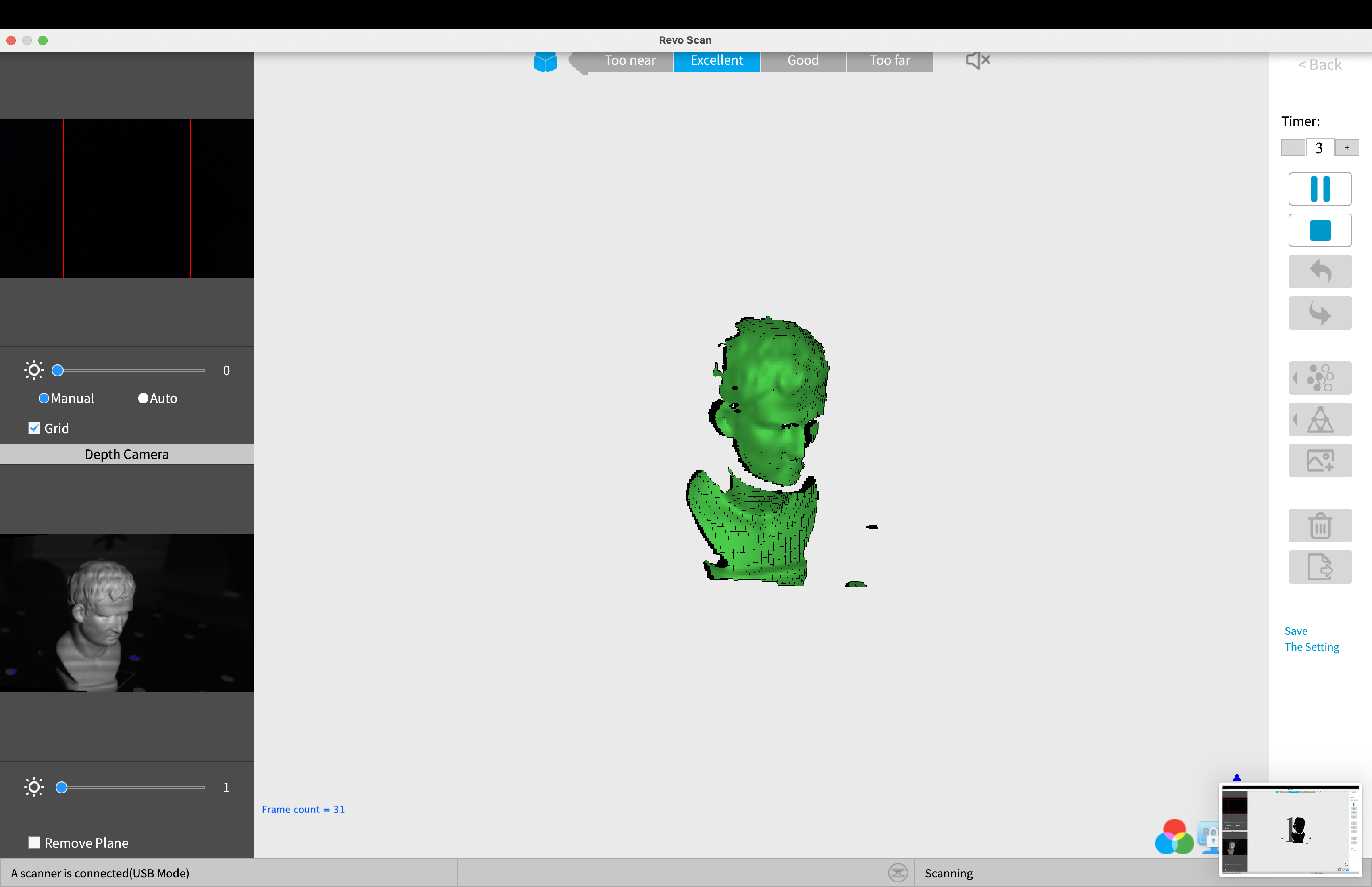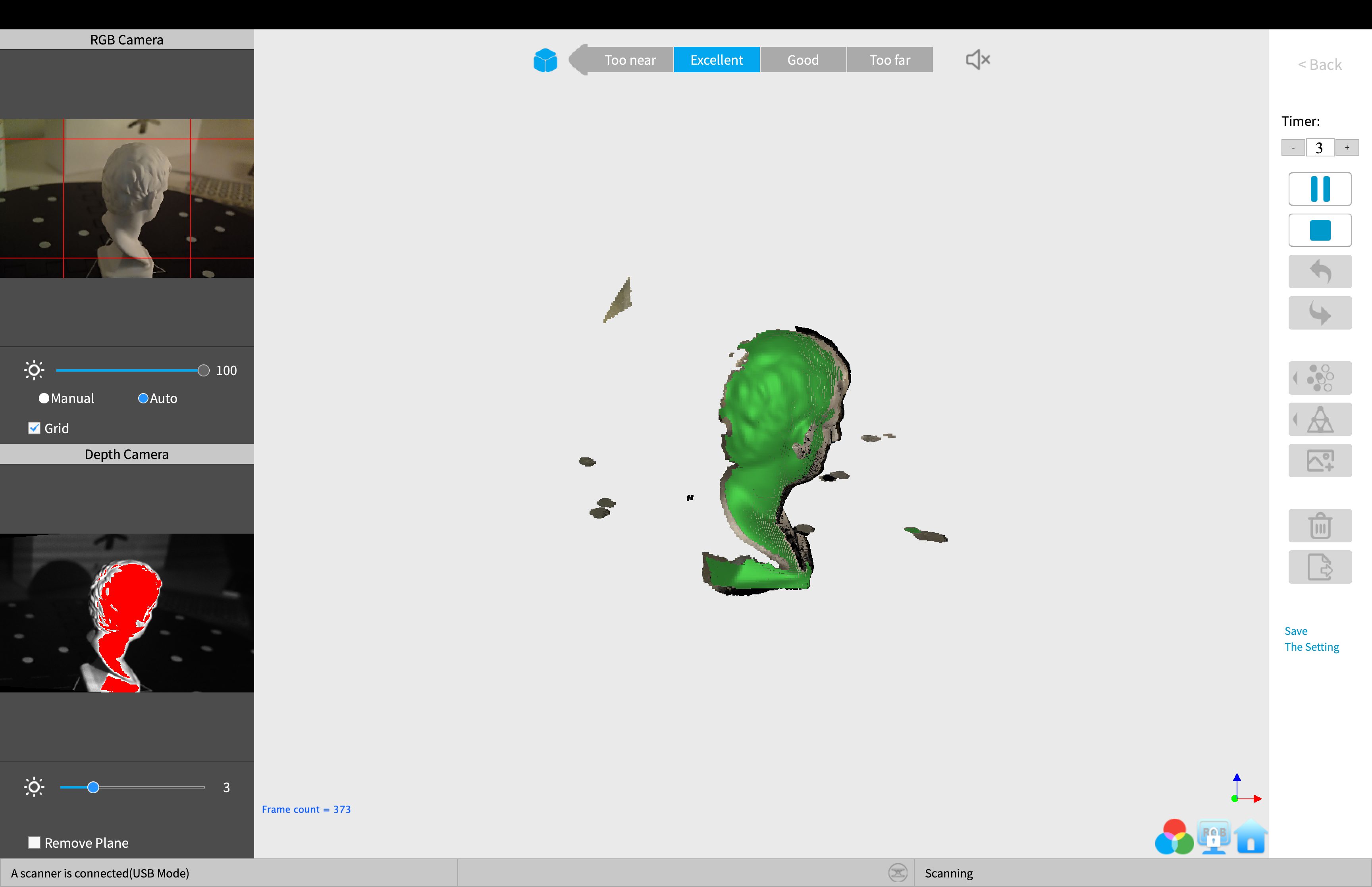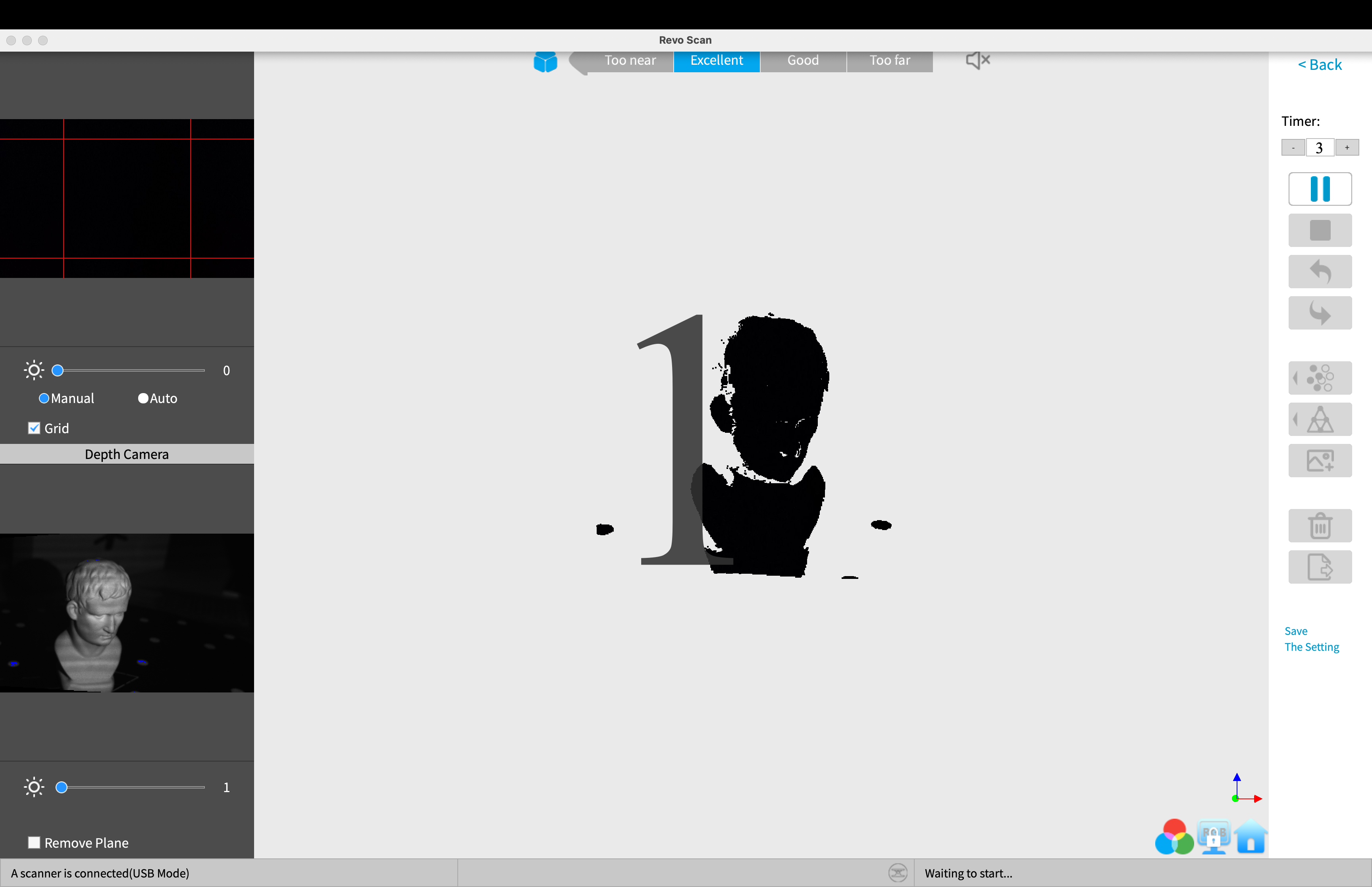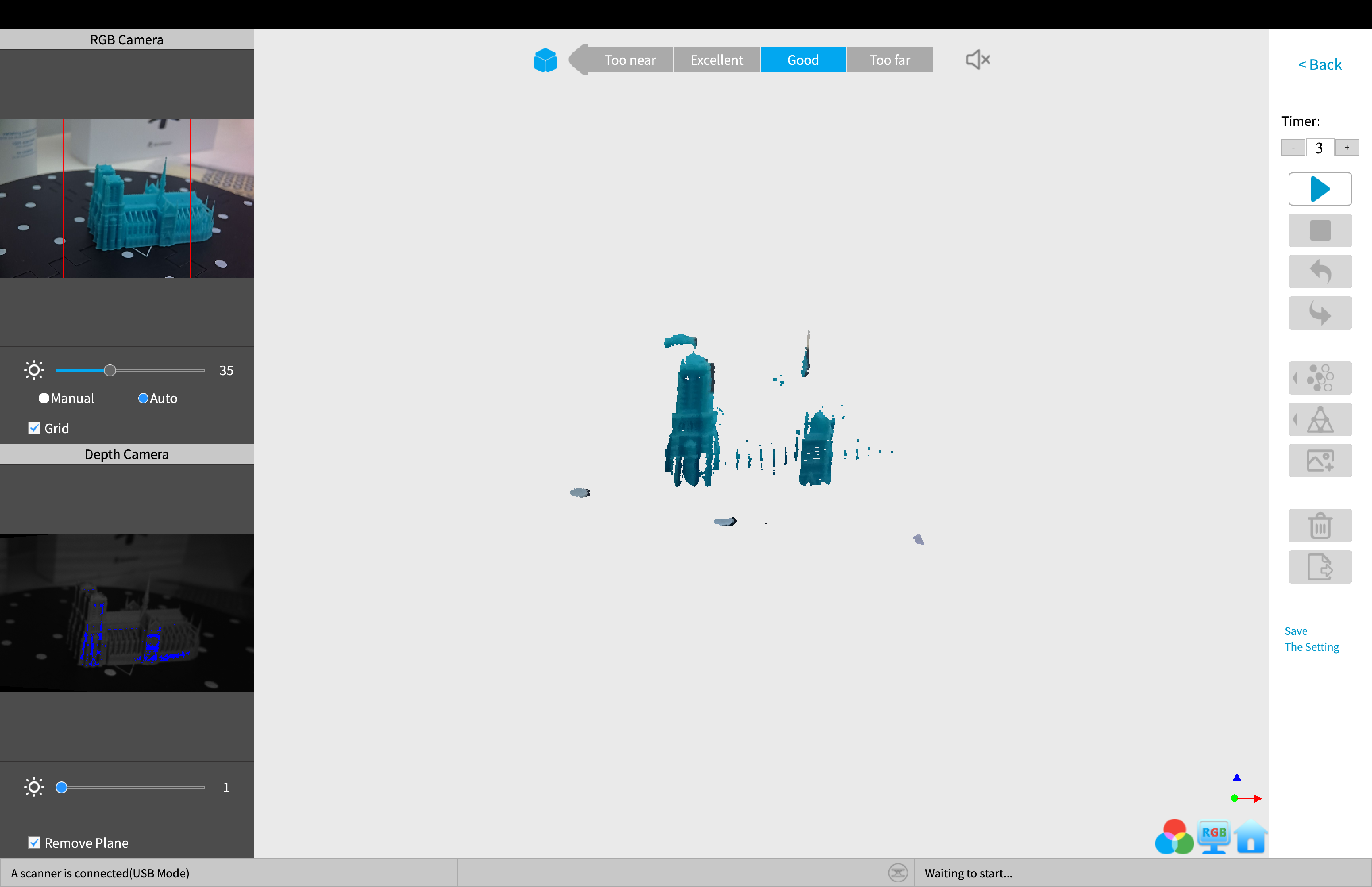 Sind Scanner, Rechner und Scan-Software verbunden, sehen wir auf dem Bildschirm rechts das Vorschaufenster. Dort befindet sich oben das Kamerabild und rechts unten der Tiefen-Scan. In diesen Fenstern sehen wir das Modell und im besten Fall keine blauen oder roten Flächen. Die symbolisieren nämlich Unter- oder Überbelichtung und sind schlecht für ein optimales Endergebnis. Entweder reguliert die automatische Belichtungs-Kalibrierung dies von selbst, wir müssen Lichtverhältnisse ändern oder die Oberflächeneigenschaften wie oben beschrieben verbessern.