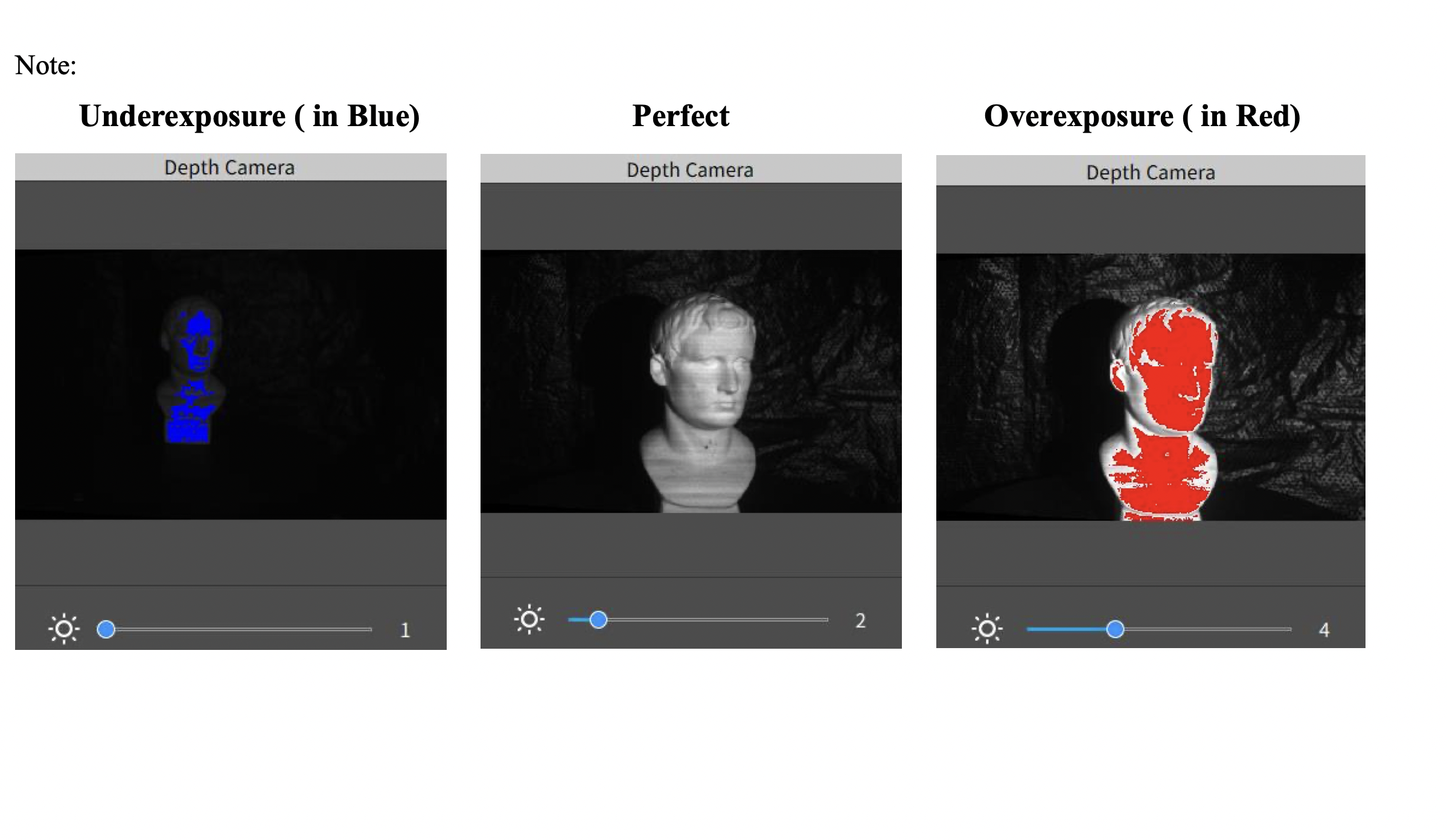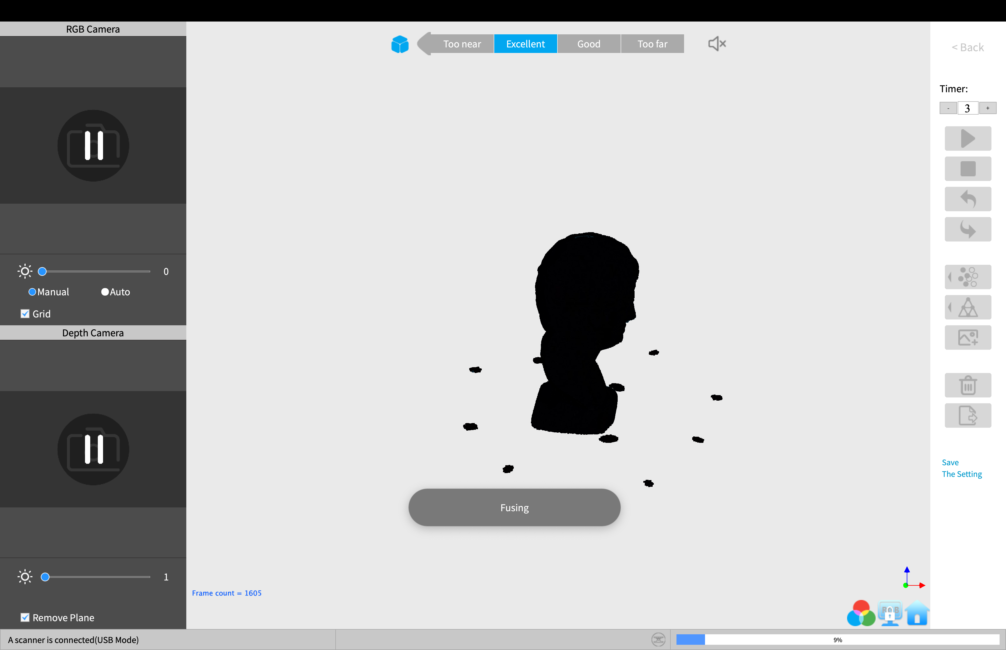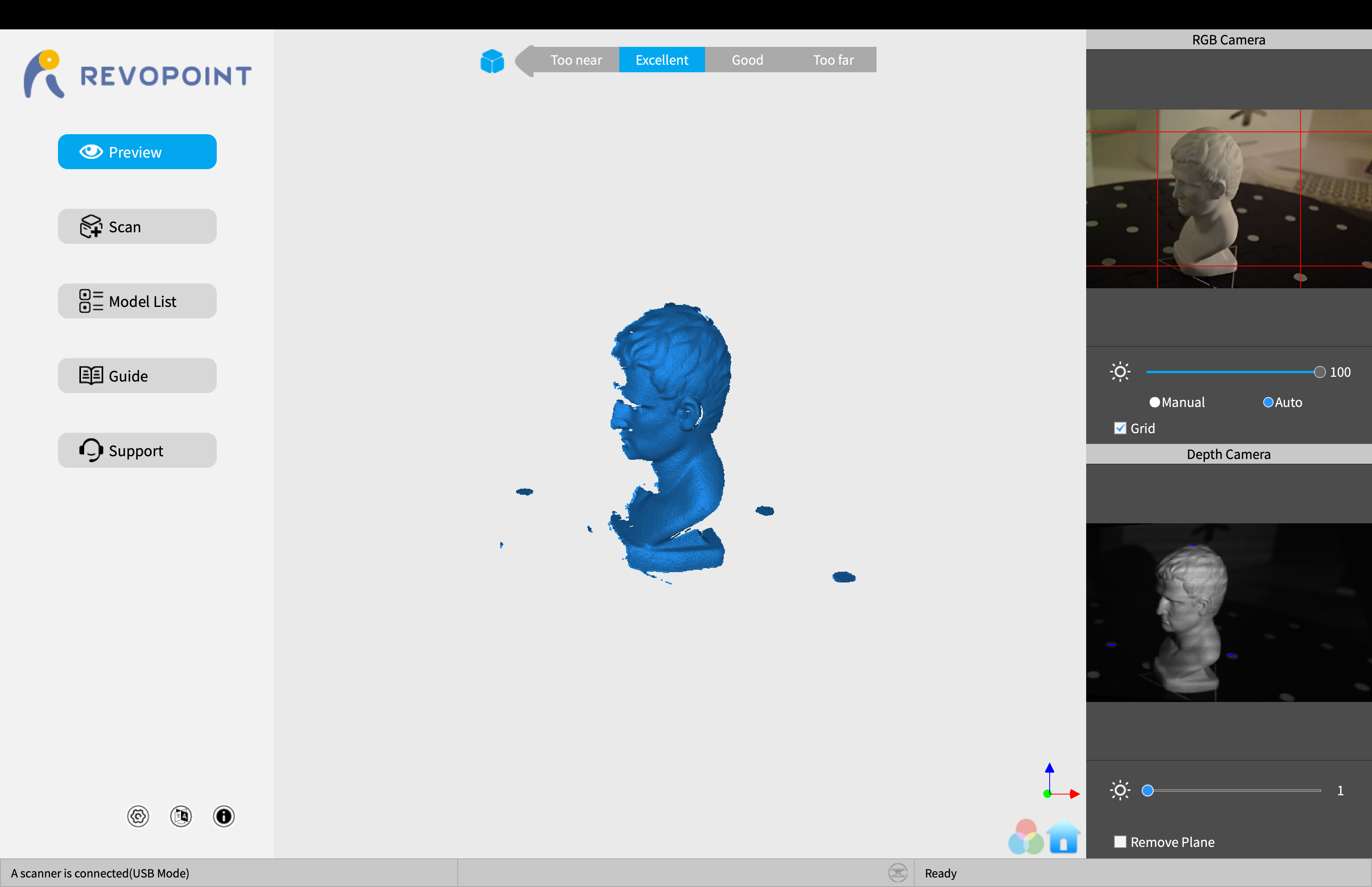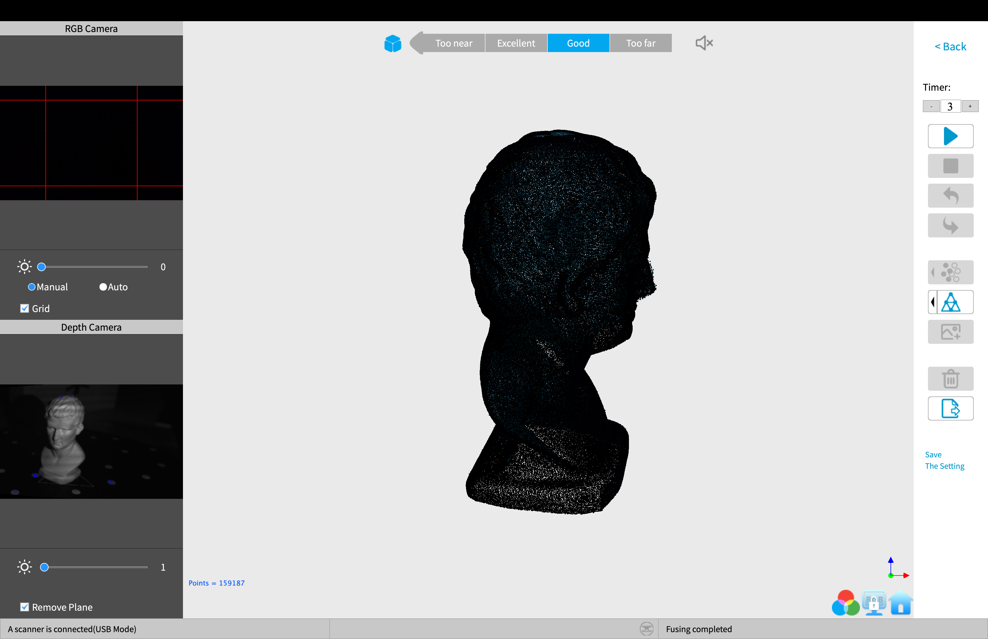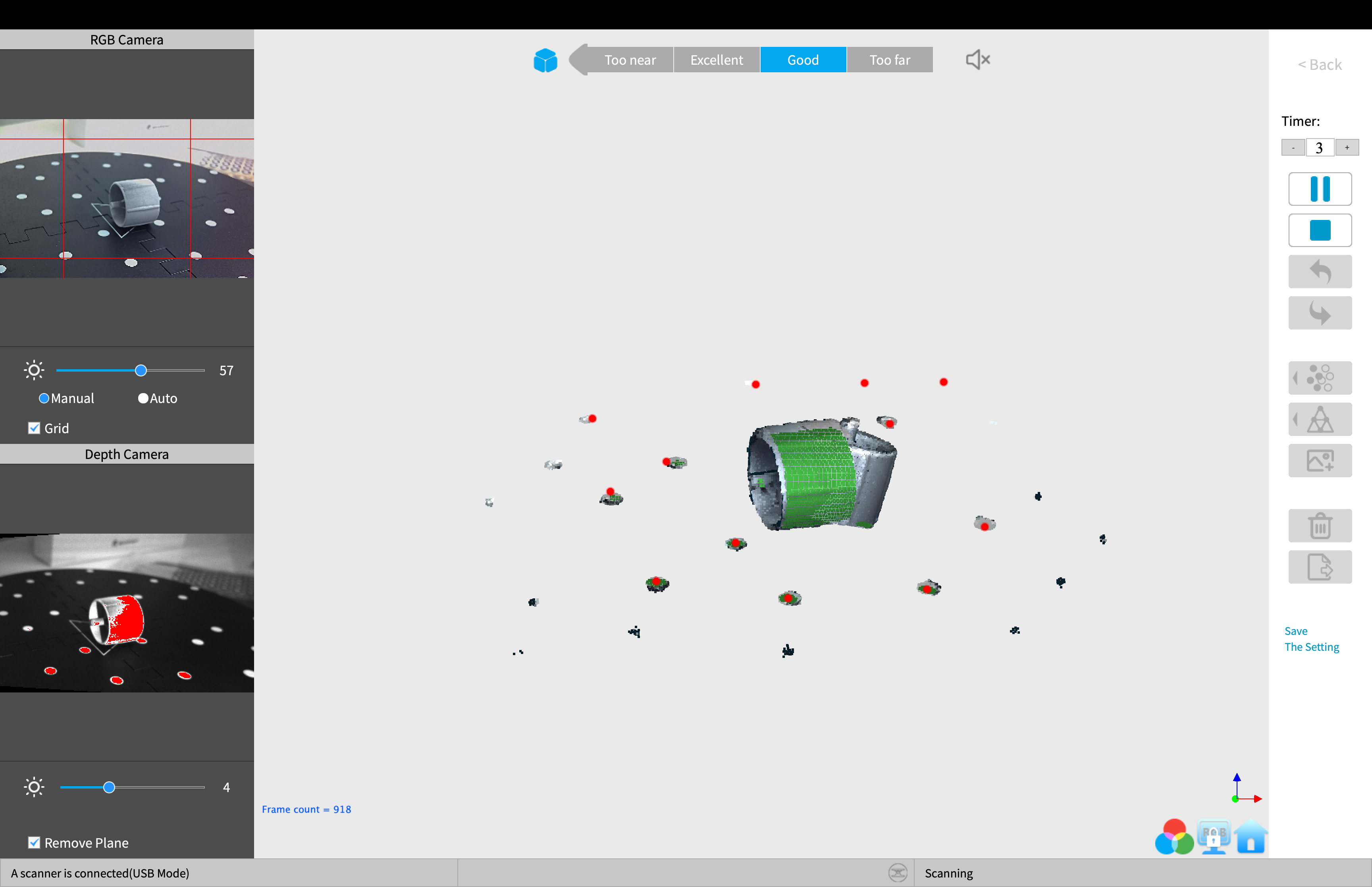 Sind Scanner, Rechner und Scan-Software verbunden, sehen wir auf dem Bildschirm rechts das Vorschaufenster. Dort befindet sich oben das Kamerabild und rechts unten der Tiefen-Scan. In diesen Fenstern sehen wir das Modell und im besten Fall keine blauen oder roten Flächen. Die symbolisieren nämlich Unter- oder Überbelichtung und sind schlecht für ein optimales Endergebnis. Entweder reguliert die automatische Belichtungs-Kalibrierung dies von selbst, wir müssen Lichtverhältnisse ändern oder die Oberflächeneigenschaften wie oben beschrieben verbessern.