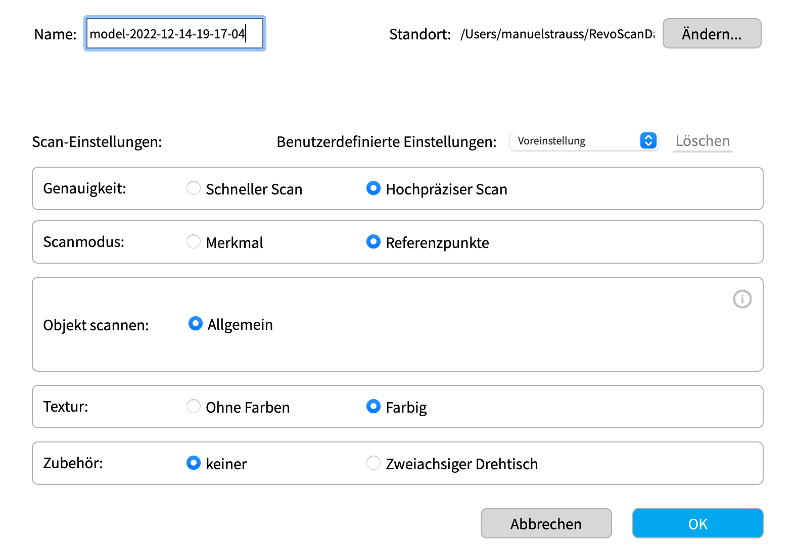 Starten wir den Scan-Vorgang, erscheint ein Auswahlfenster, um Scangenauigkeit, Tracking-Modi und Beschaffenheit des 3D-Modells einzustellen. Wir haben die besten Ergebnisse mit hochauflösendem, Merkmal-basierten Scannen ohne Farbe erzielt. Ist das erledigt, öffnet sich ein zweites Fenster, indem der Scan freigegeben wird. Für Scans mit dem Drehteller mussten wir bisweilen den Tiefen-Scan korrigieren, ansonsten läuft alles automatisch ab. Da mehrere Umdrehungen durch Verlust des Trackings einen Versatz erzeugen, ist eine einzelne Umdrehung auf dem Drehteller angeraten. Das Scanning mit der Hand erfordert einiges an Übung, insbesondere eine sehr ruhige Hand.