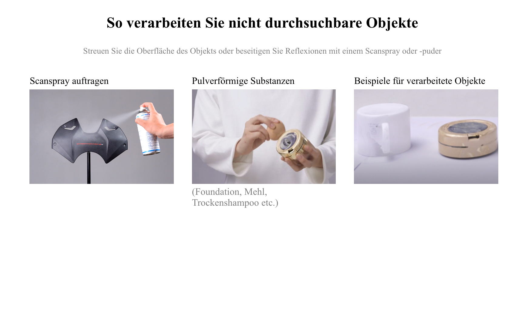 Die Qualität des fertigen Scans ist maßgeblich mit der Objektbeschaffenheit verknüpft. Die Oberflächenfarbe kann zwar vorbehandelt werden, Textur und Form jedoch nicht. So gibt es leider Modellformen, die in der Praxis einfach nicht funktionieren.