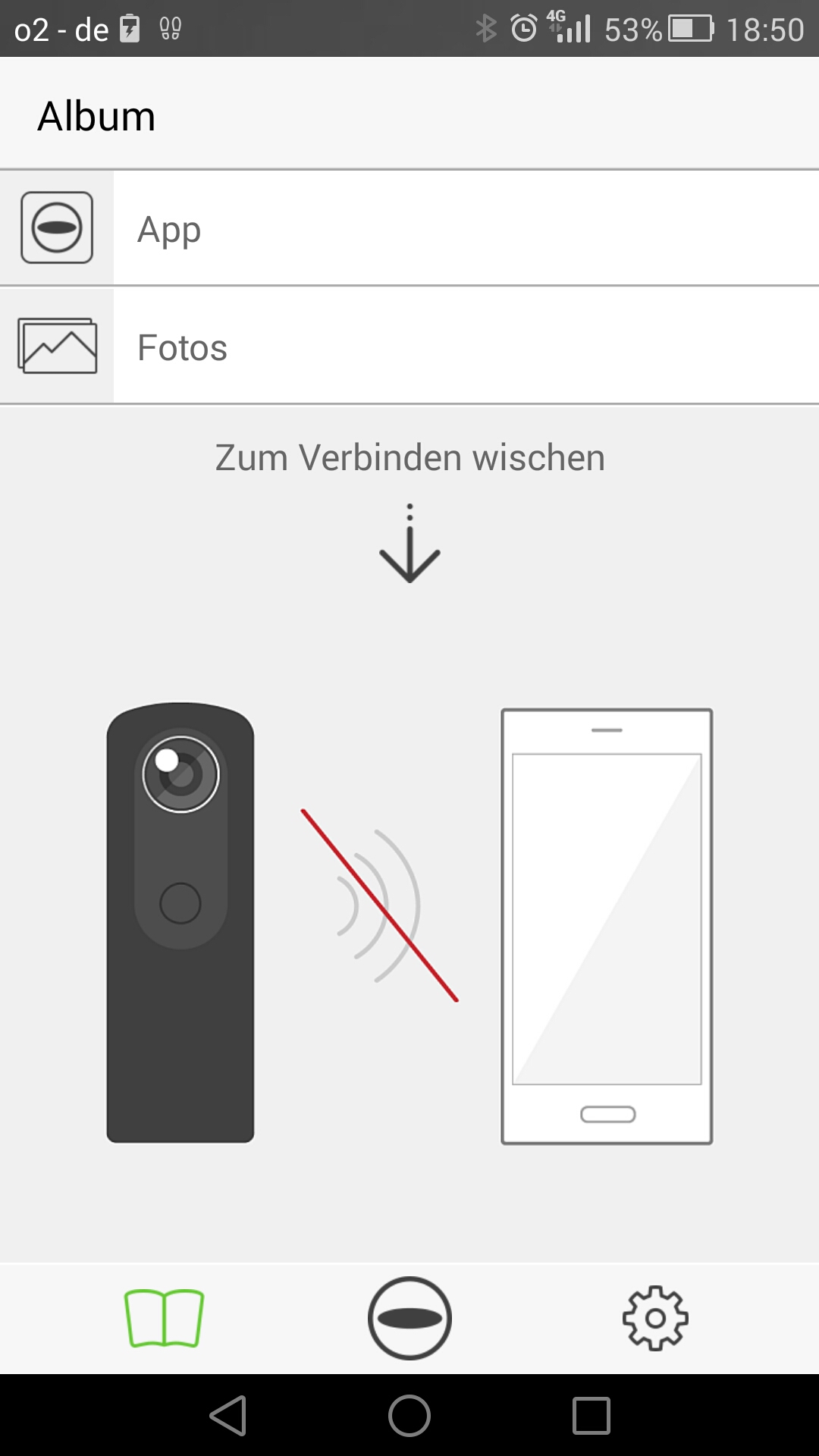 Die Anwendung unterteilt sich in drei Tabs. Ganz links findet sich das Wiedergabe-Tab, repräsentiert wohl durch eine Art Fotobuch. Hier kann der Nutzer Dateien von der Theta S aufs Smartphone übertragen – das fordert bei Videos allerdings gerne einmal etwas Geduld – bei einem 206 MByte großen und knapp zwei Minuten langen Video dauert das Kopieren etwa vier Minuten, während der man die Anwendung im Vordergrund lassen soll. Unter Android bricht während des Kopierens leider immer wieder die Verbindung ab
