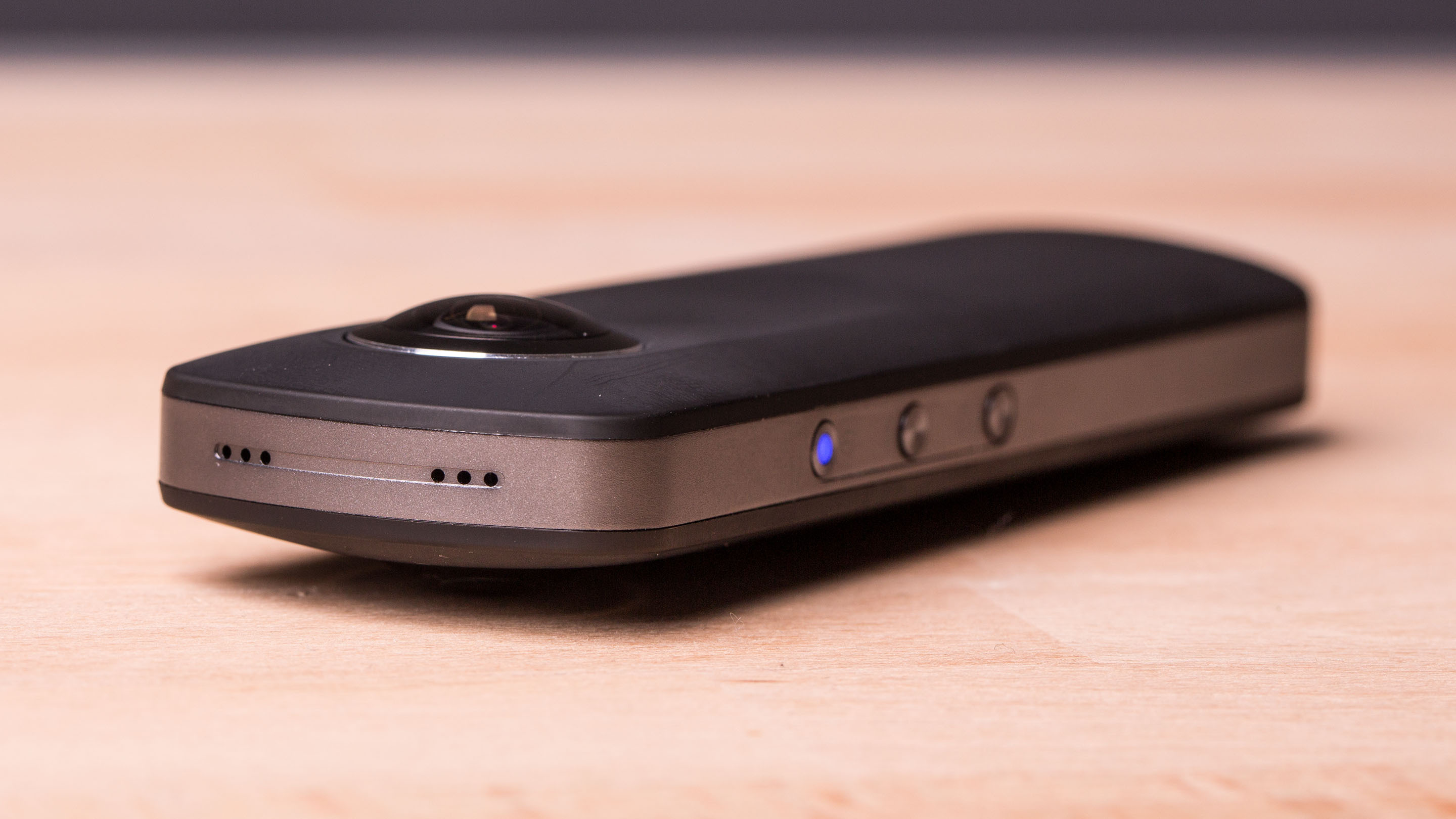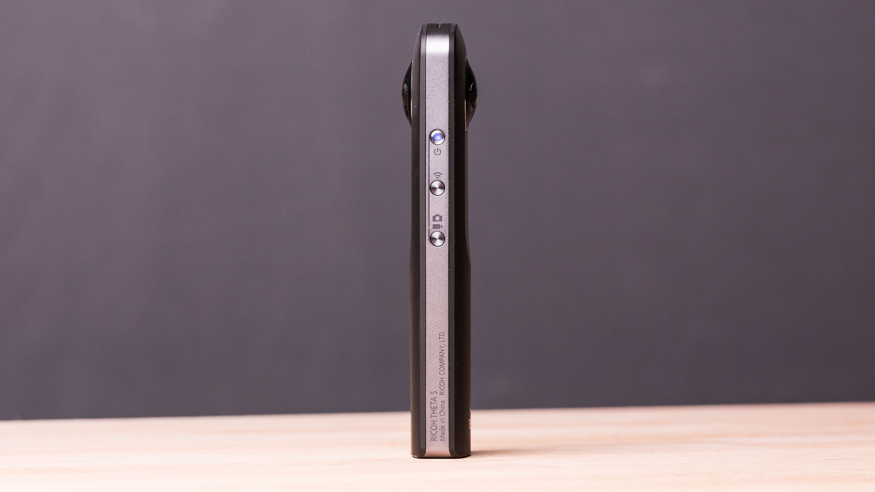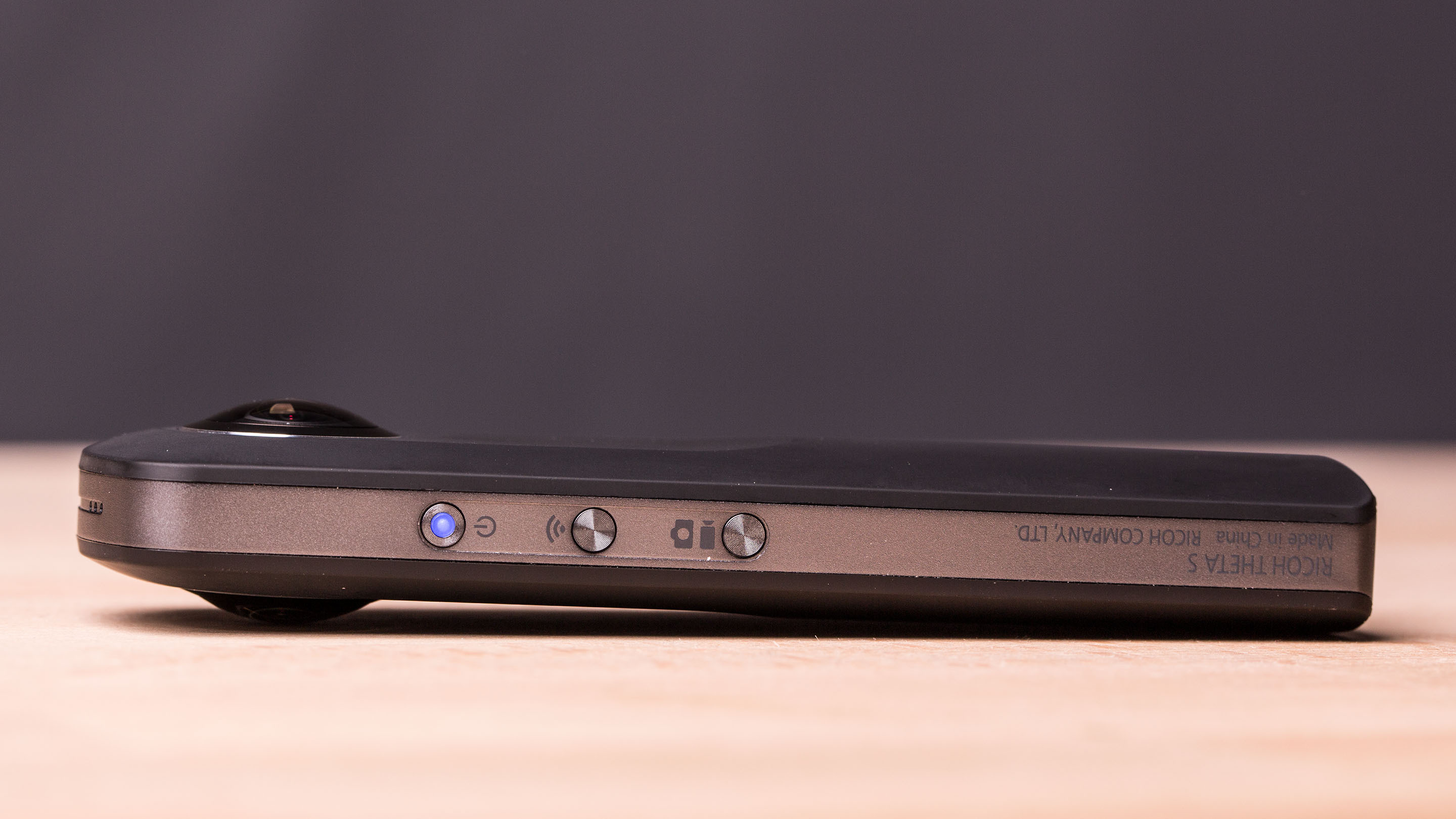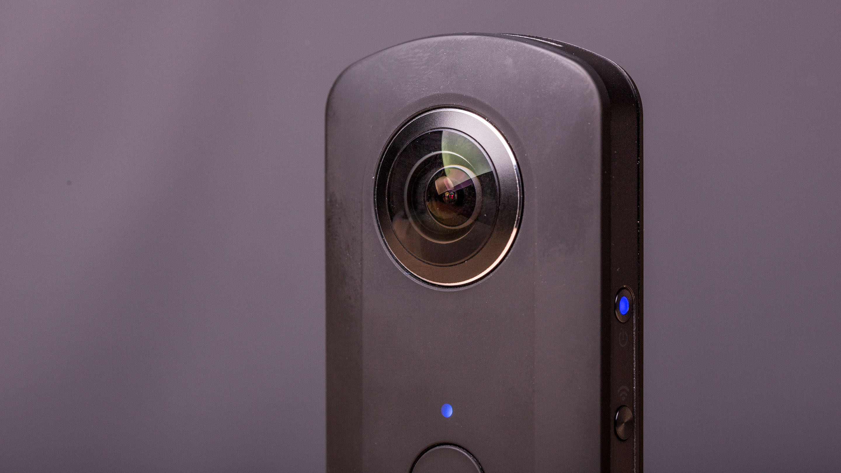 Die zweite Auffälligkeit betrifft den grundsätzlichen Aufbau. Die Theta S im Barren-Format hat auf beiden Seiten ein dickes Fisheye-Objektiv und ist weitgehend symmetrisch aufgebaut. Vorder- und Rückseite unterscheiden sich nur durch einen großen Aufnahme-Button, der sich mit dem Daumen gut erreichen lässt.