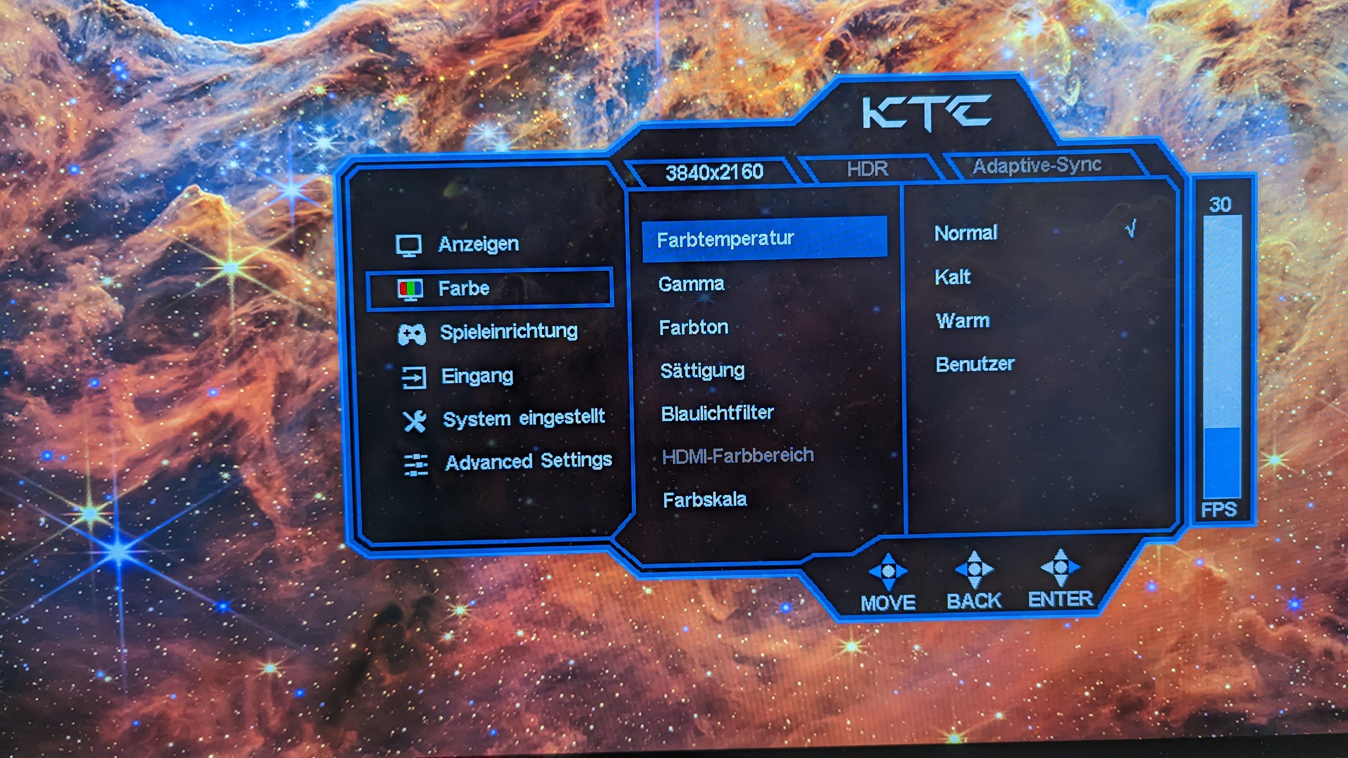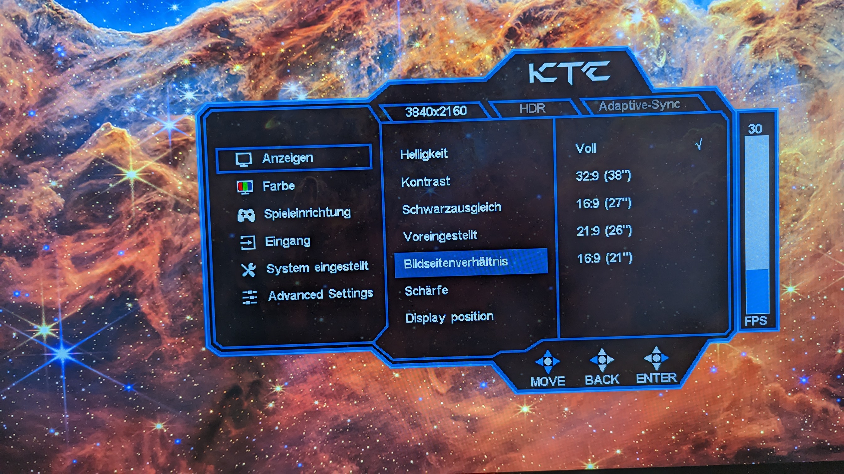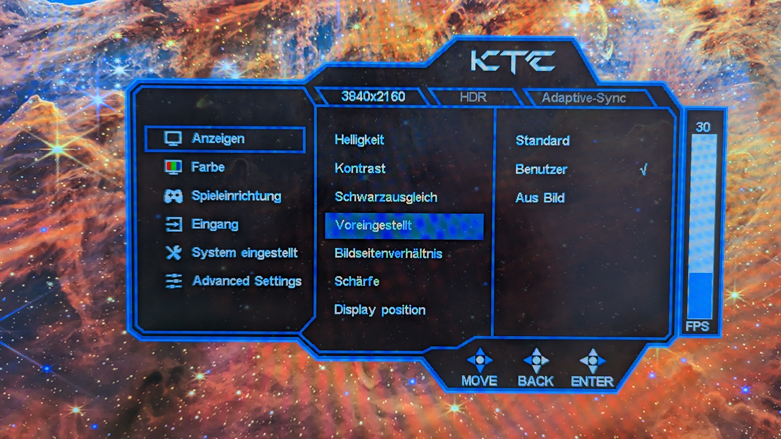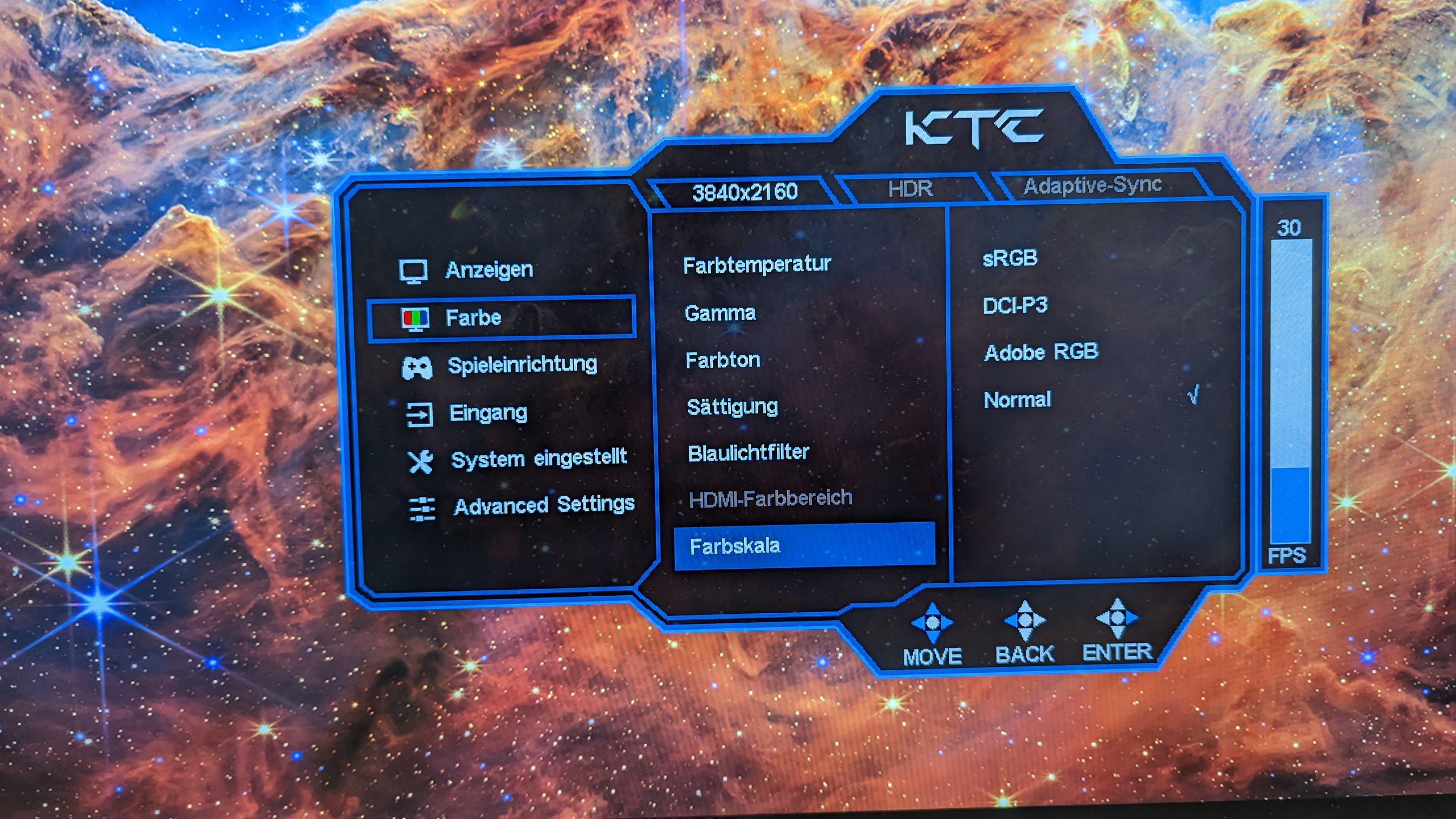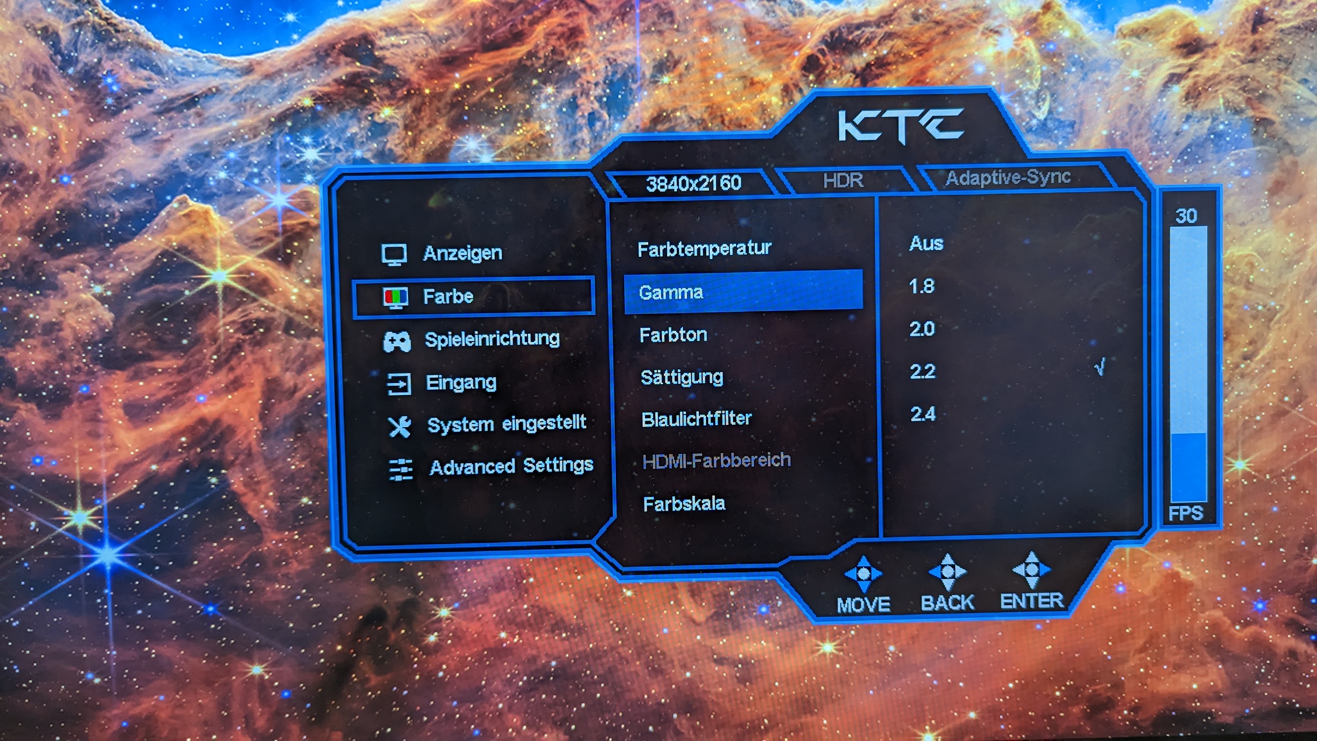 Der KTC G42P5 bietet entweder etwas umständlich direkt am Monitor oder komfortabler über die Fernbedienung zahlreiche Einstellungsmöglichkeiten. Neben eher gewöhnlichen Einstellungen wie Helligkeit, Kontrast und Sättigung kann der Nutzer hier auch den Farbraum wählen. Auch einige Gaming-Features wie ein dauerhaft angezeigtes Fadenkreuz, ein FPS-Zähler und ein Timer steht bereit. Alle Optionen zeigen wir in der Bildergalerie.