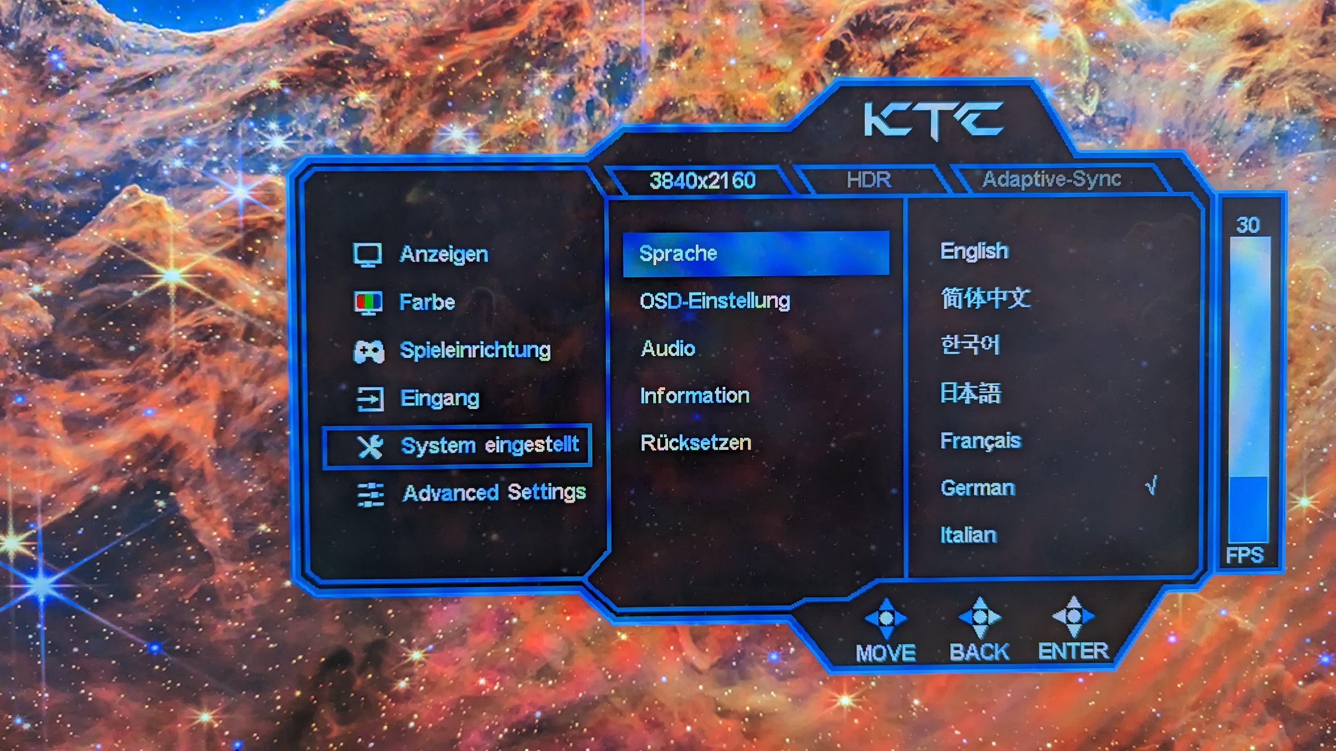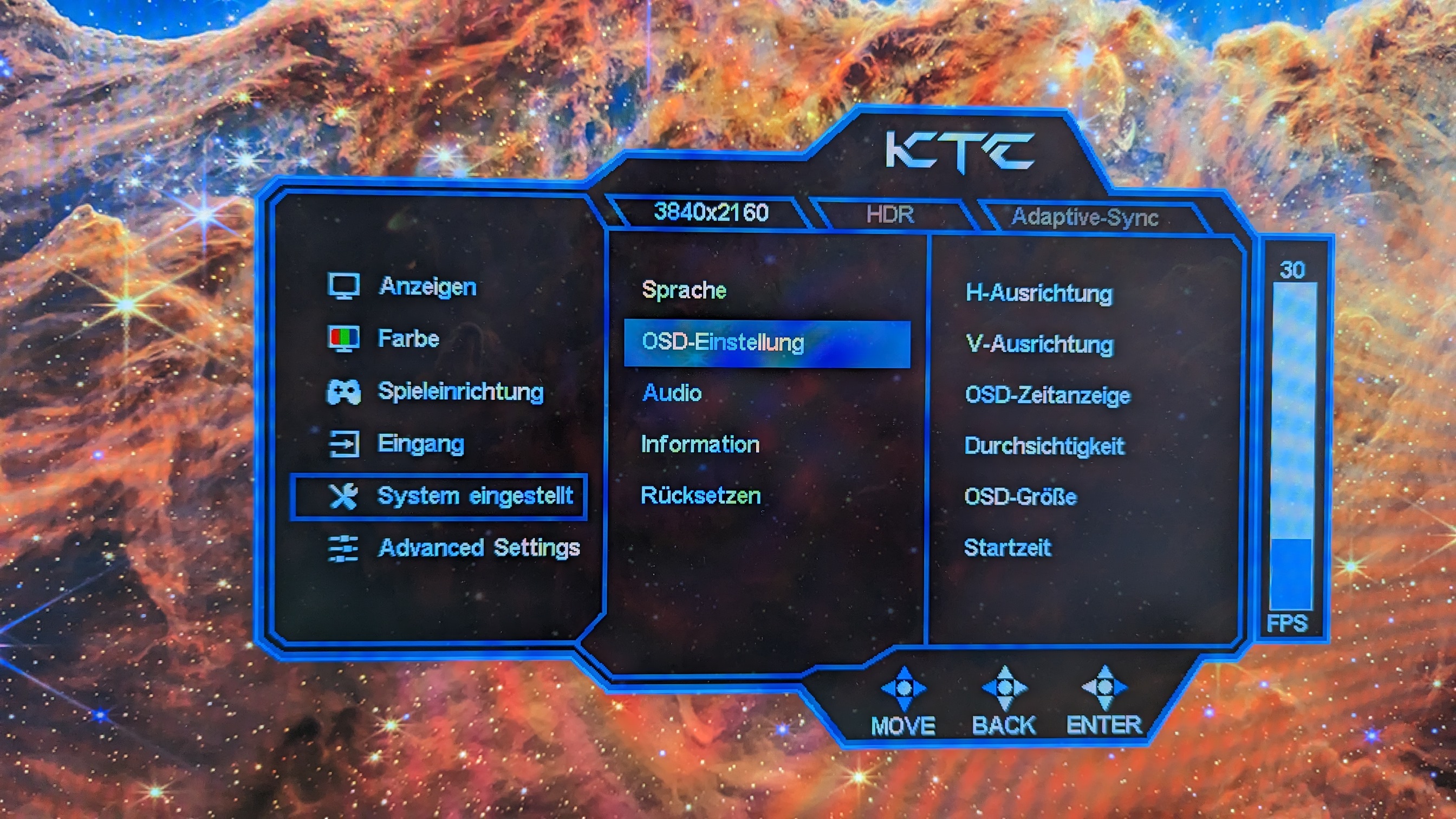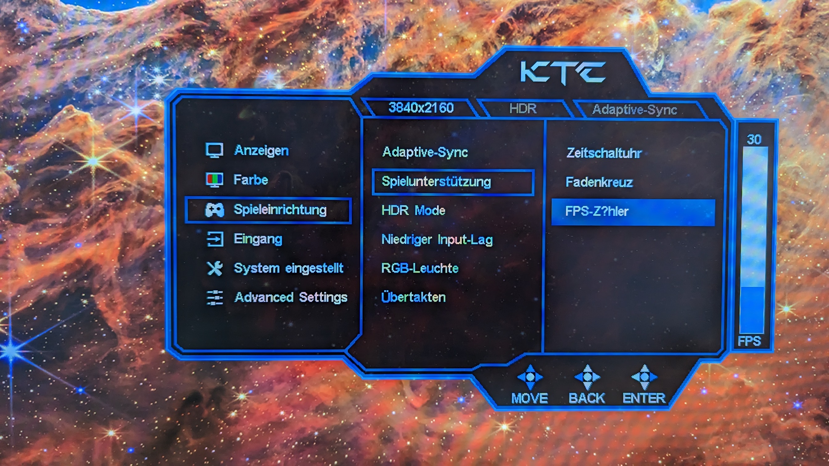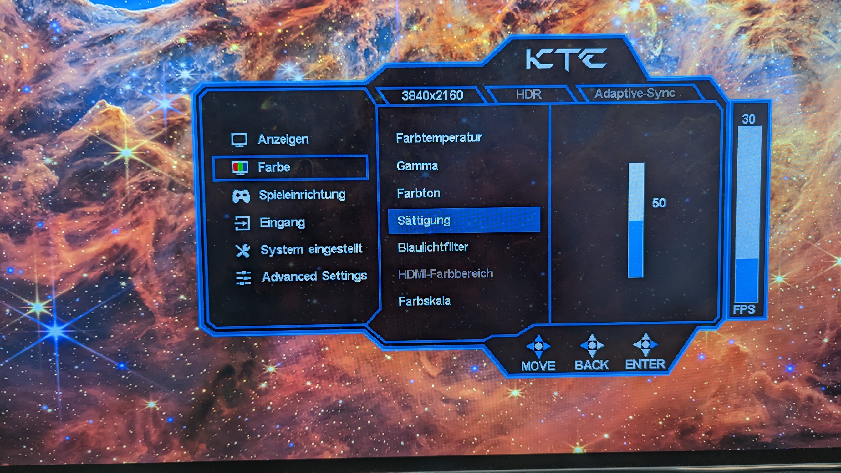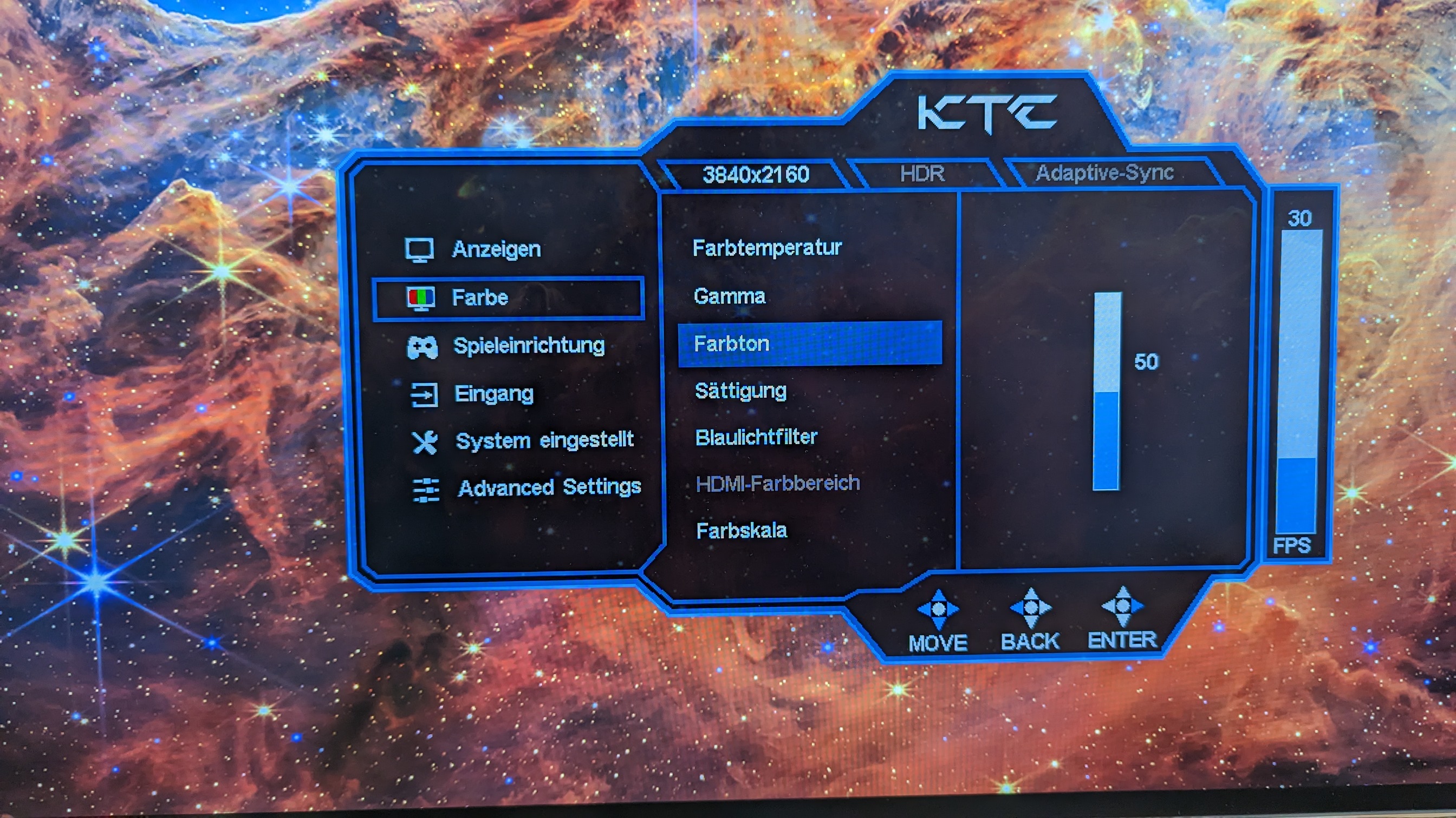 Der KTC G42P5 bietet entweder etwas umständlich direkt am Monitor oder komfortabler über die Fernbedienung zahlreiche Einstellungsmöglichkeiten. Neben eher gewöhnlichen Einstellungen wie Helligkeit, Kontrast und Sättigung kann der Nutzer hier auch den Farbraum wählen. Auch einige Gaming-Features wie ein dauerhaft angezeigtes Fadenkreuz, ein FPS-Zähler und ein Timer steht bereit. Alle Optionen zeigen wir in der Bildergalerie.