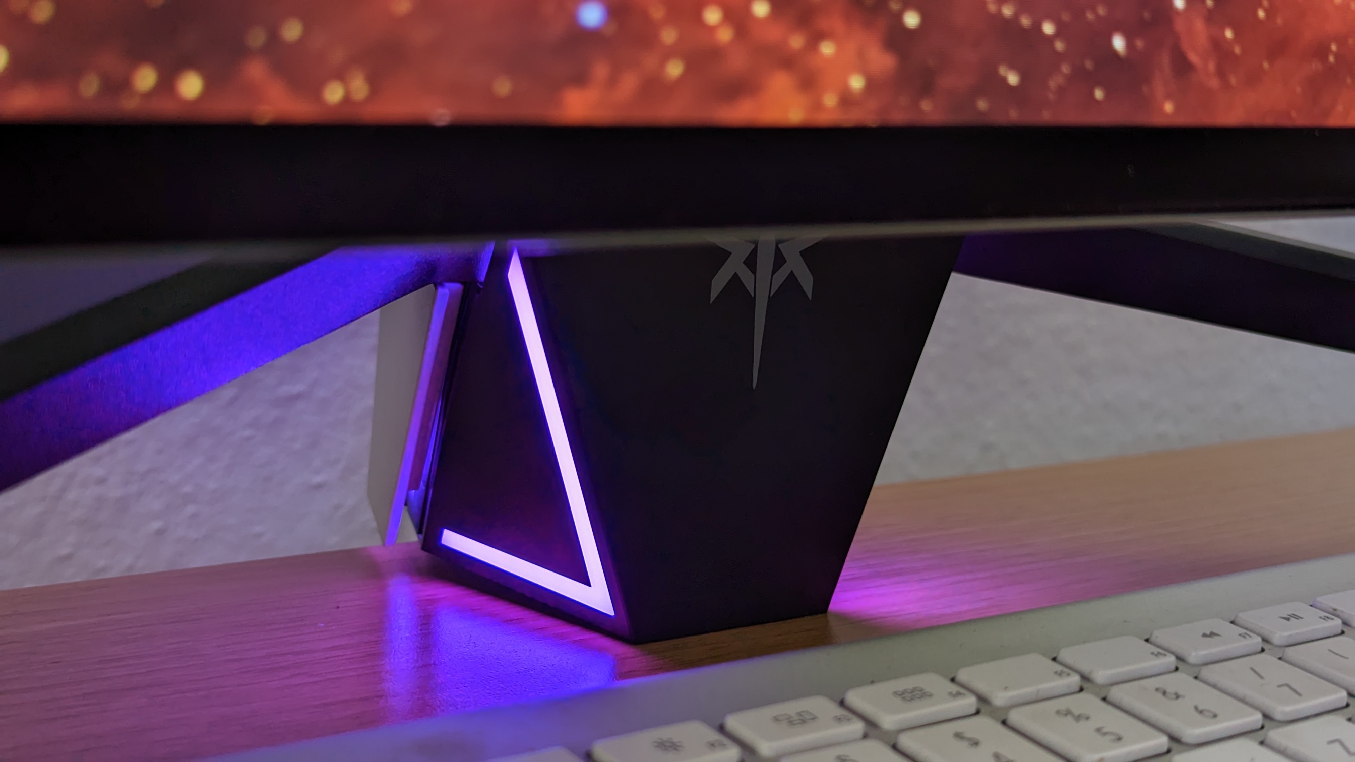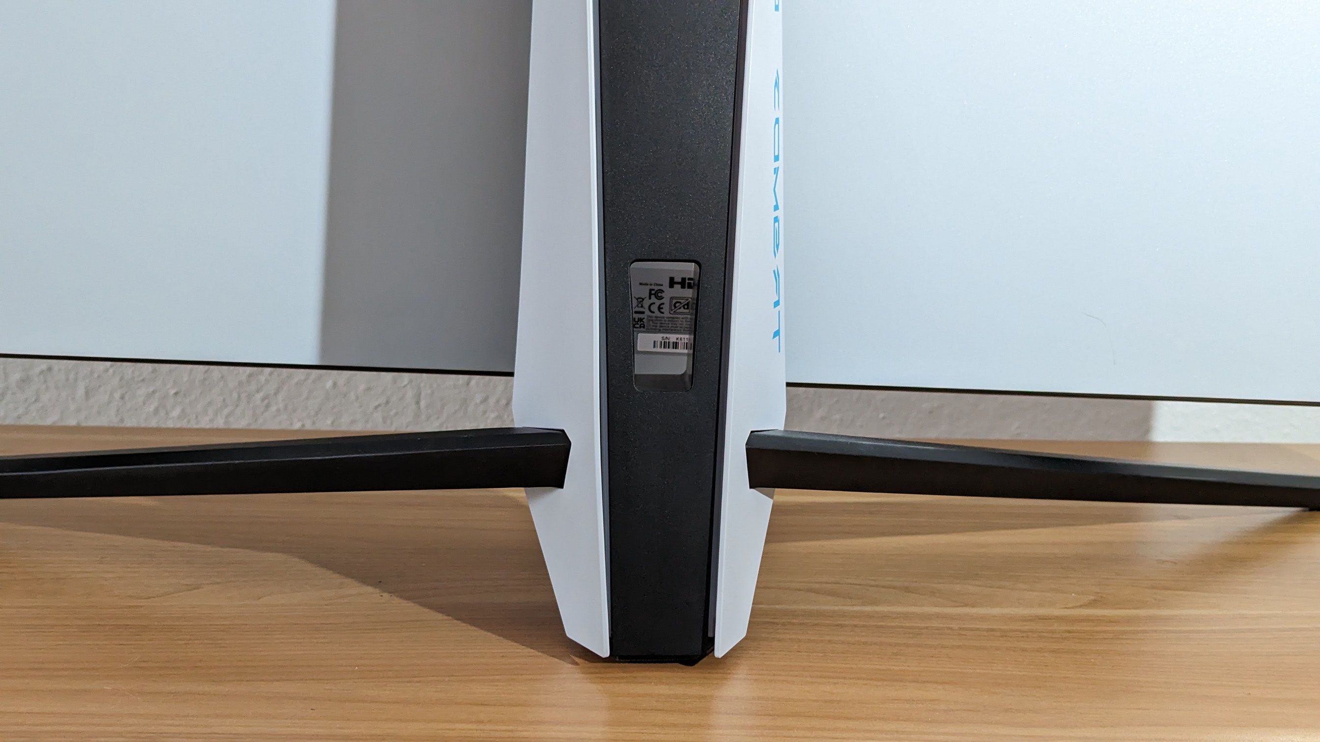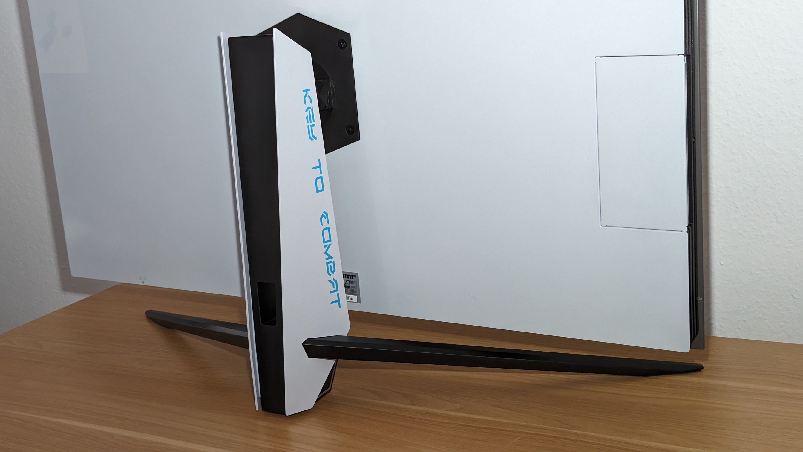 Der Fuß wird im Bundle für einen Aufpreis von 100 Euro mitgeliefert. Wer ihn einzeln kauft, zahlt etwa 150 Euro. Er steht V-förmig auf seinen zwei je etwa 40 cm langen Armen, die auf dem Schreibtisch einiges an Platz wegnehmen. Der Monitor sitzt mittig auf dem dicken, futuristisch designten, grau-schwarzen Steg.
