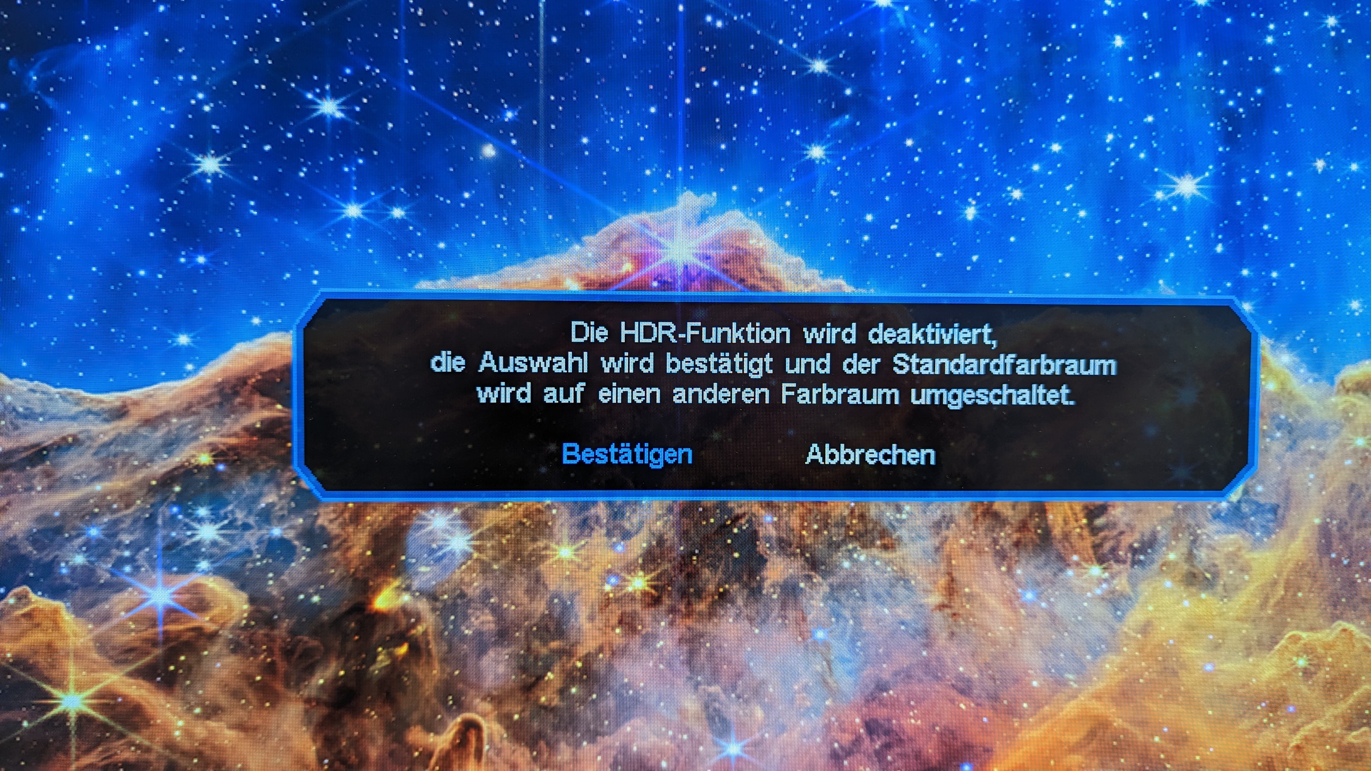 Bezüglich HDR macht dem KTC G42P5 kaum ein anderer Monitor etwas vor. Wir messen in der Spitze eine Helligkeit von knapp 700 Nits – das erreichen LCD- oder Mini-LED-Monitore nicht. In Kombination mit dem echten OLED-Schwarz schafft es der KTC G42P5 auch kleinste helle Objekte aus dem Schwarz erwachsen zu lassen, ohne Blooming oder Halos zu erzeugen. Das wirkt gerade bei Spielen mit hohem Dunkelanteil genial. Allerdings unterstützt der Monitor nur HDR 10 und nicht wie viele andere OLED-TVs auch HLG und Dolby-Vision. In dieser Preiskategorie eine Enttäuschung.
