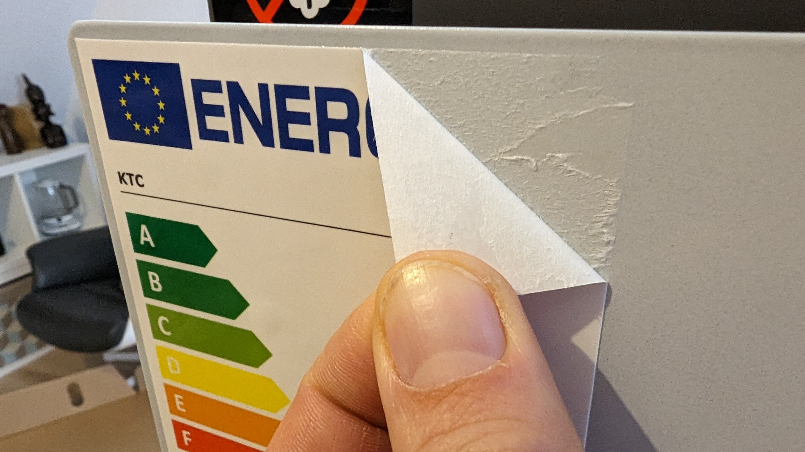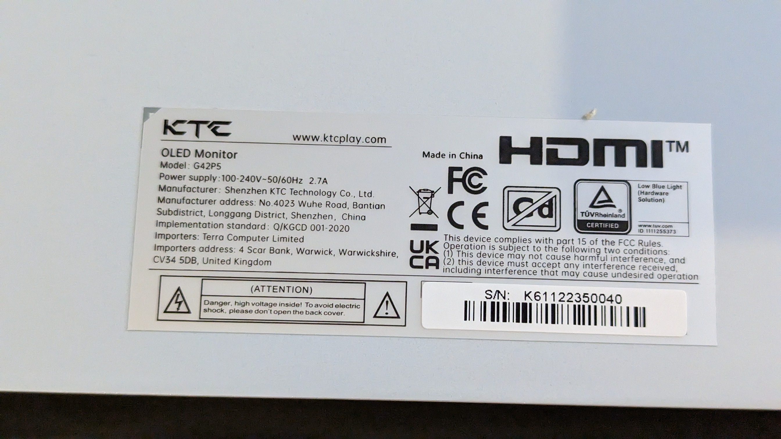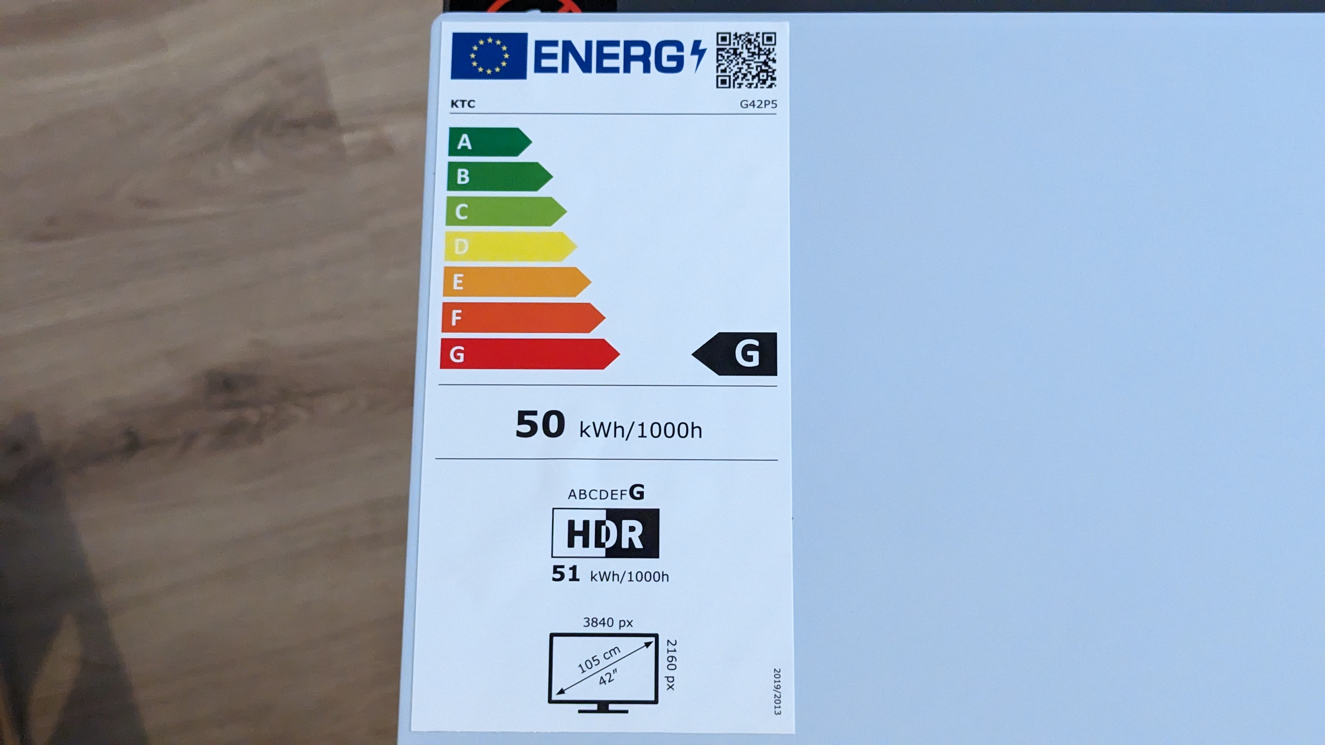 Der KTC G42P5 ist mit 4,3 cm zwar nicht übermäßig dick. Trotzdem hätten wir uns eine dünnere Bauweise gewünscht, gerade wenn man bedenkt, dass das eigentliche OLED-Panel gerade einmal 0,3 cm dick ist. Seine Rückseite wird überwiegend von einer hellgrauen Metallplatte geschützt. Der Aufkleber mit den Energiewerten lässt sich nicht rückstandslos entfernen.