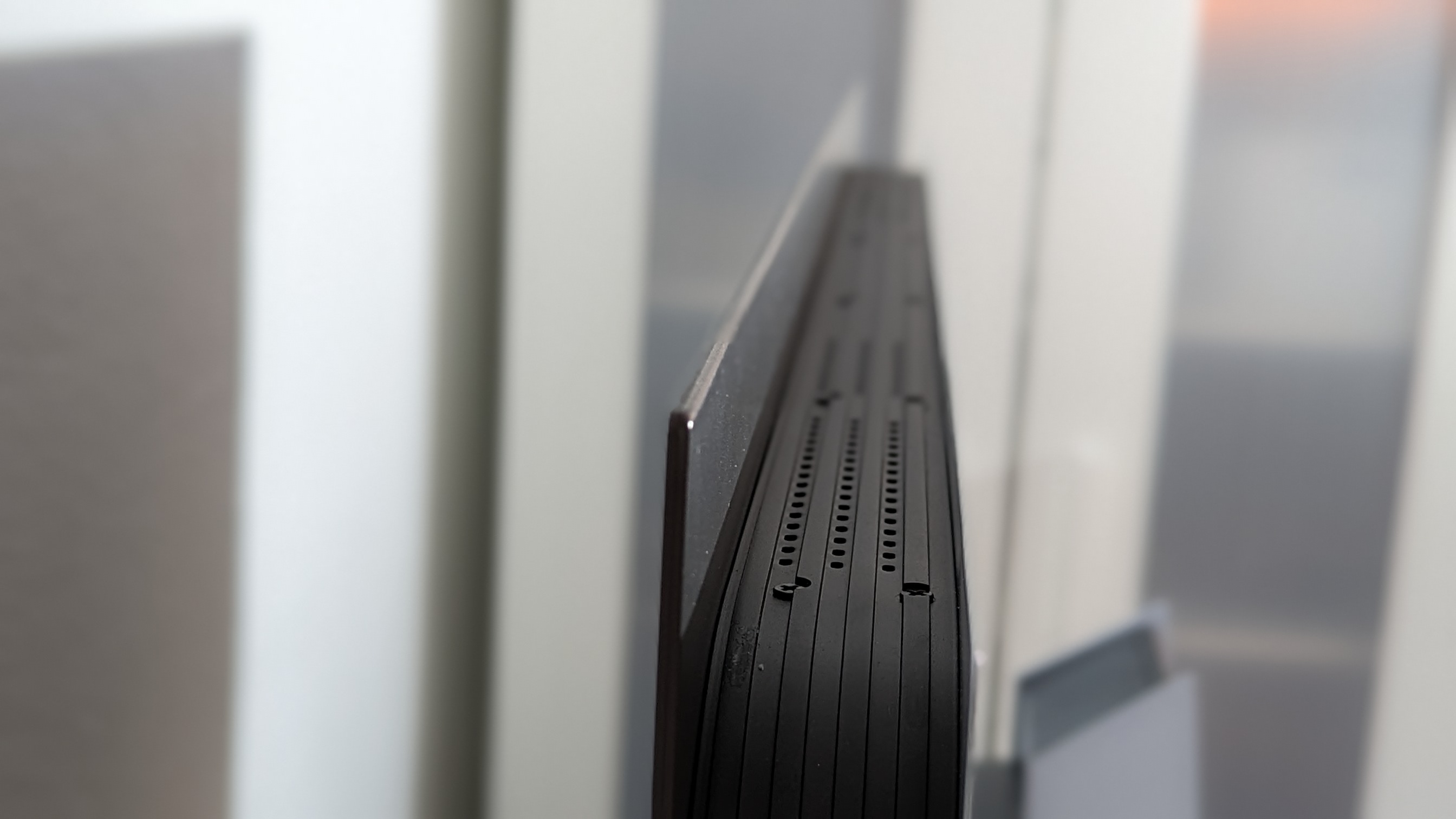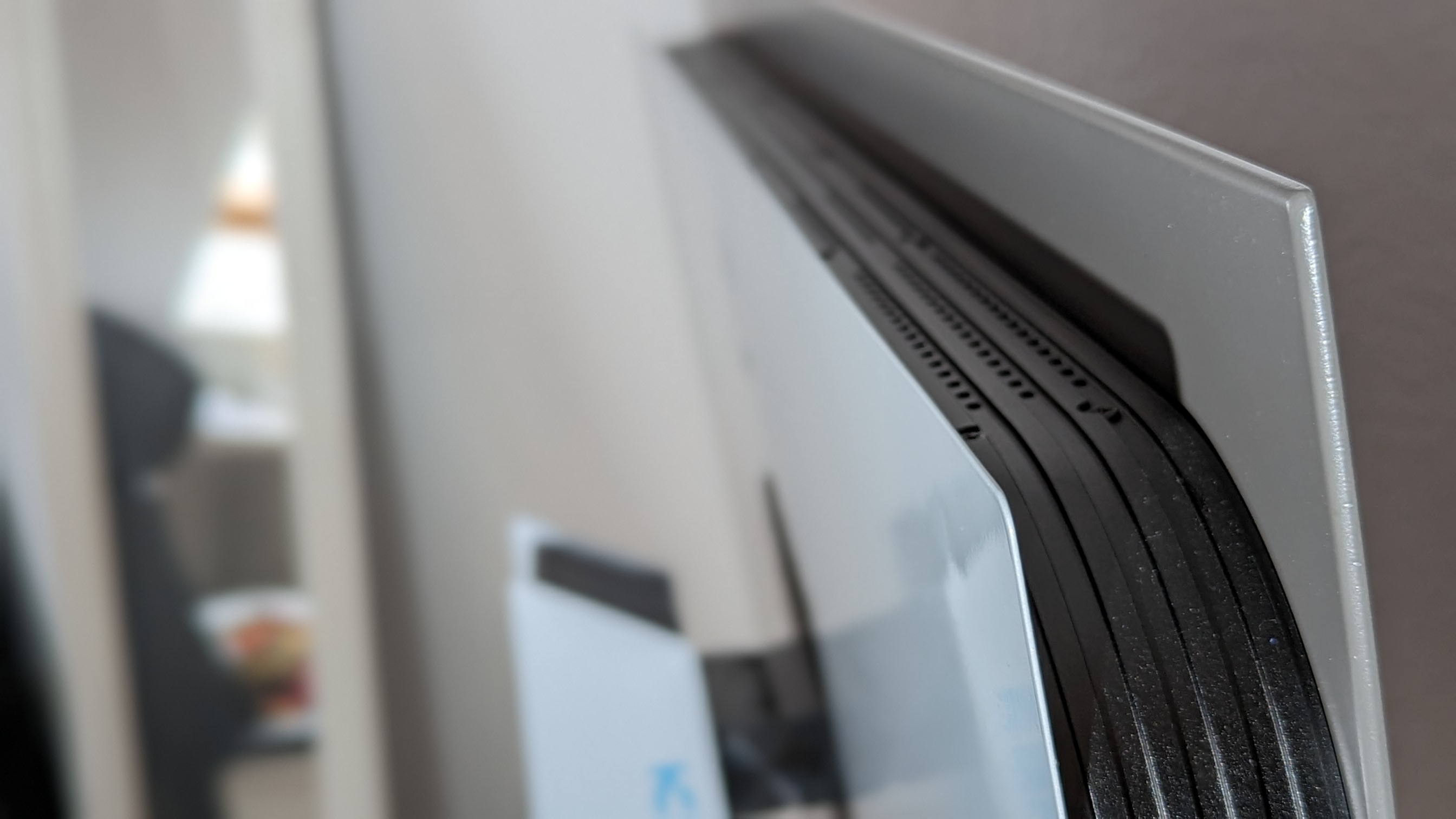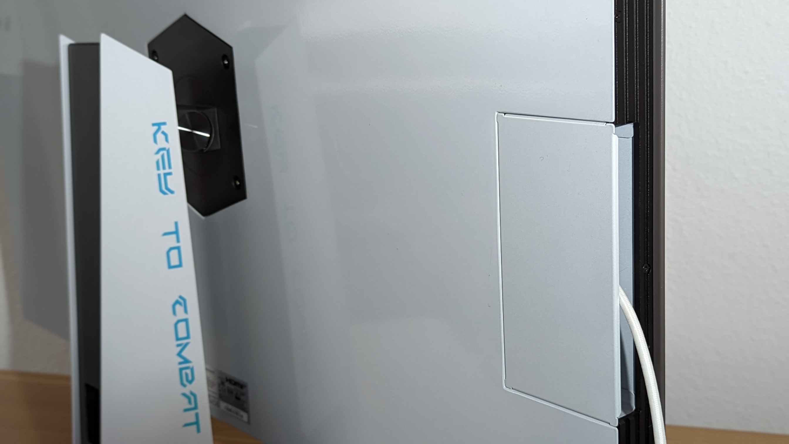 Der KTC G42P5 ist mit 4,3 cm zwar nicht übermäßig dick. Trotzdem hätten wir uns eine dünnere Bauweise gewünscht, gerade wenn man bedenkt, dass das eigentliche OLED-Panel gerade einmal 0,3 cm dick ist. Seine Rückseite wird überwiegend von einer hellgrauen Metallplatte geschützt. Der Aufkleber mit den Energiewerten lässt sich nicht rückstandslos entfernen.