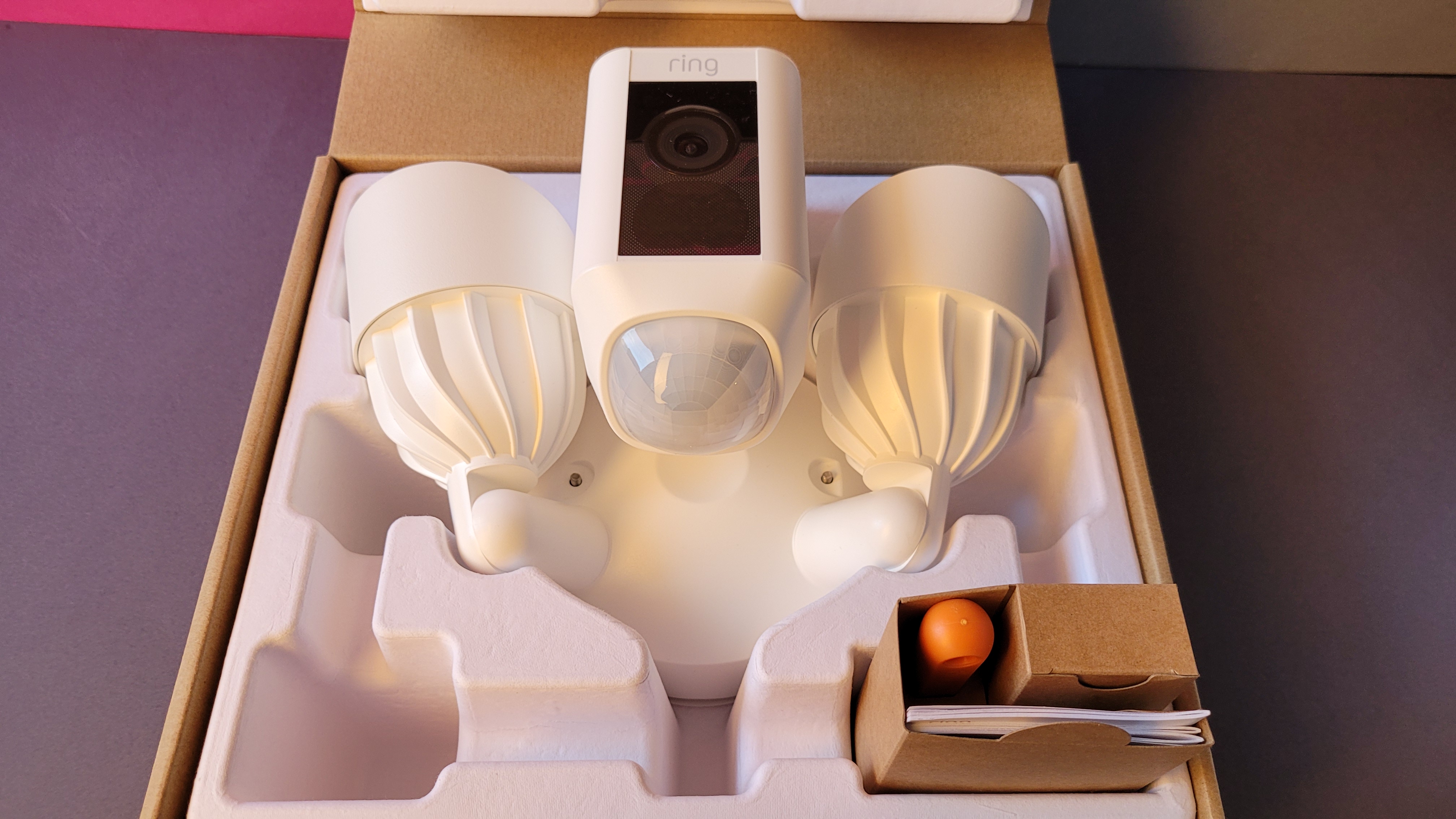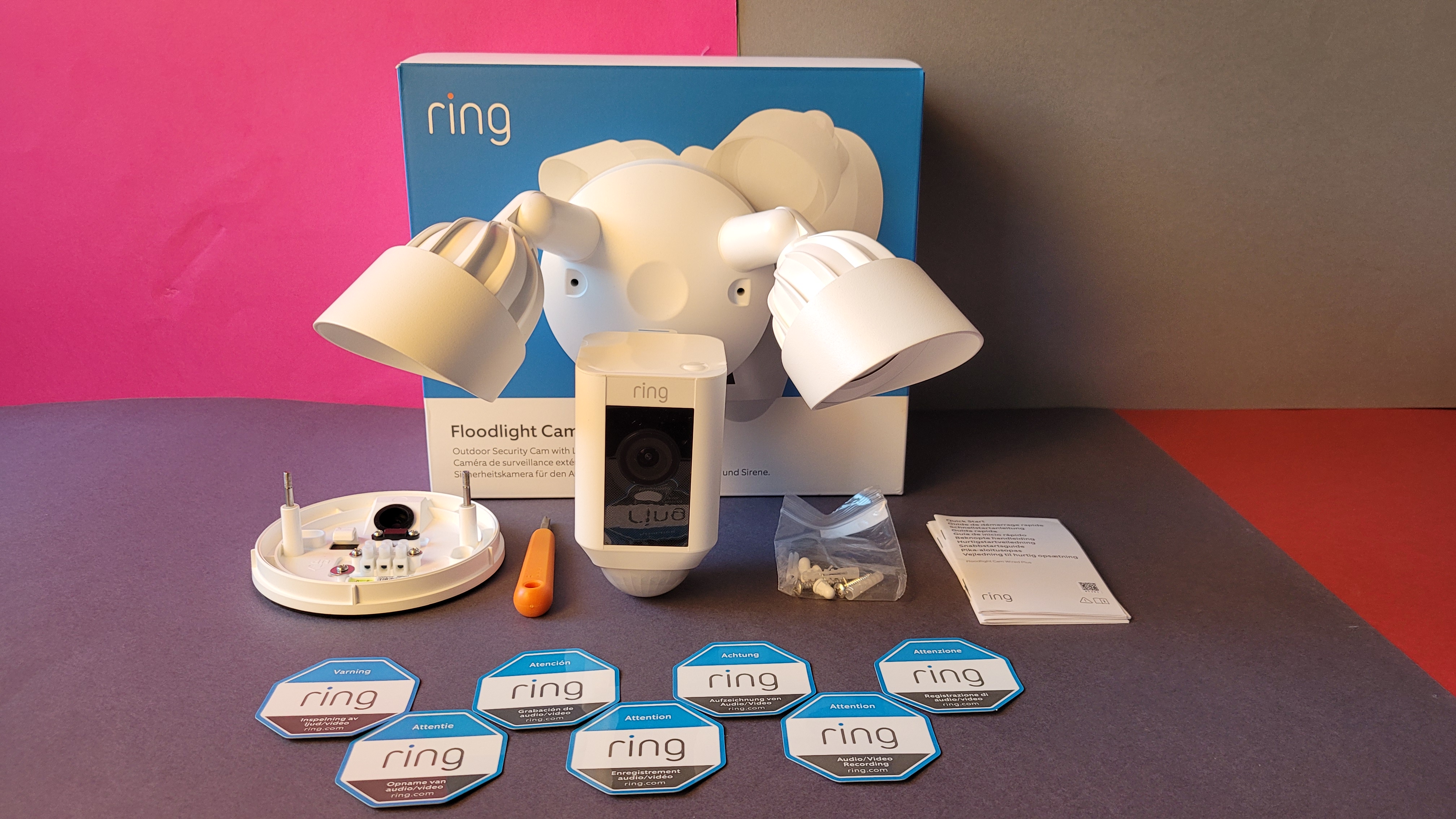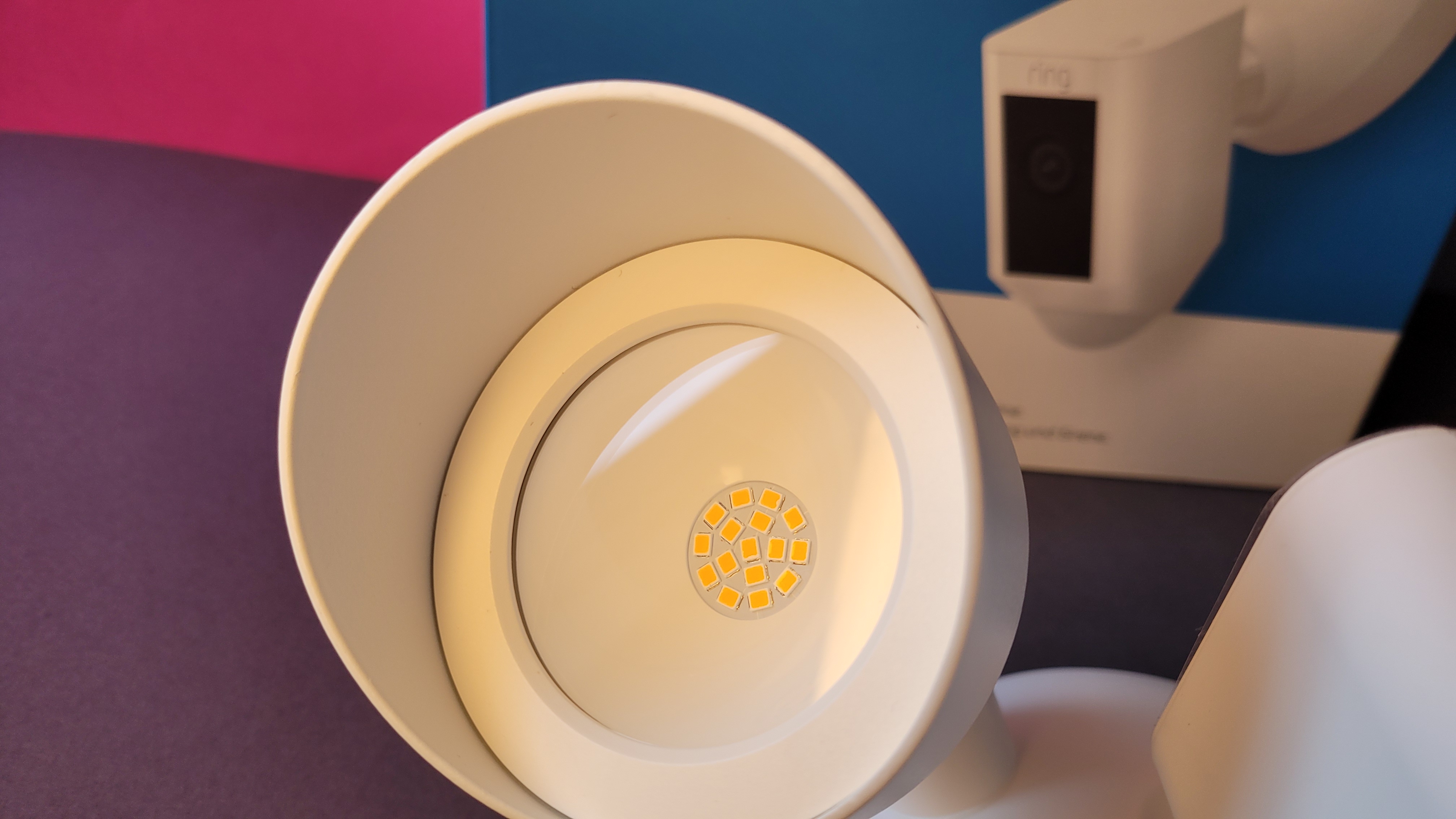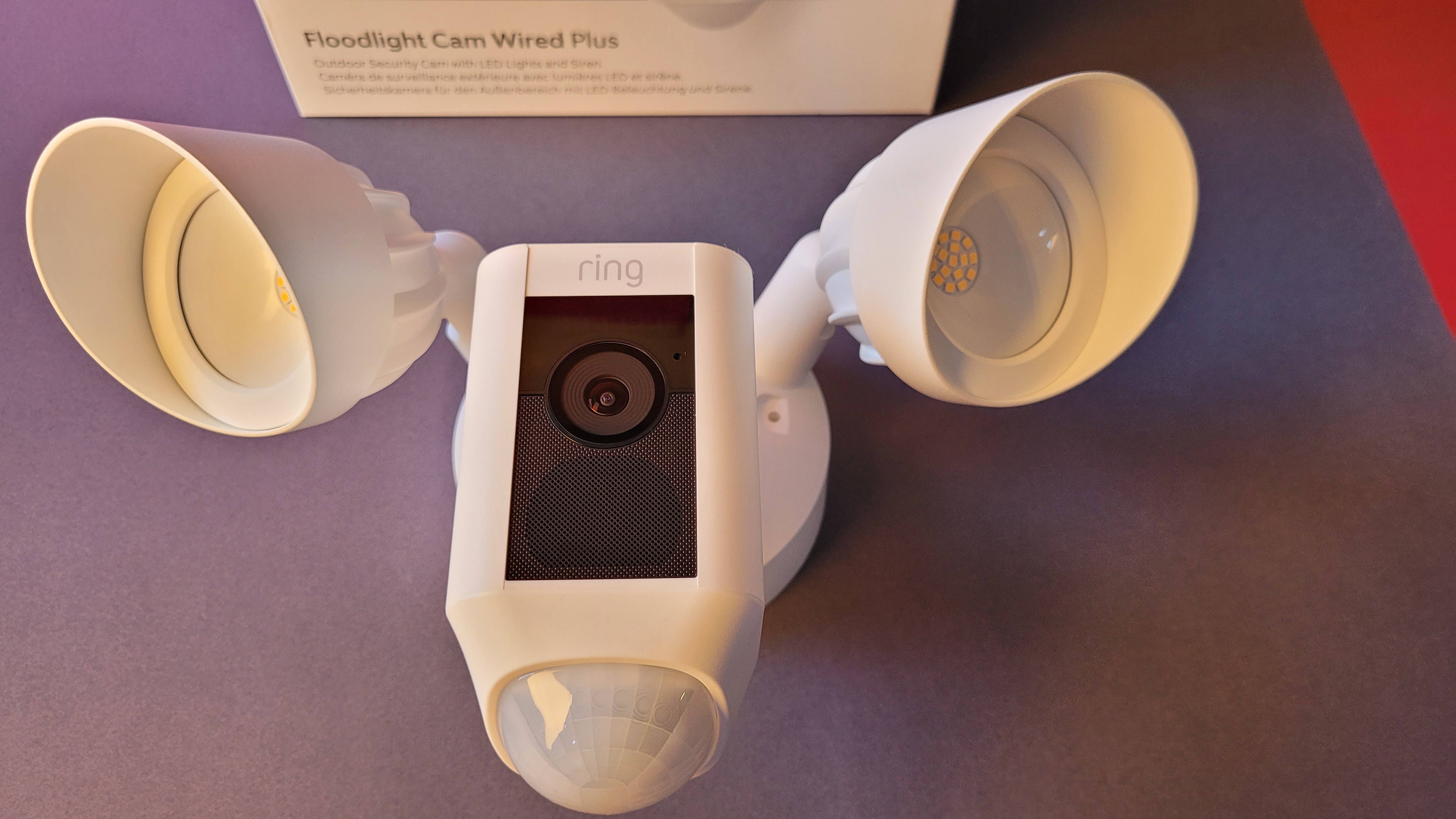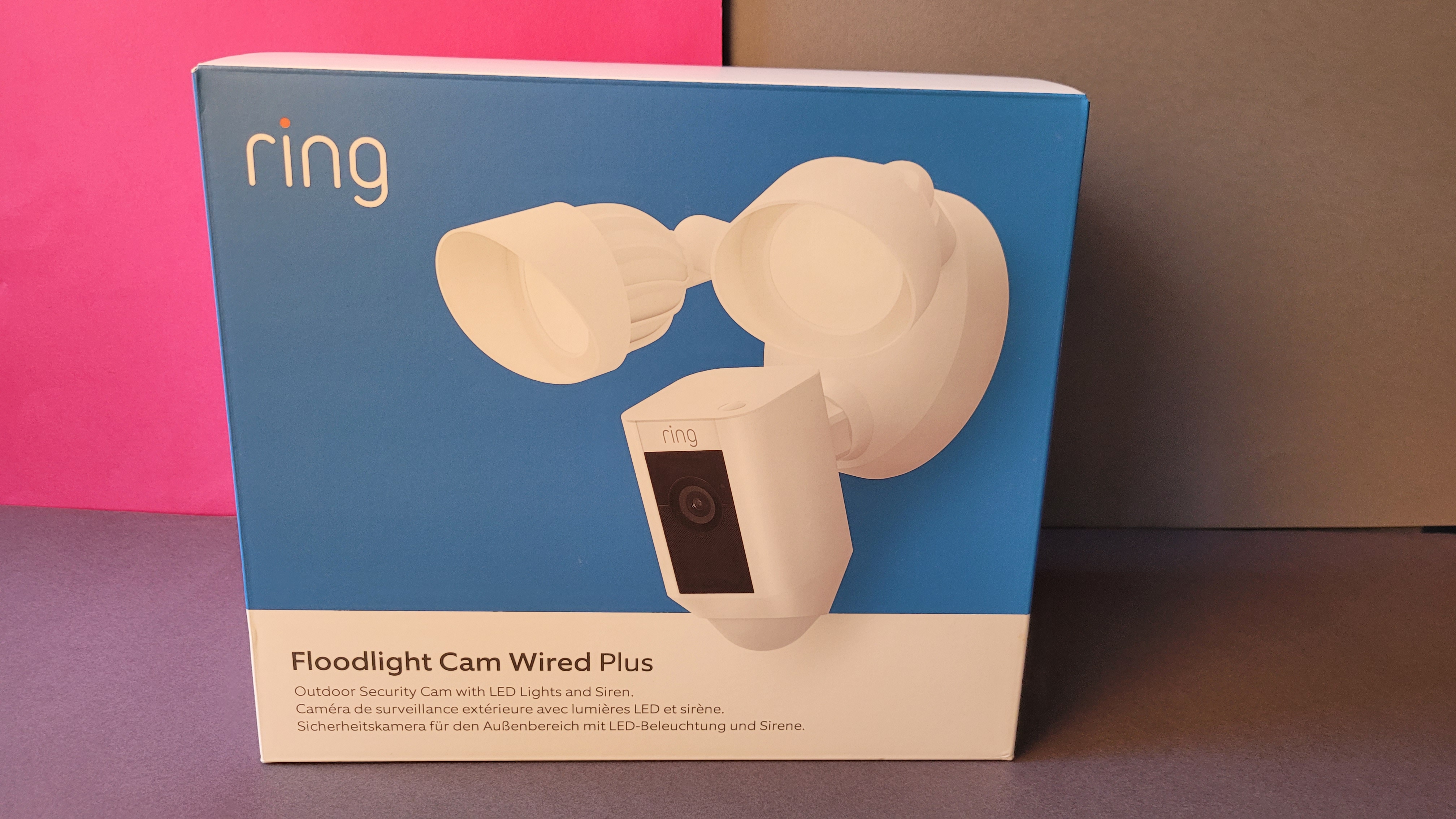 Die Ring Floodlight Cam Wired Plus bietet 2000 Lumen hell strahlende LEDs und farbige Nachtsicht. Sie zeichnet Videos in Full-HD auf, benötigt aber ein Cloud-Abo.
