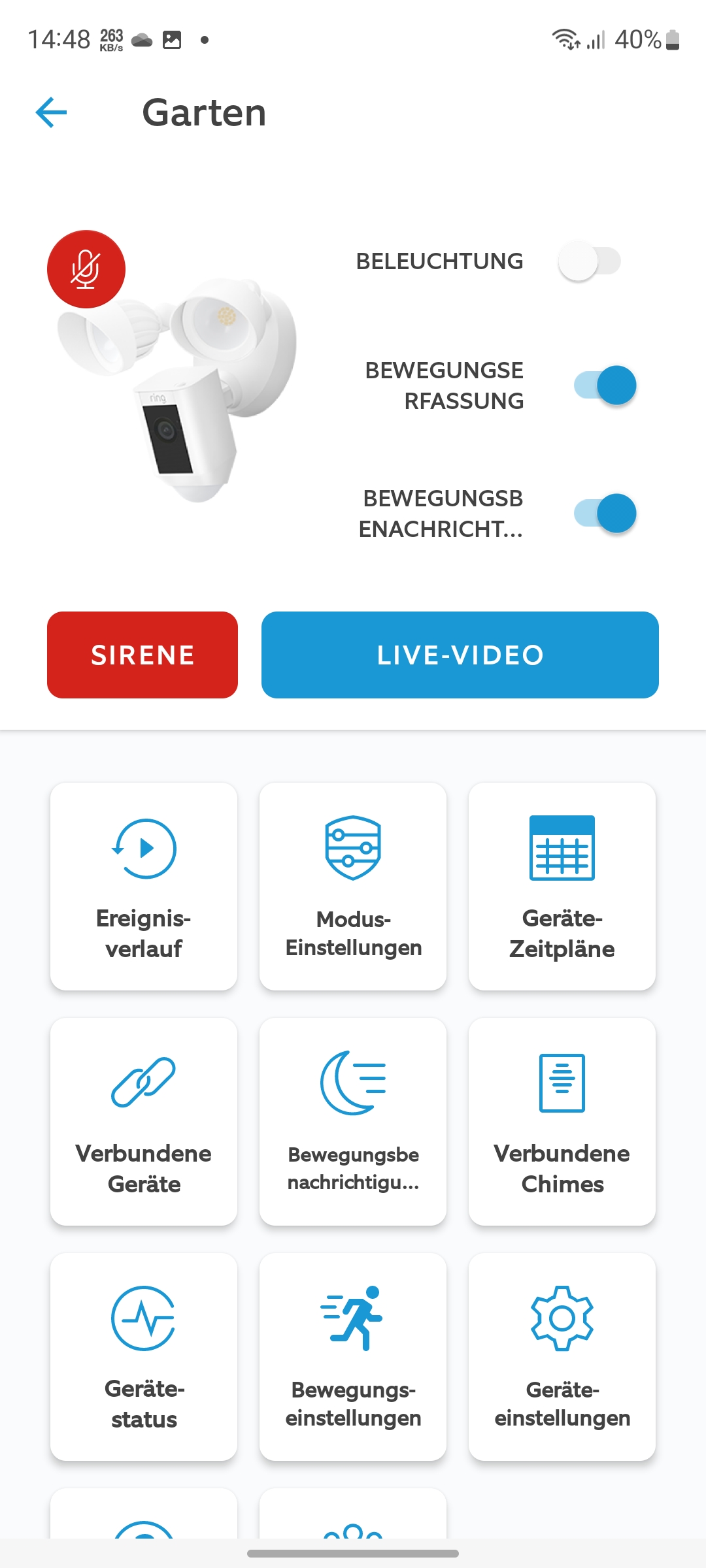 In der Praxis hat die Floodlight Cam Wired Plus zuverlässig funktioniert: Weder gab es Probleme mit der WLAN-Verbindung, noch mit dem Gerät als solchem. Es war jederzeit über die App oder auch per Browser (siehe auch Bildergalerie) nach Anmeldung über ring.com/users/sign_in steuerbar und hat auf Nutzereingaben zügig reagiert. Die App wirkt insgesamt aufgeräumt, in Teilbereichen allerdings etwas überladen. Das Dashboard bietet grundsätzlich eine gute Übersicht, aber die insgesamt 11 Kachel für weitere Bedienmöglichkeiten sind im Alltag etwas viel. Weniger wäre hier mehr.