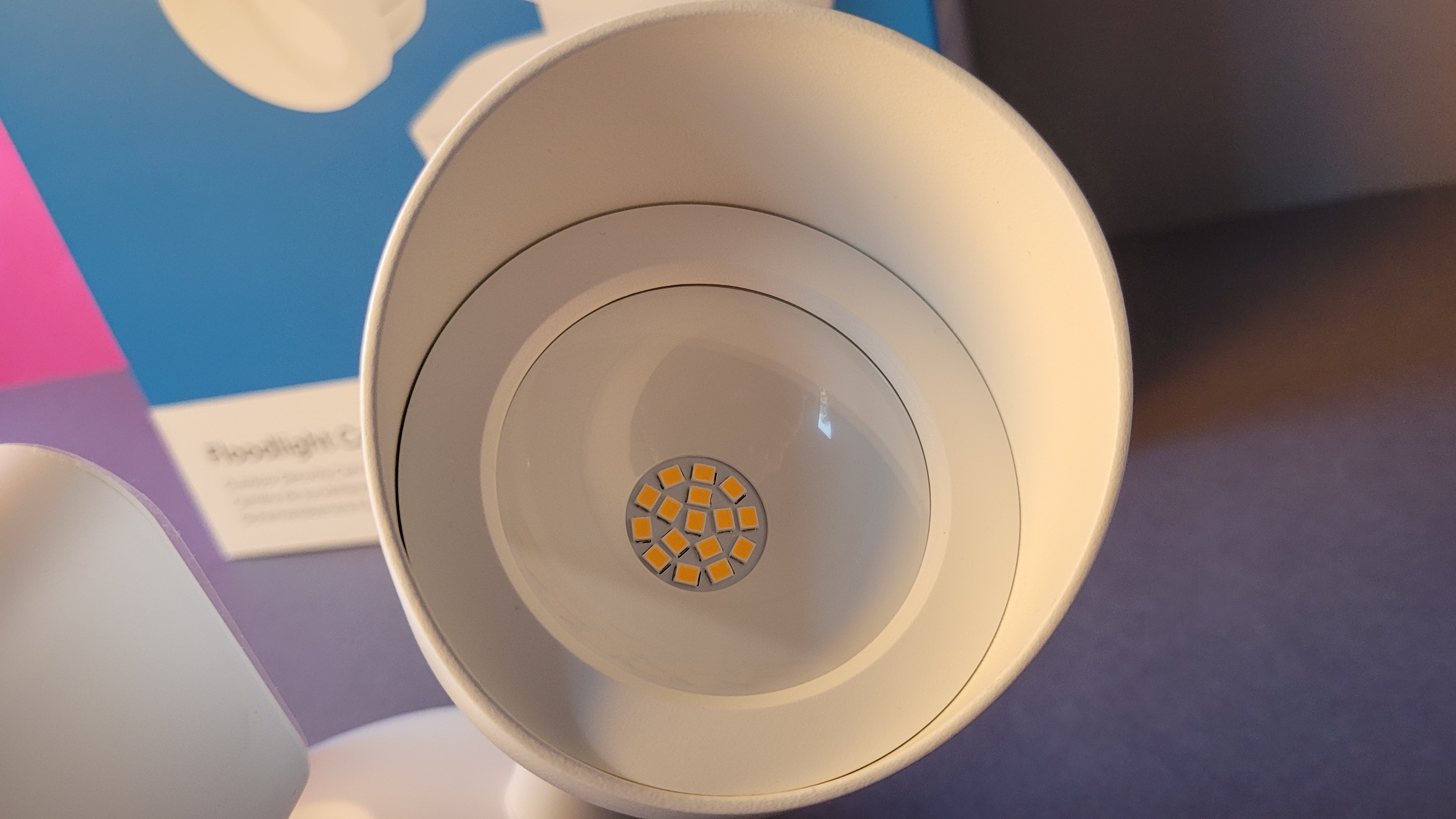 In puncto Aussehen ähnelt die Ring Floodlight Cam Wired Plus der Eufy Floodlight Cam (Testbericht). Die beiden LED-Strahler mit einer Leuchtstärke von 2000 Lumen und einer nicht anpassbaren Farbtemperatur von 3000 K finden im oberen Bereich links und rechts der runden Montagehalterung mit einem Durchmesser von zwölf Zentimetern Platz. Die Kamera befindet sich in einem quaderförmigen Gehäuse mit einer nach unten ausgerichteten Kuppel in der Mitte am unteren Rand. Dort ist nicht nur die Technik der Full-HD-Kamera untergebracht, sondern auch der Bewegungsmelder mit einem Auslösebereich von 270 Grad, sowie Mikrofon und Lautsprecher für die Gegensprechfunktion. Der Lautsprecher dient auch als Sirene, die bei einem Abstand von 10 Zentimeter eine Lautstärke von 105 dB erreicht.