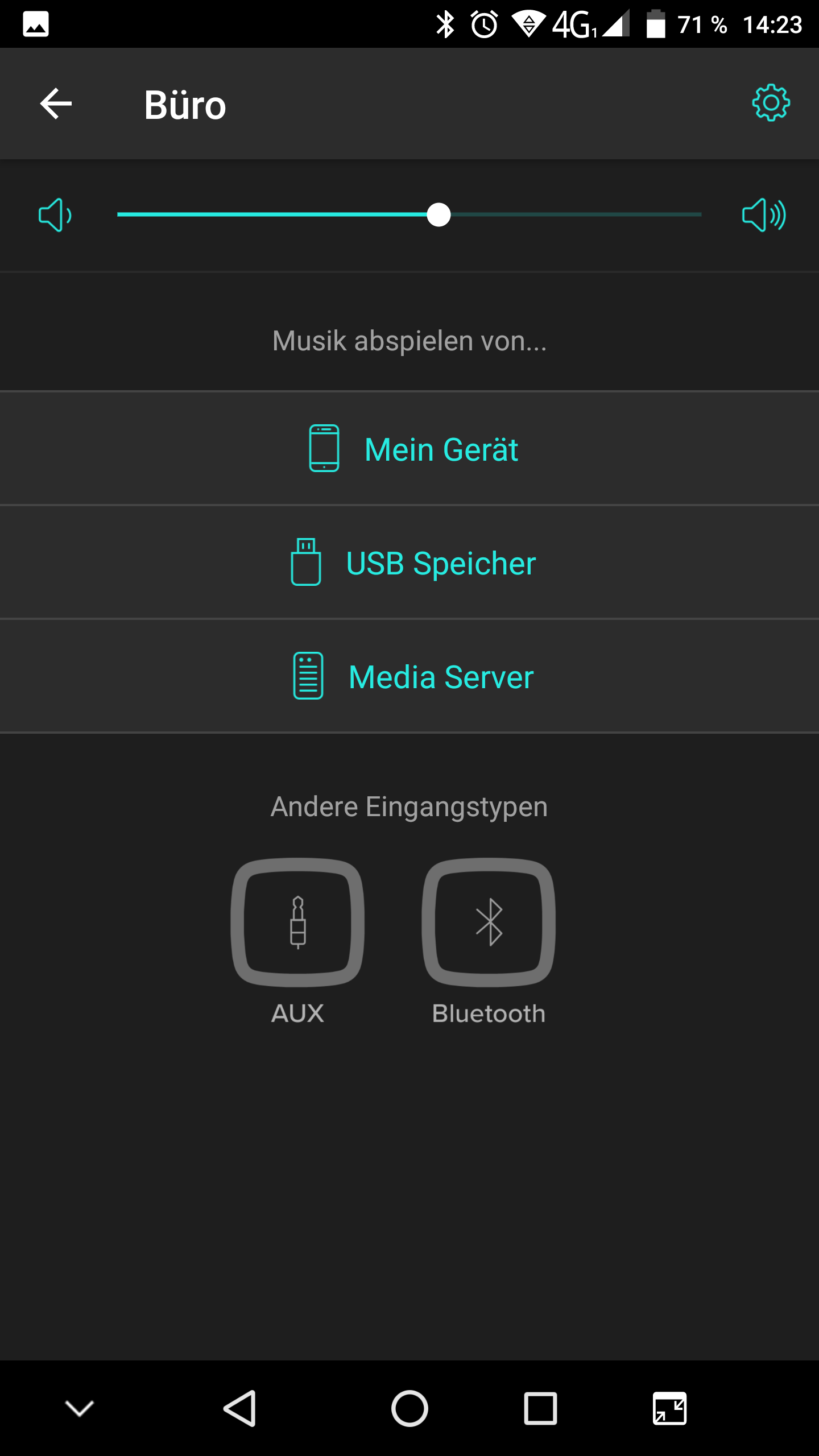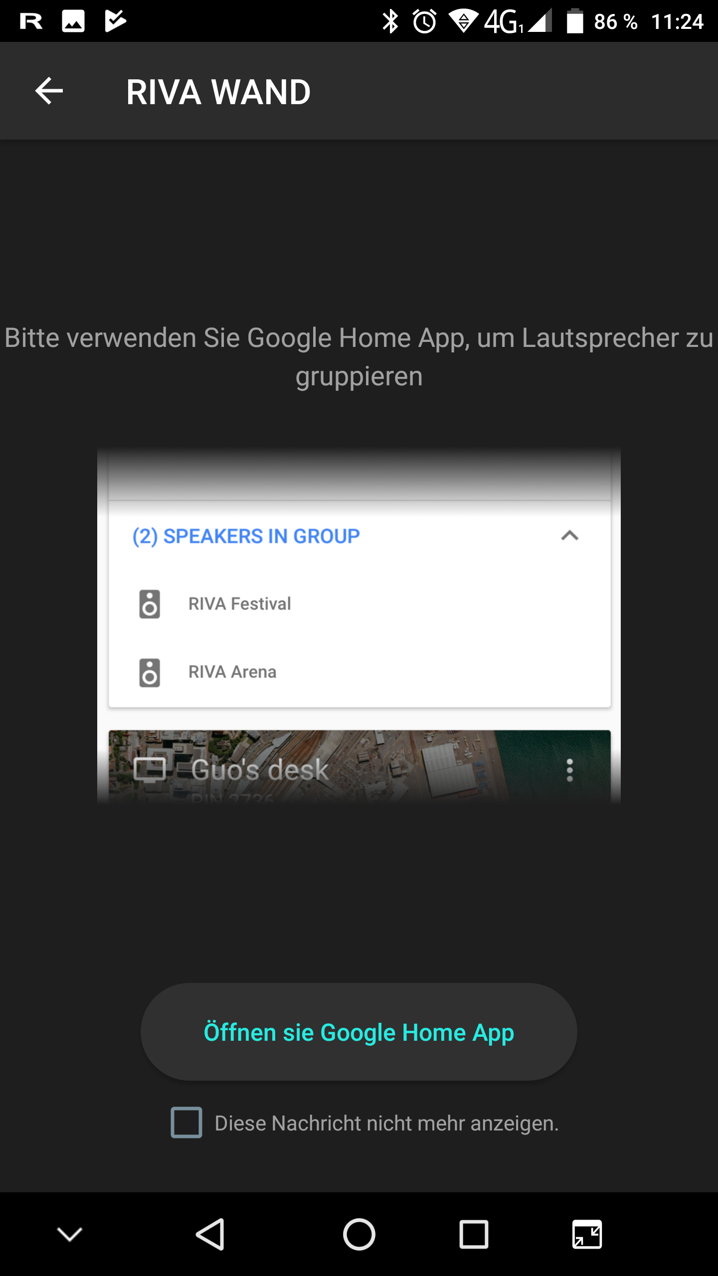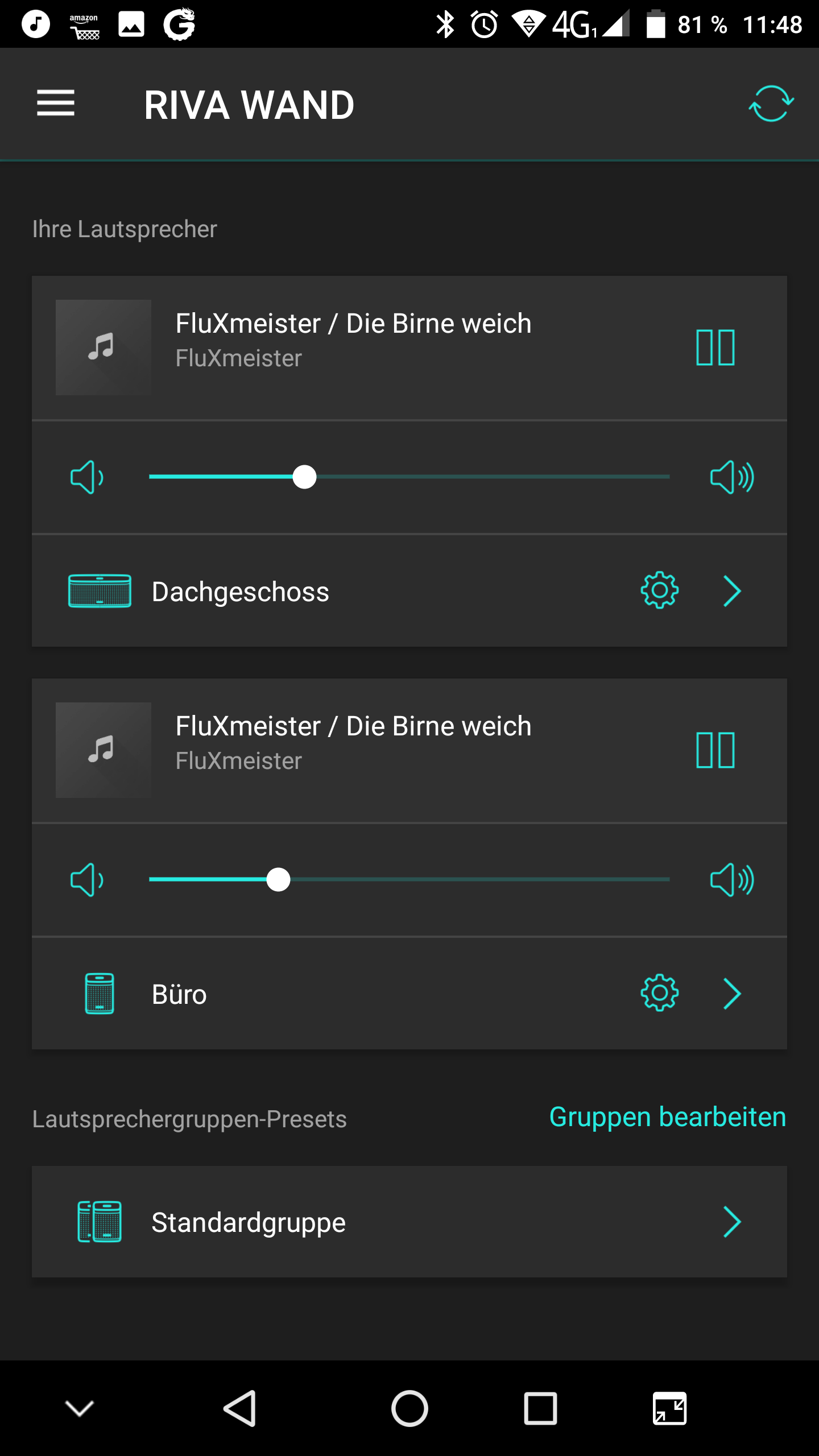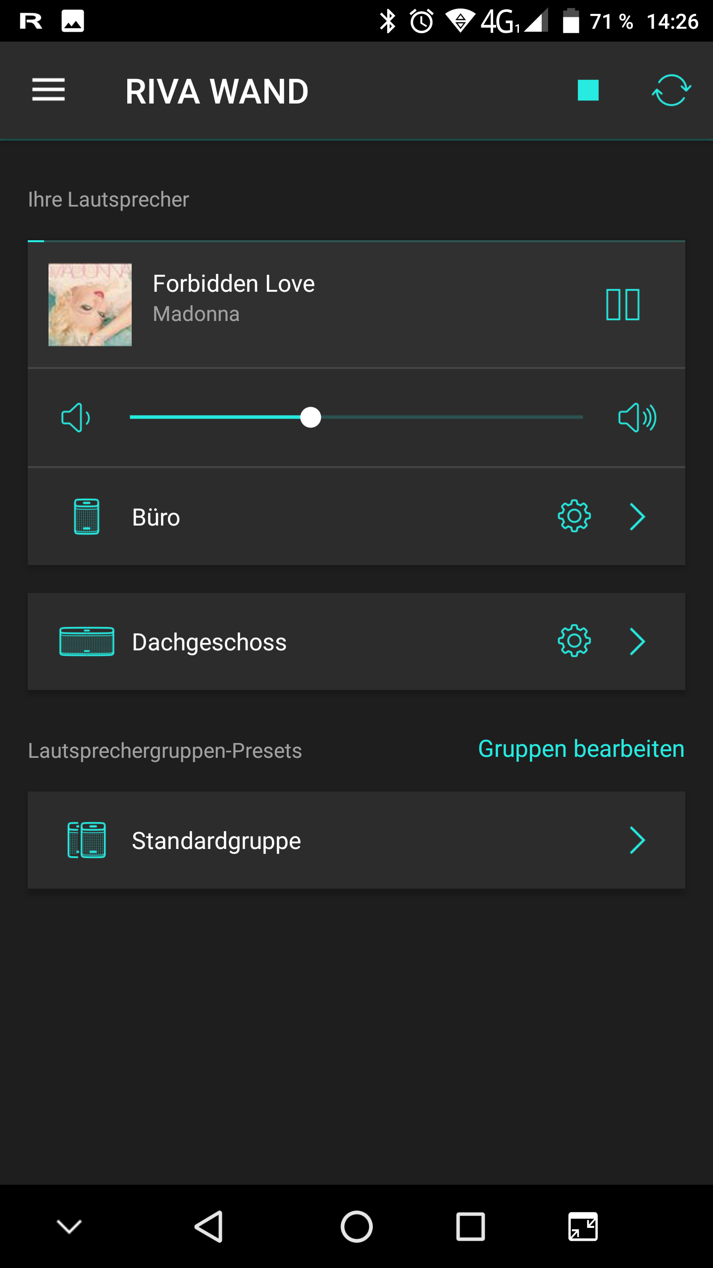 Die Ersteinrichtung geschieht über Google Chromecast, also die Google-Home-App. iOS-Nutzer können das auch per AirPlay erledigen. Im Test war die Einrichtung über die Google Home schnell erledigt. Um Gruppen von mehreren Lautsprechern zu bilden, muss der Nutzer die App von Google verwenden, angelegte Gruppen sind dann aber auch in der Riva-Wand-App anwählbar. Zur Wiedergabe von Streaming-Medien wird innerhalb der entsprechenden App über das Google-Cast-Icon die gewünschte Gruppe oder der gewünschte Speaker ausgewählt. Innerhalb der Riva-Wand-App finden sich die Optionen Musik abspielen von ... Mein Gerät , USB Speicher , Media Server , AUX und Bluetooth . Die Bedienung des Systems mit den beiden Apps ging uns im Test gut von der Hand.