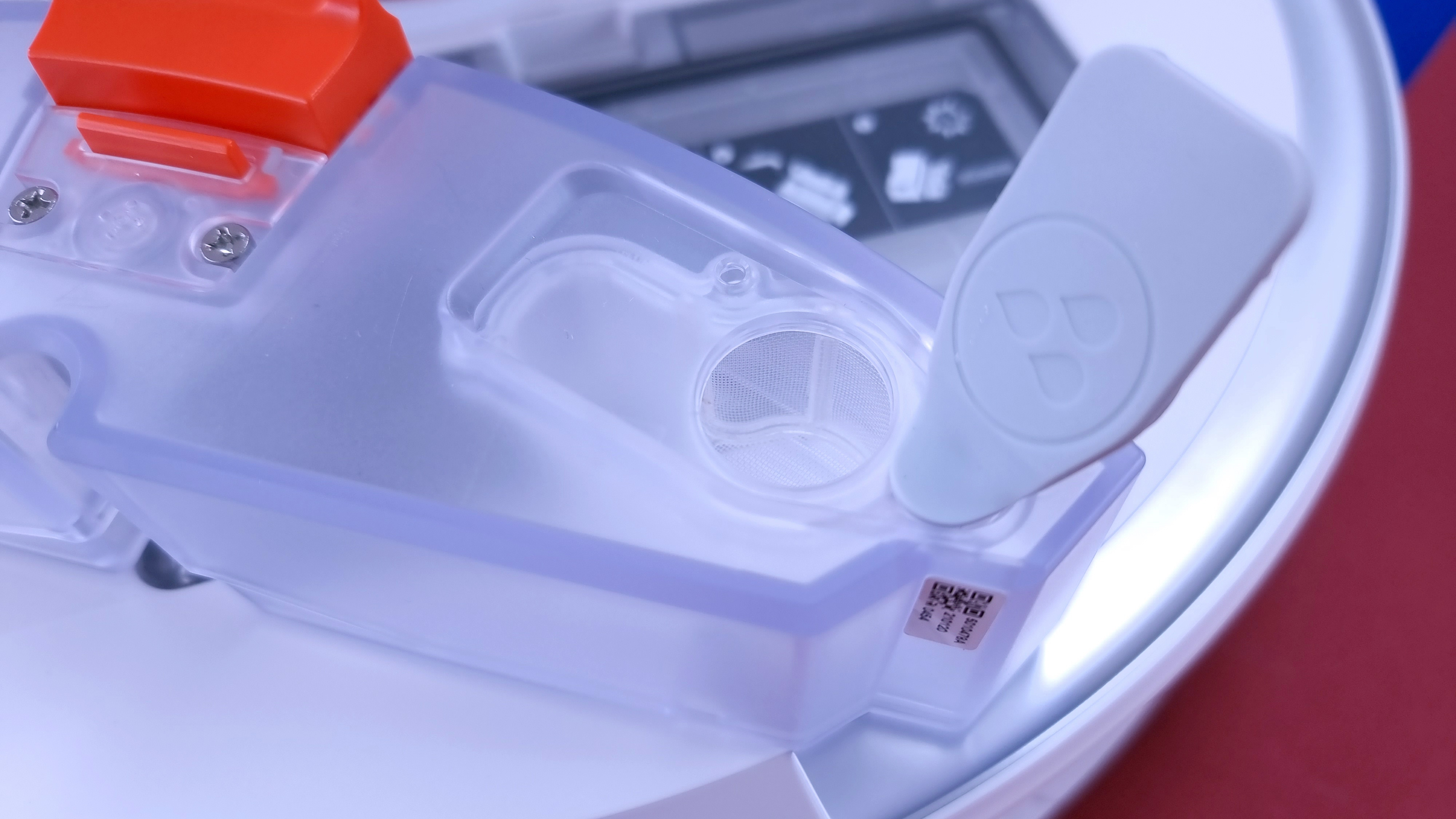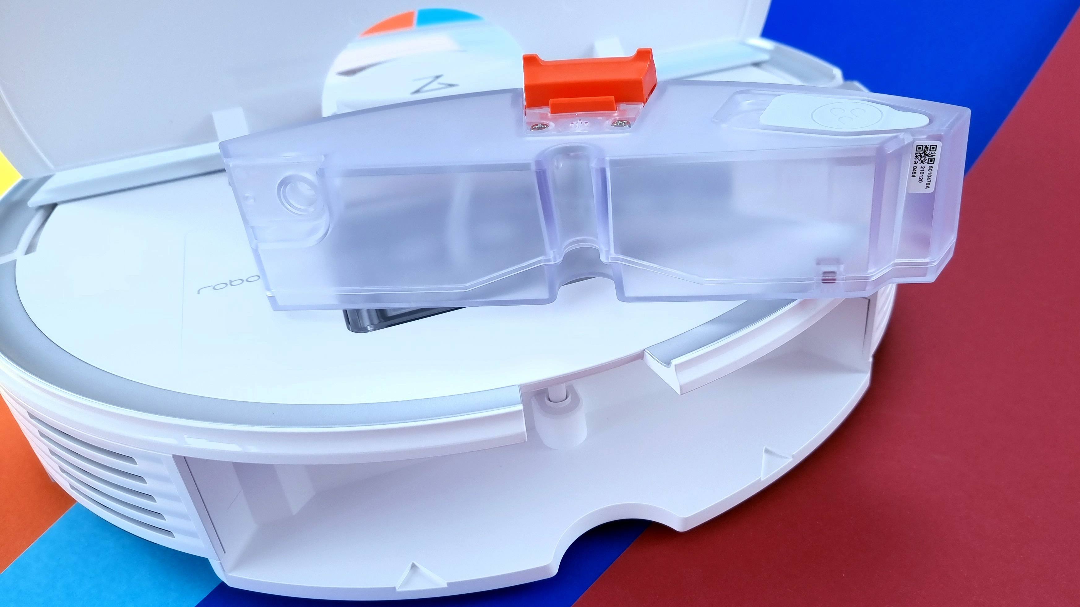 Neu ist der Wassertank des Roborock S7. Während er bei den Vorgängern Bestandteil der Wischplatte war, die hinten unter die Roboter geclippst wurde, wird er jetzt hinten in den Roboter eingeschoben und nimmt dessen ganzen hinteren Teil ein.