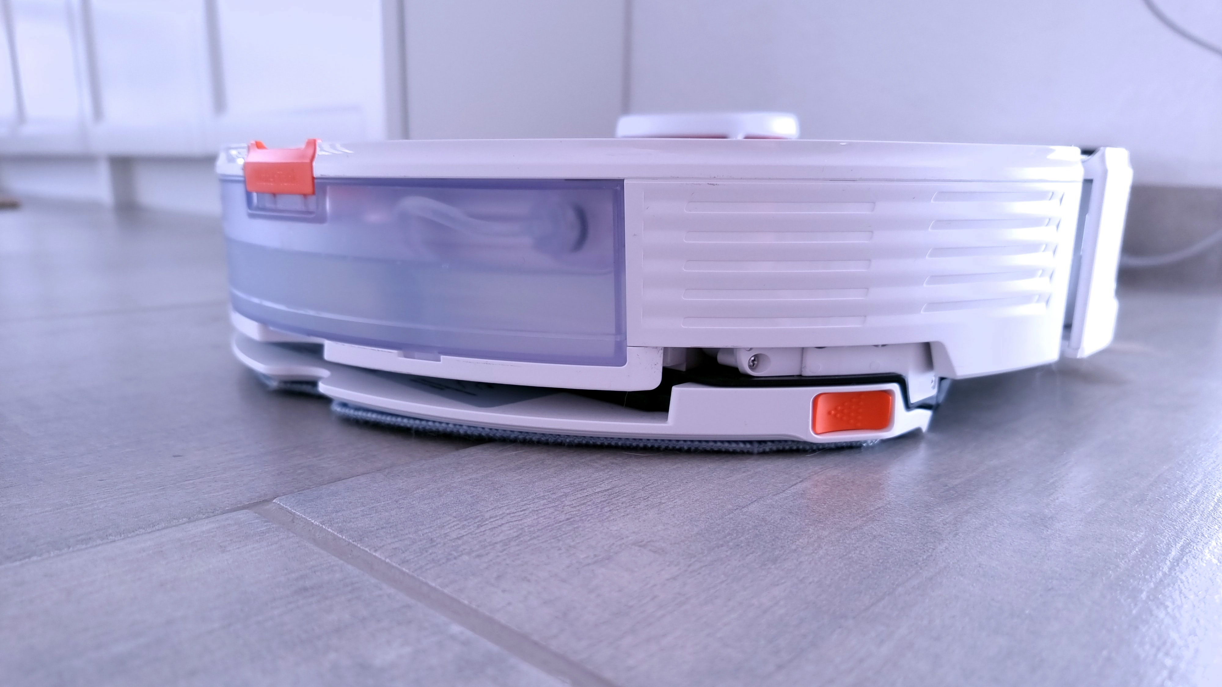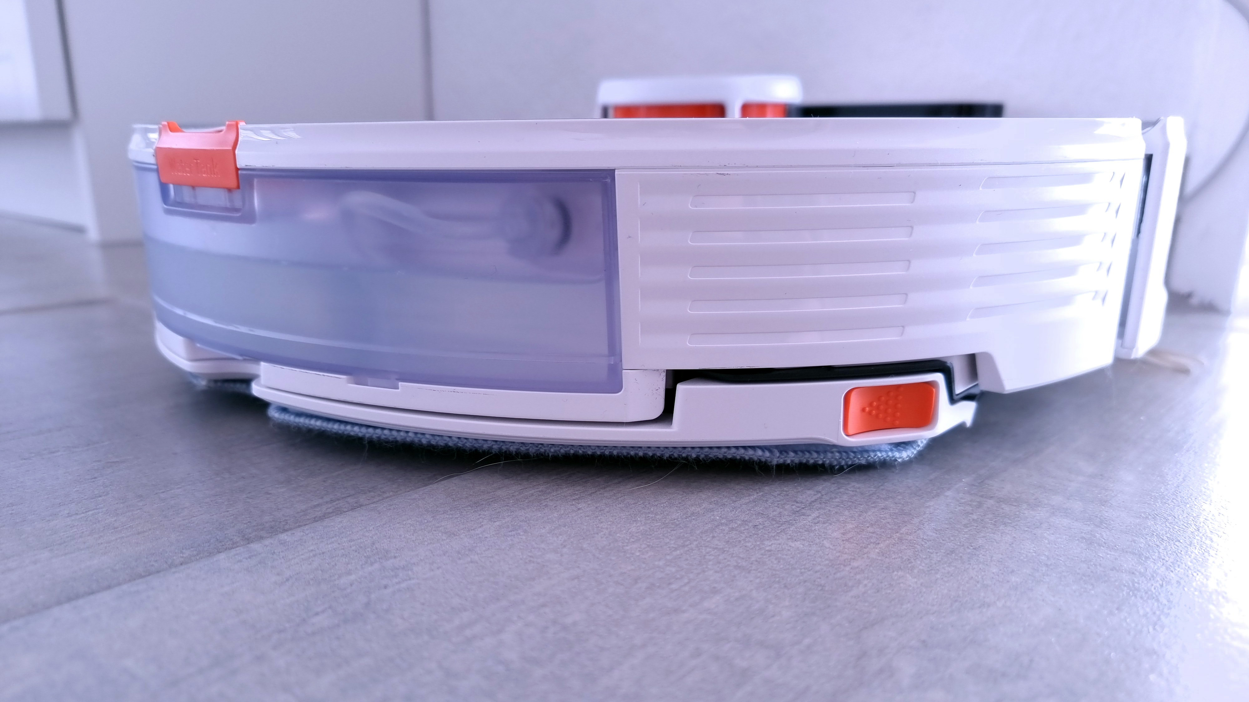 Ansonsten ist fast alles wie gehabt: Befährt der Sauger einen Teppich, erhöht er die Saugleistung. Neu ist das Anheben der Wischvorrichtung namens Vibra Rise. Der Roboter hebt dabei die gesamte Wischvorrichtung samt Mikrofasertuch um 5 Millimeter hoch. Das reicht zwar auf hochflorigen Teppichen nicht ganz, damit das potenziell feuchte Tuch nicht wenigstens noch ein paar Fasern berührt, auf niedrigflorigem Teppich hingegen schon. Dann wird nicht nur der Teppich nicht feucht, der Bot fährt sich auch nicht fest, weil er mit dem Tuch zu stark aufsetzt und so hoher Widerstand entsteht. Das erklärt das “Rise” in Vibra Rise – und Vibra? Das bezieht sich auf hochfrequente Bewegungen der Wischplatte, die für besseres Schmutzlösen sorgen soll – dazu später mehr.
