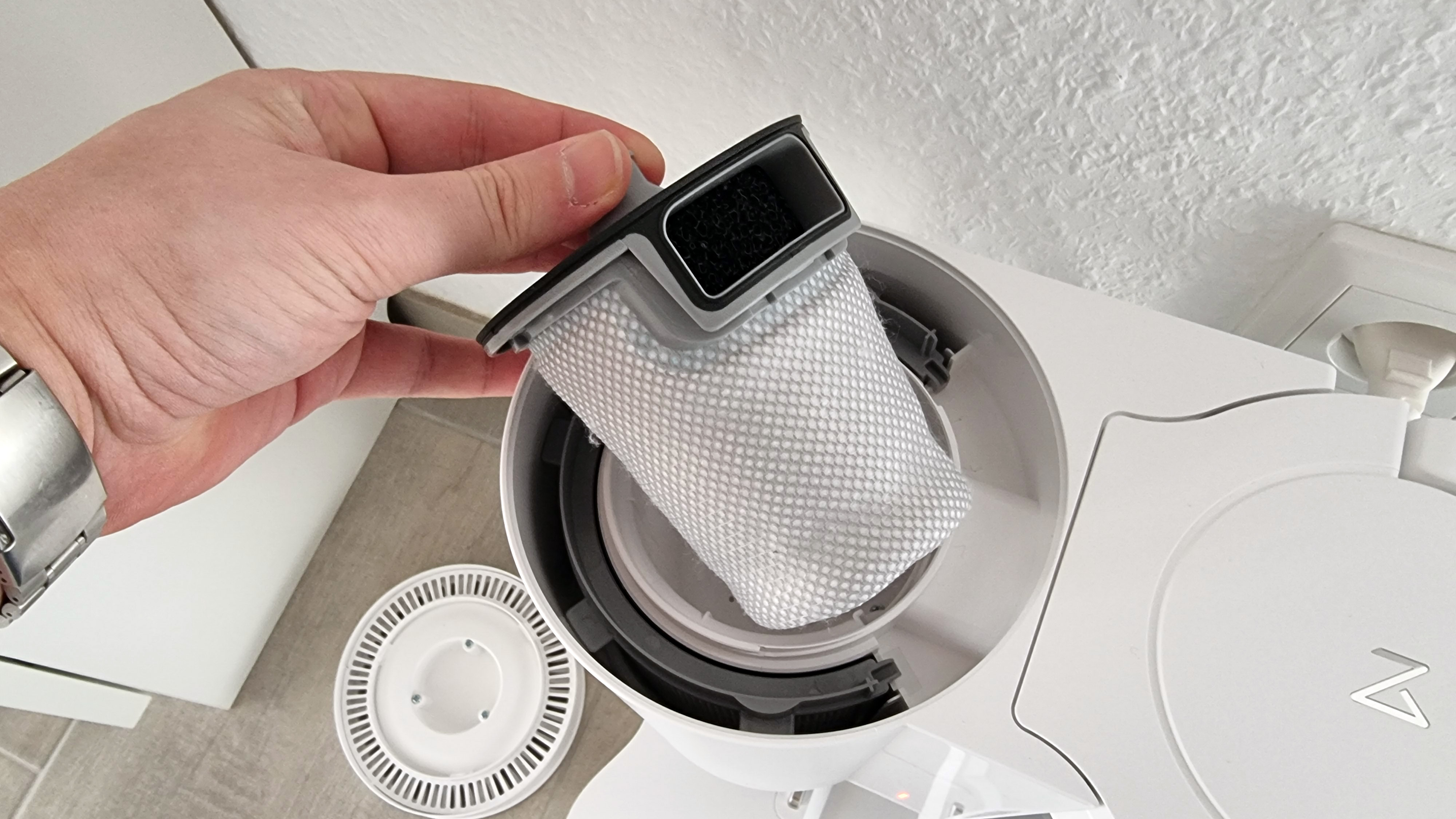 Dafür muss zuvor der Zykloneinsatz durch eine Drehbewegung herausgeschraubt und der Beuteleinsatz eingeschraubt werden. Auf diesem Wege lässt sich auch der Zykloneinsatz säubern, auf Wunsch auch mit Wasser. Anschließend ist auf vollständige Trocknung des Grobfilters zu achten. Der Feinfilter, der sich ebenfalls von oben aus dem linken Teil der Station entnehmen lässt, kann ebenfalls ausgewaschen oder ausgetauscht werden. Insgesamt soll die Absaugstation 99,99 Prozent aller Partikel mit 0,3 Mikrometer oder mehr einfangen, darunter auch Pollen. Das macht das Modell zusammen mit der Beutelnutzung noch interessanter für Allergiker. Der Staubbeutel verschließt sich bei Entnahme selbständig und ist zudem antibakteriell beschichtet.