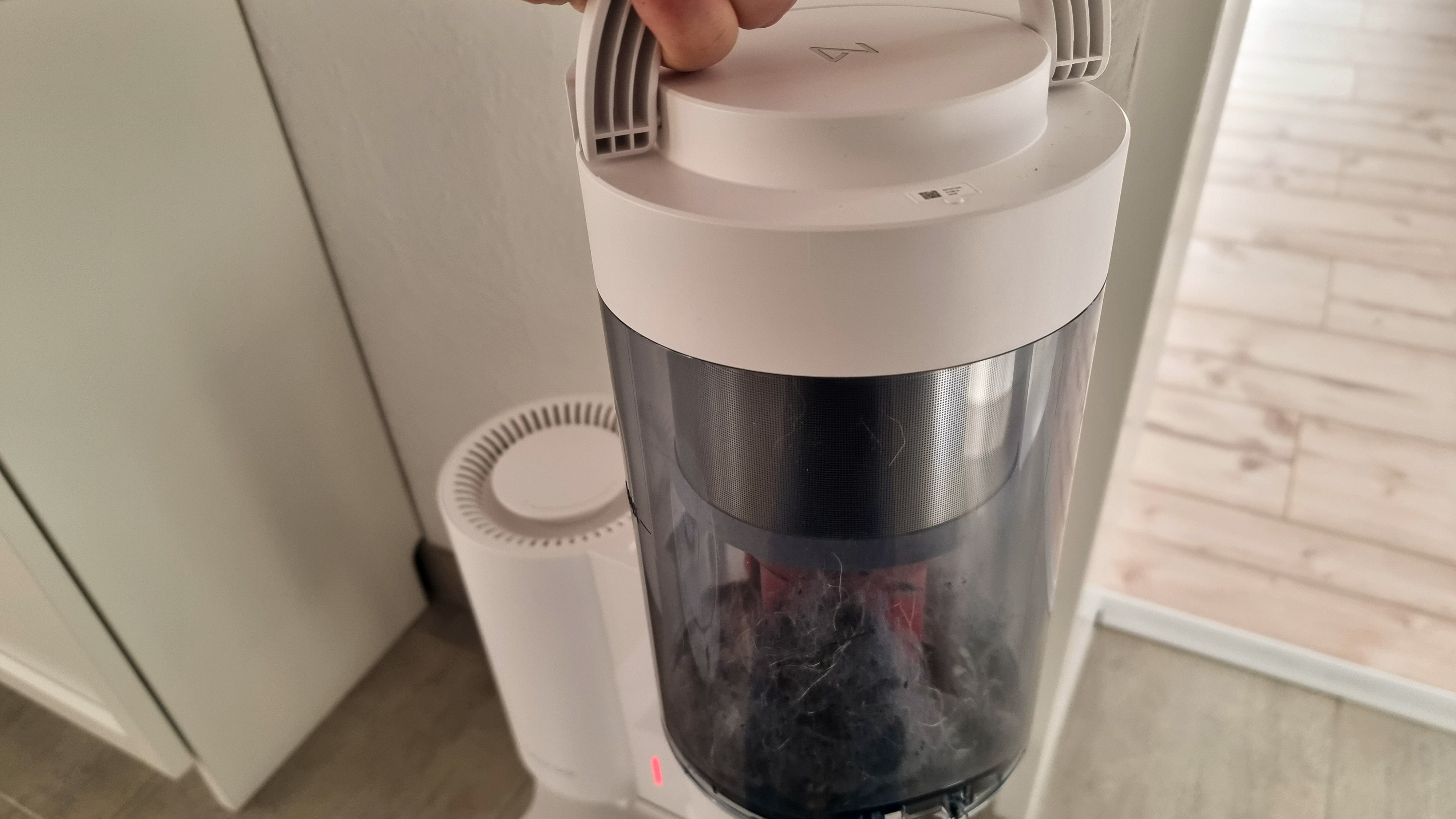 Selbst schwierige Inhalte wie Tierhaare, die sich im Staubbehälter des Roboters zu einem Pfropf zusammenballen, saugt die Station zuverlässig ab, höchstens minimale Rückstände verbleiben bei sehr vollem Behälter im Roboter. Bei Konkurrenzprodukten ist das nicht anders. Das Entleeren des großen Staubbehälters der Station muss nach Angaben des Herstellers nur noch alle sechs Wochen geschehen – natürlich hängt das aber sehr vom Reinigungsgebiet und der Häufigkeit der Reinigung ab. Ist es dann doch einmal so weit, lässt sich der große Behälter spielend leicht mittels Henkel nach oben entfernen. Über einen Mülleimer gehalten soll dann der Inhalt per Knopfdruck durch den aufschwingenden Deckel herausfallen – wie bei beutellosen Staubsaugern üblich können aber gerade Haarknäul im Inneren hängen bleiben, sodass man mit den Fingern nachhelfen muss. Wer das nicht möchte, sollte zum Beuteleinsatz und dem beiliegendem Staubbeute mit 3 Liter Fassungsvermögen greifen.