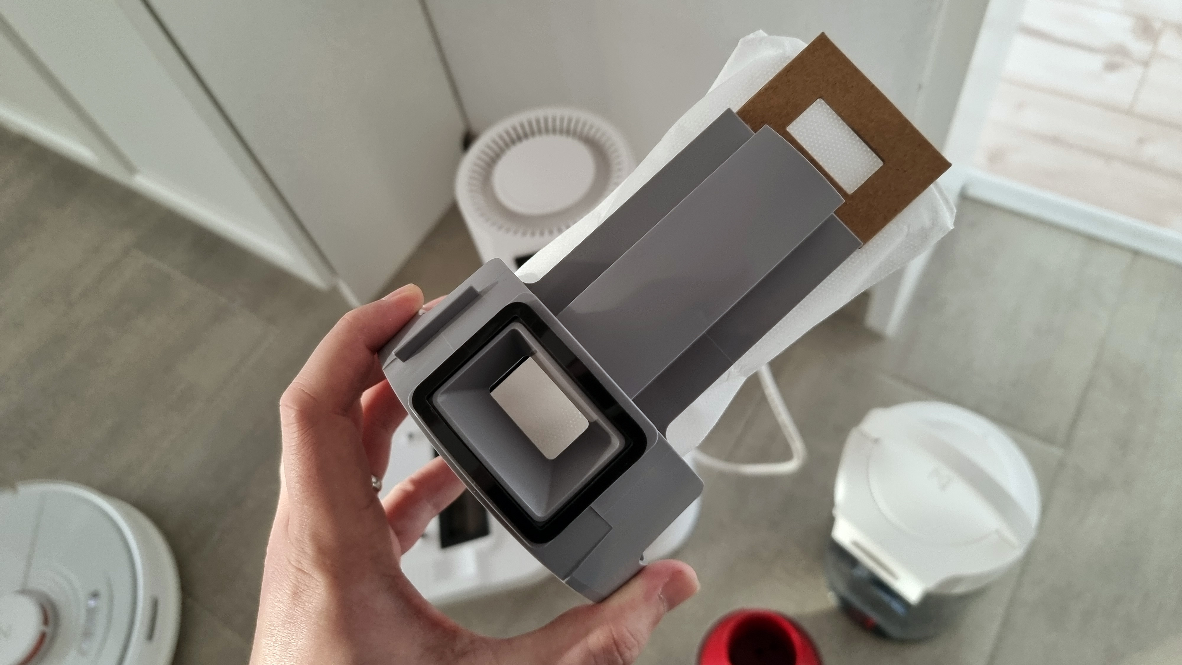 Die weitere Vorbereitung betrifft den Saugroboter. Hier gilt es, den ursprünglichen Staubbehälter gegen den neuen auszutauschen, der einen zusätzlichen seitlichen Lufteinlass hat. Außerdem muss im Inneren des Roboters bei entnommenem Staubbehälter eine kleine Kunststoffklappe aufgehebelt und entfernt werden, durch die Luft einströmen kann. Die eigentliche Absaugung des Schmutzes erfolgt dann auf dem gleichen Weg, wie er in den Roboter gekommen ist: über die Hauptbürstenöffnung. Zuletzt sollten sich Nutzer Gedanken über die Nutzung des beiliegenden Staubbeutels samt Aufsatz machen. Die Absaugstation kann nämlich Staub beutellos dank Zyklontechnologie wie beim Akkustaubsauger Roborock H6 Adapt (Vergleich) oder im Beutel einfangen – eben wie der Nachfolger des H6, der Roborock H7 (Testbericht), der ebenfalls beides kann. Der Beutel dürfte vor allem für Allergiker interessant sein, alle anderen sparen ein Stück weit Geld und schonen die Umwelt.